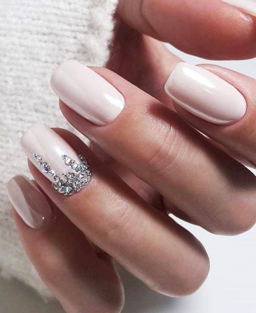 Как дополнить нюдовое покрытие, чтобы на очень коротких ногтях оно по-прежнему выглядело аккуратно, но в то же время более привлекательно? Используйте в маникюре маленькие наклейки в форме драгоценных камней или небольшие стразы.