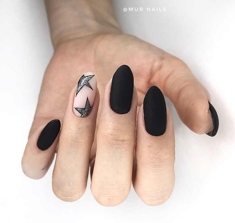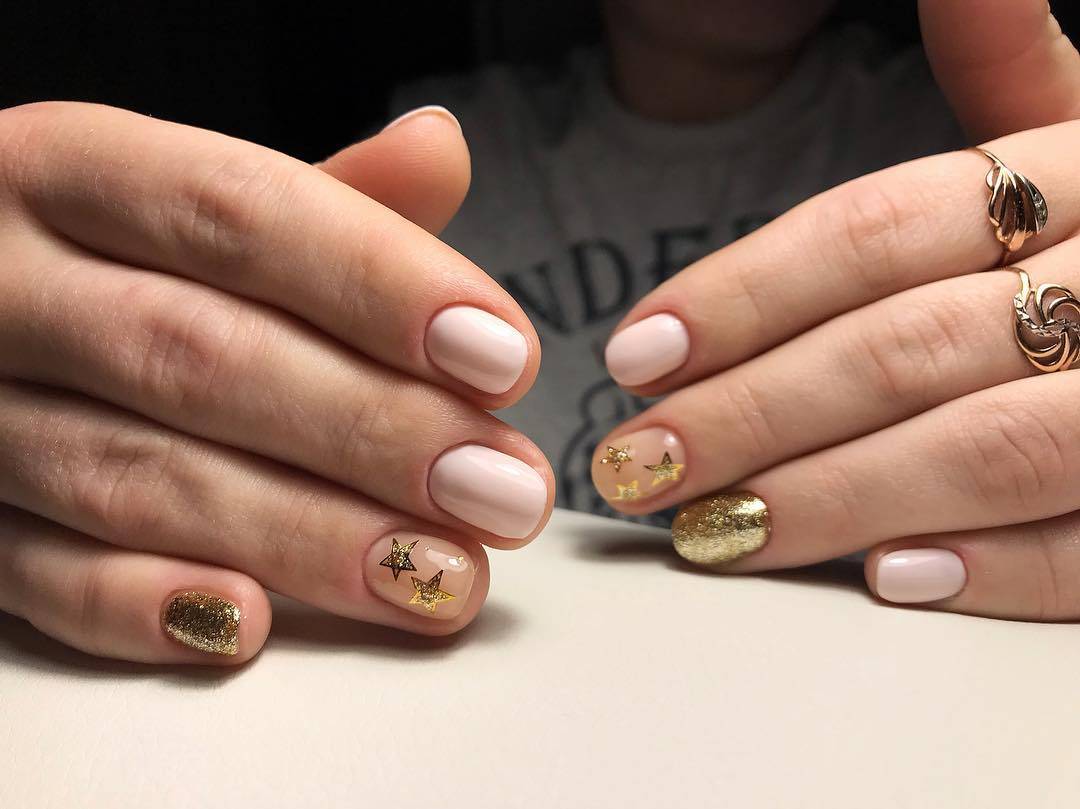 Украсьте один-два ногтя на одной или обеих руках звездами, прорисованными золотым блеском. Для разнообразия блестками можно покрыть целый ноготь или только его часть по диагонали.