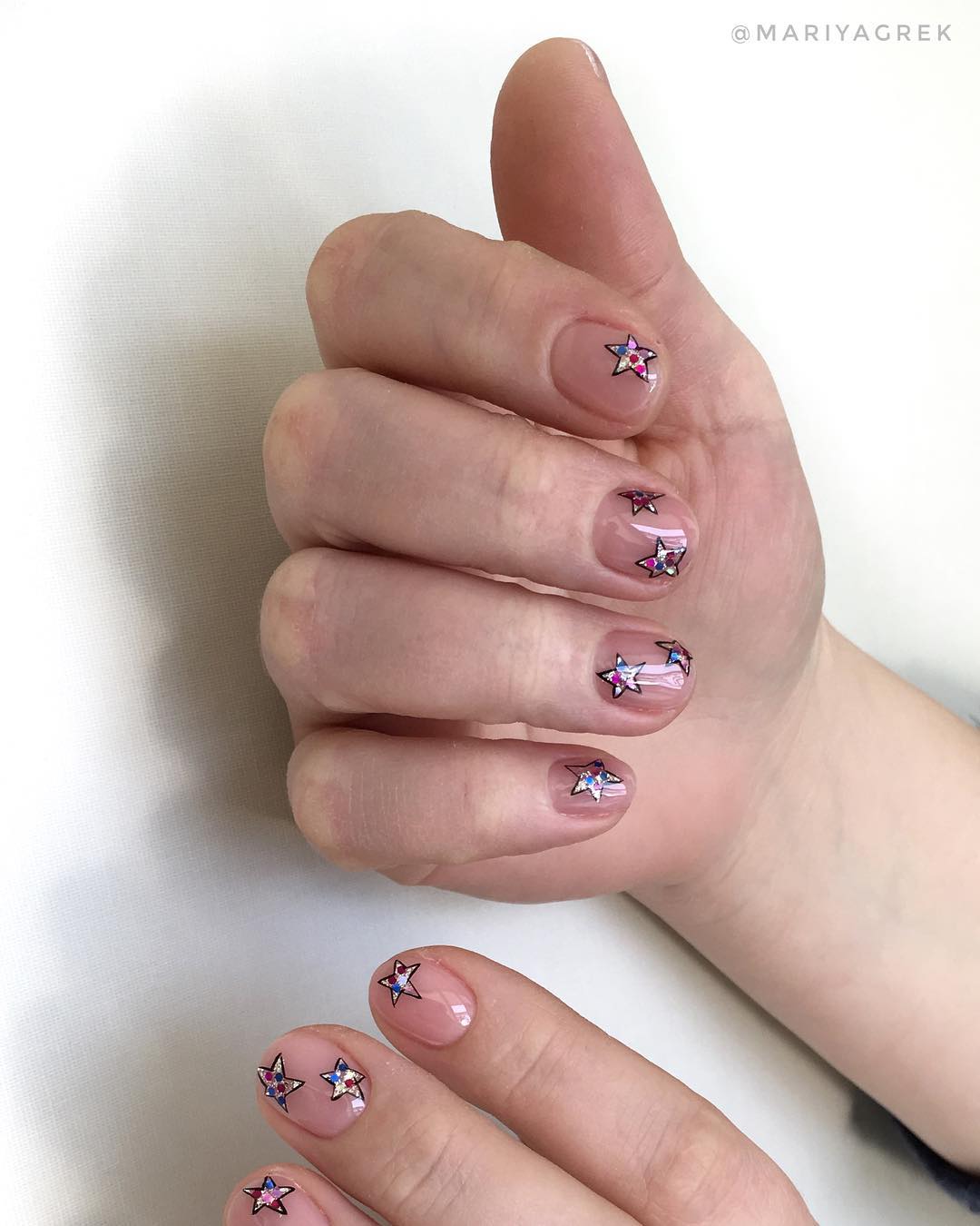 Искусственные звездочки с глиттером и присыпкой лучше всего накладывать на ногти при помощи специальных инструментов или дотса
