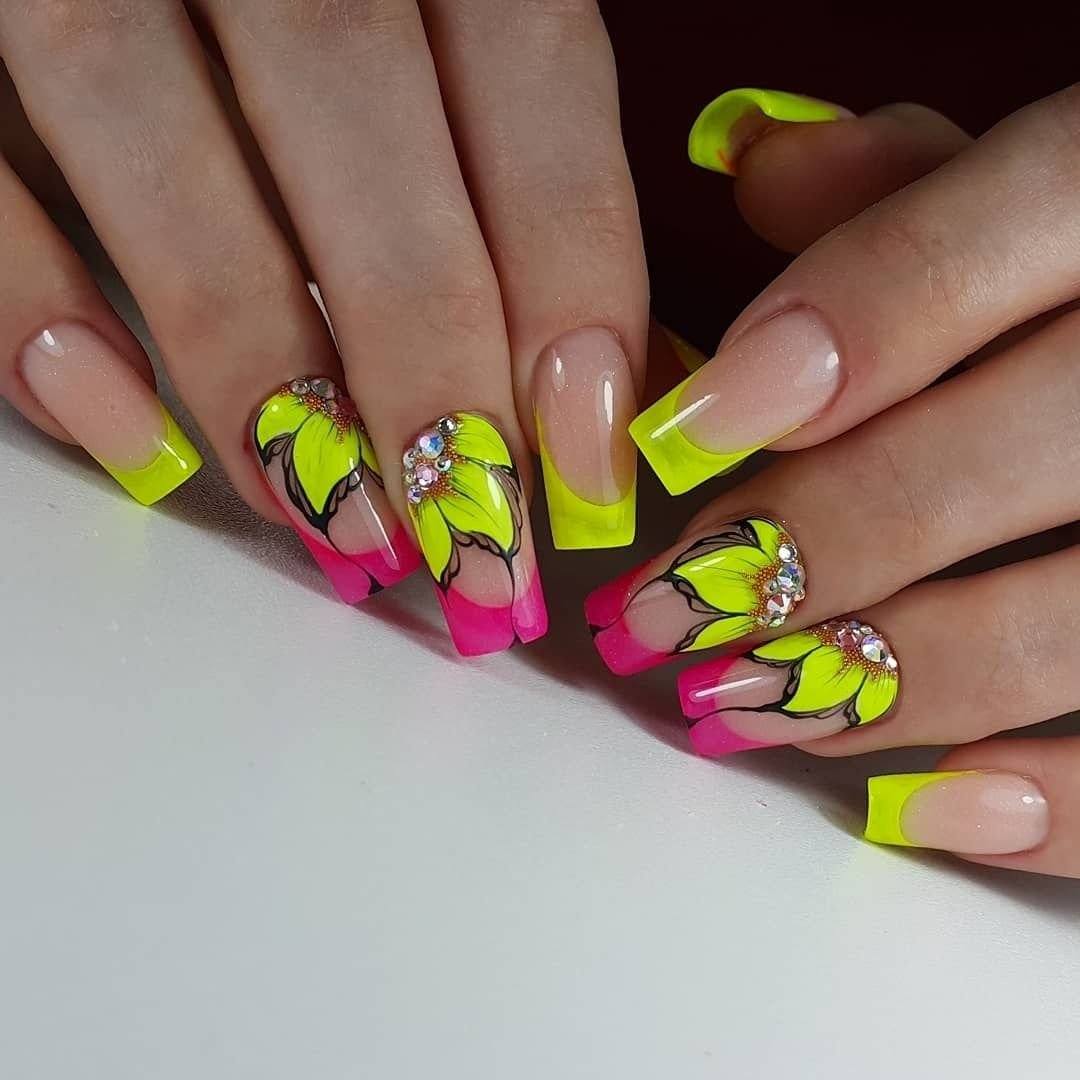 Цветы, крупные листья, веточки и даже целые композиции часто украшают ноготки модниц. В летнем сезоне тенденция все также актуальна. Тем более, что французский маникюр — прекрасная основа для такого дизайна. Чаще всего данный рисунок наносят в ярких оттенках, чтобы он был своеобразным акцентом. Декор в виде блесток, страз или фольги — прекрасное дополнение, которое уместно в любом случае. При желании можно сочетать флористический с геометрическим рисунком. Чаще всего они не слишком крупные и смотрятся достаточно лаконично. Поэтому модницы выбирают его даже на каждый день.