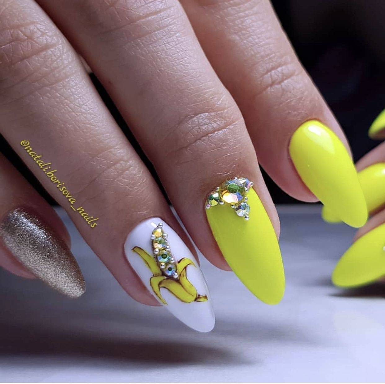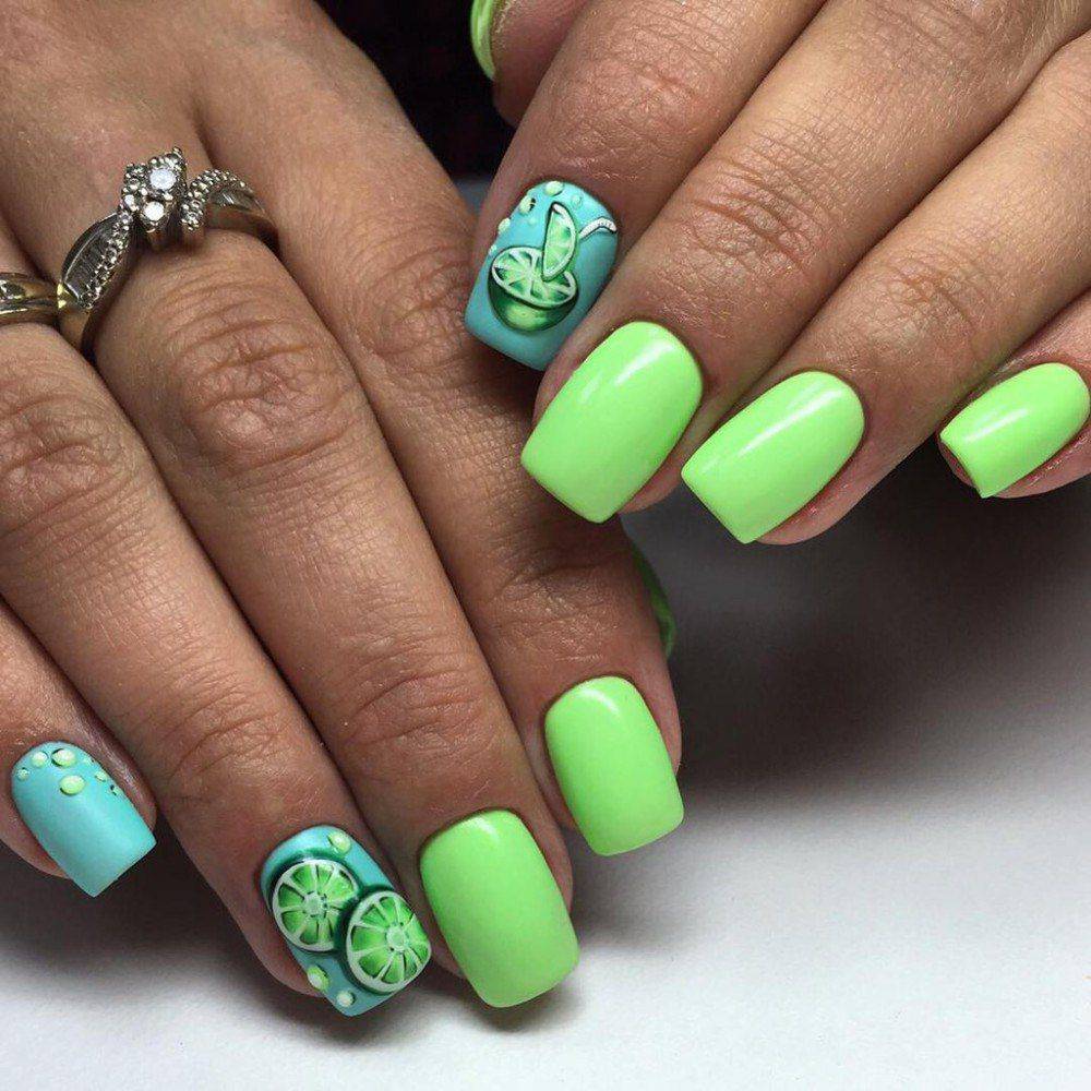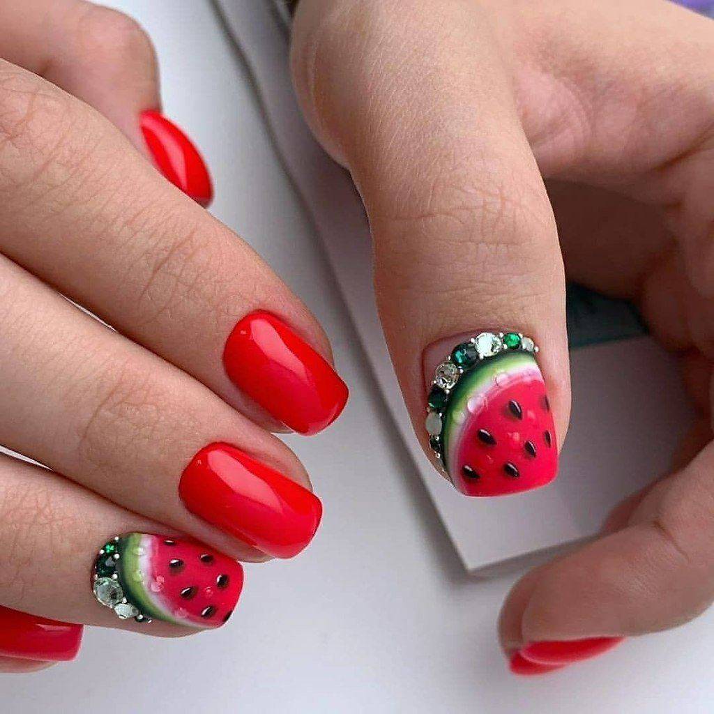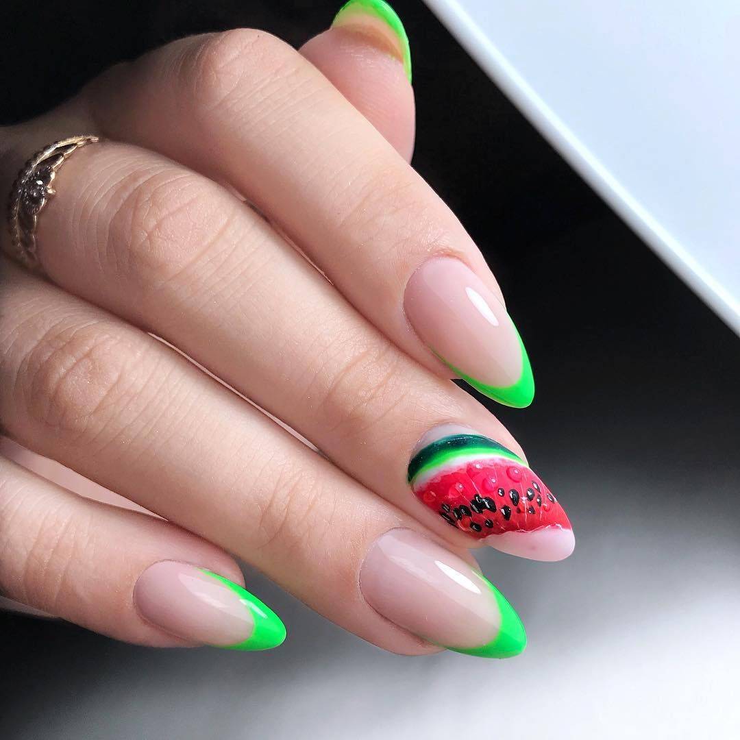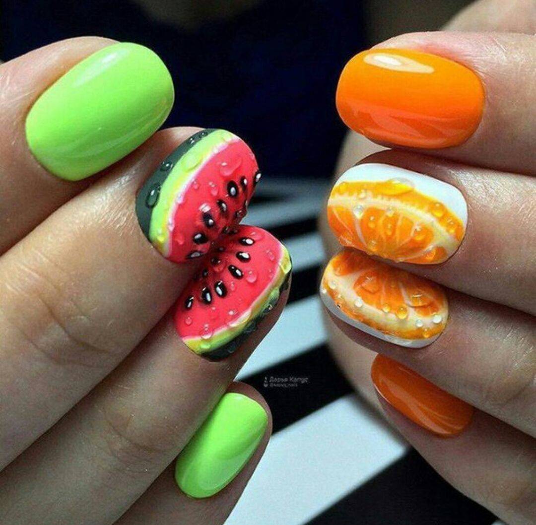 В ярком маникюре, помимо оттенков, может быть еще несколько акцентов. Это могут быть узоры в виде полосок, дымки, стразов, геометрического декора и т.д. Яркие оттенки помогают создать выразительные и заметные нейл-арты. Пример такого красивого дизайна – маникюр с фруктами. Дизайн выглядит очень ярко и красиво, особенно если фрукты выполнены в разрезе.