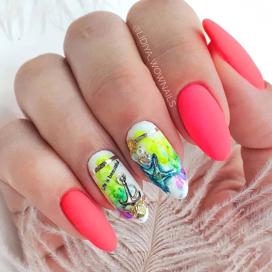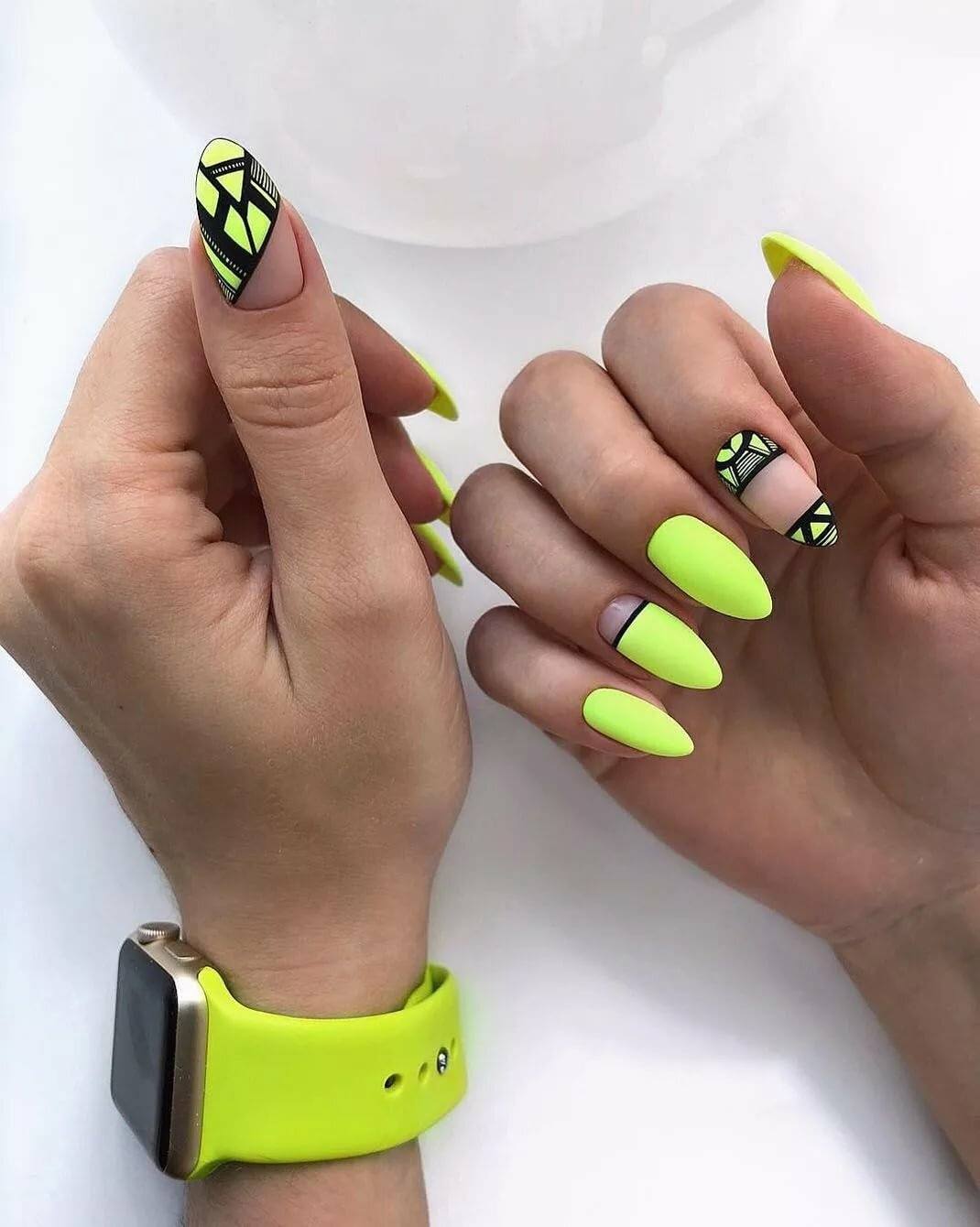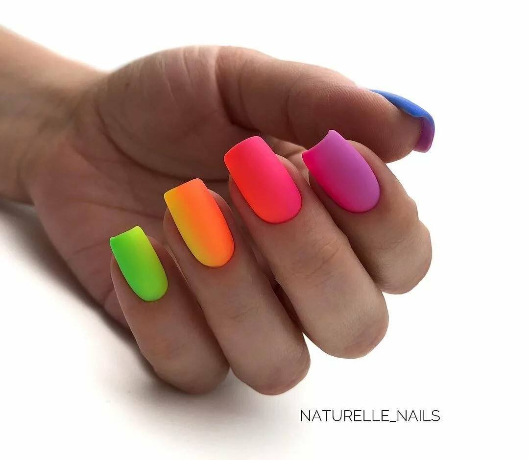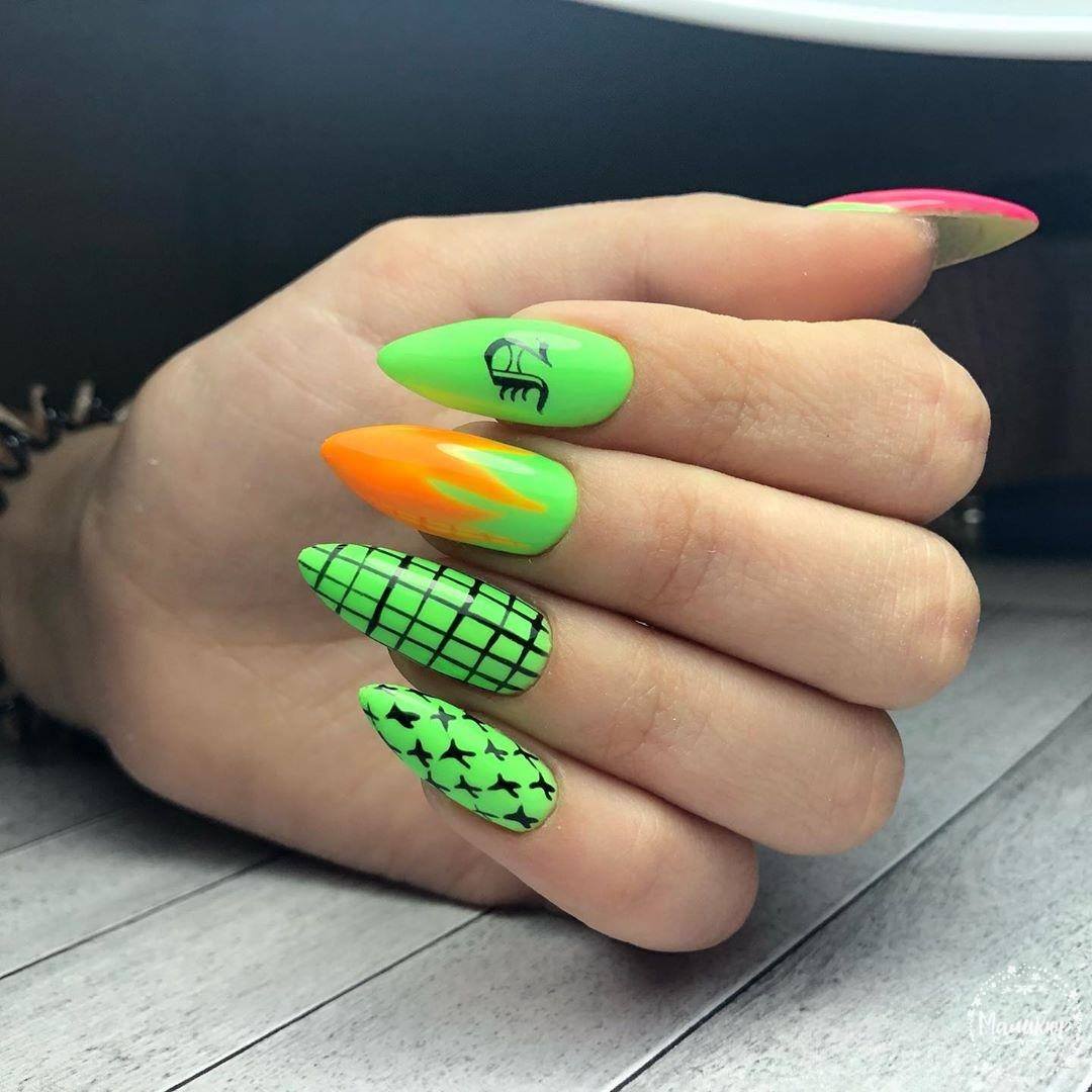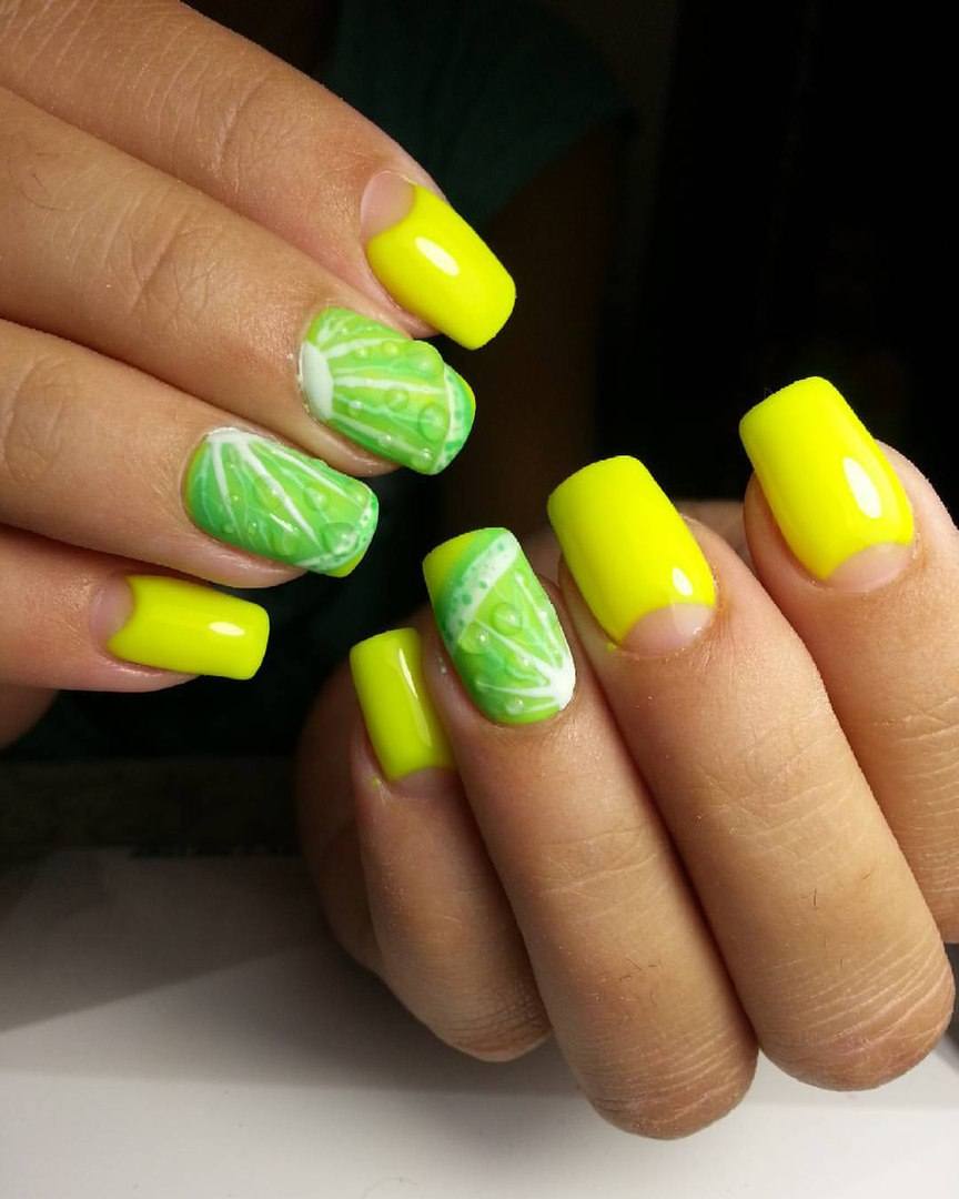 В ярком маникюре, помимо оттенков, может быть еще несколько акцентов. Это могут быть узоры в виде полосок, дымки, стразов, геометрического декора и т.д. Яркие оттенки помогают создать выразительные и заметные нейл-арты. Пример такого красивого дизайна – маникюр с фруктами. Дизайн выглядит очень ярко и красиво, особенно если фрукты выполнены в разрезе.