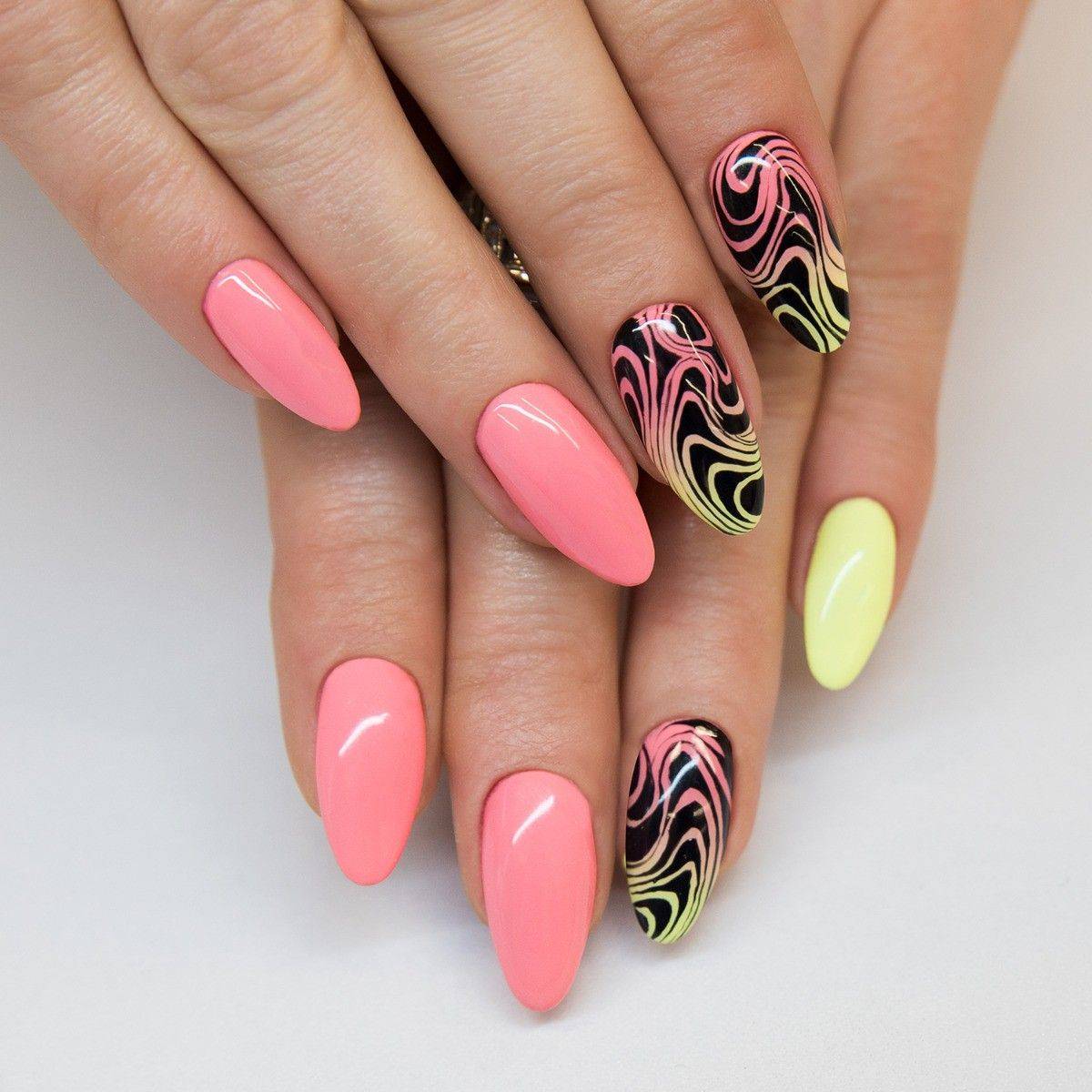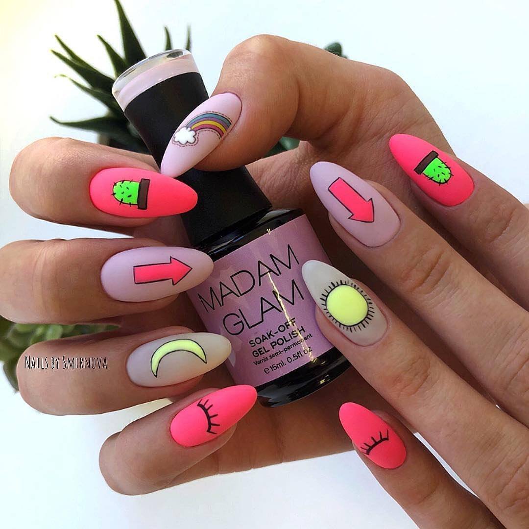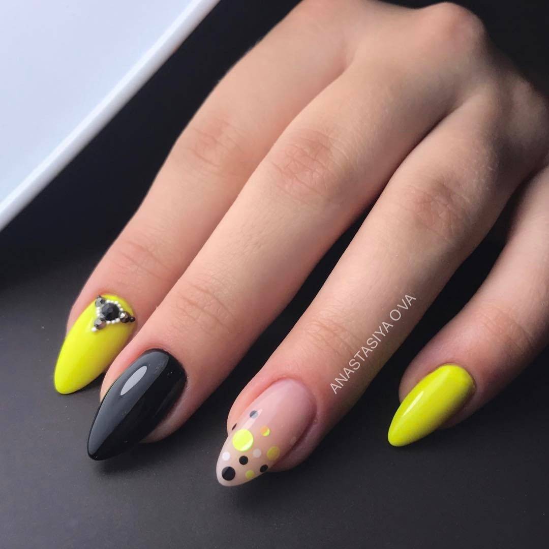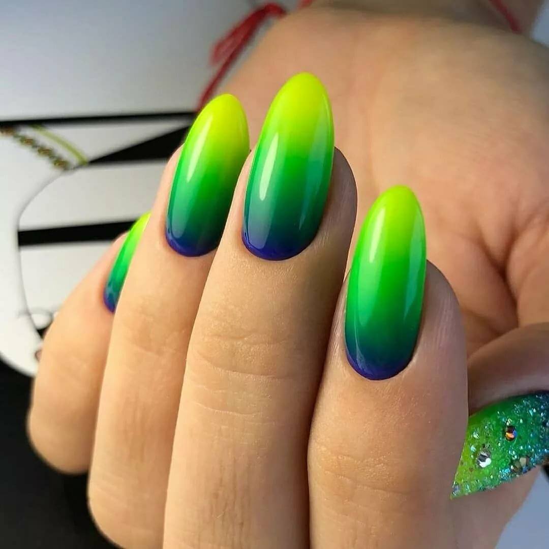 В ярком маникюре, помимо оттенков, может быть еще несколько акцентов. Это могут быть узоры в виде полосок, дымки, стразов, геометрического декора и т.д. Яркие оттенки помогают создать выразительные и заметные нейл-арты. Пример такого красивого дизайна – маникюр с фруктами. Дизайн выглядит очень ярко и красиво, особенно если фрукты выполнены в разрезе.