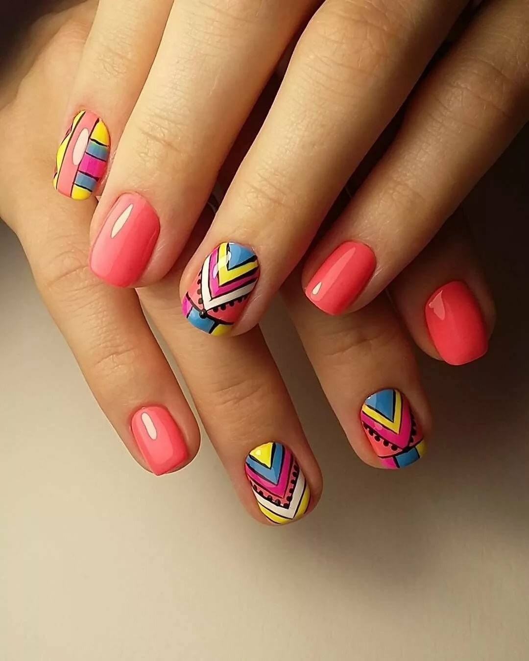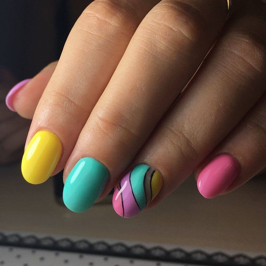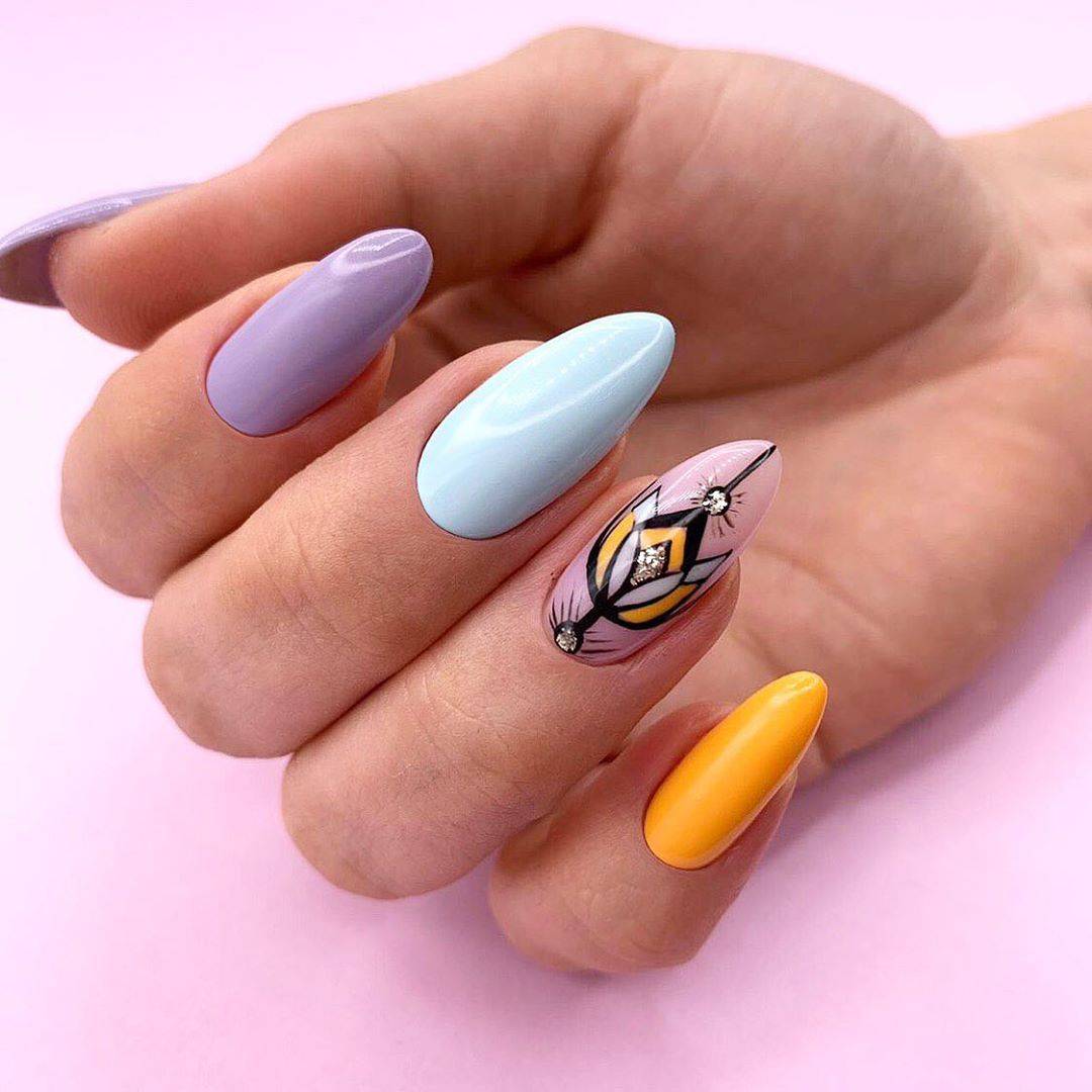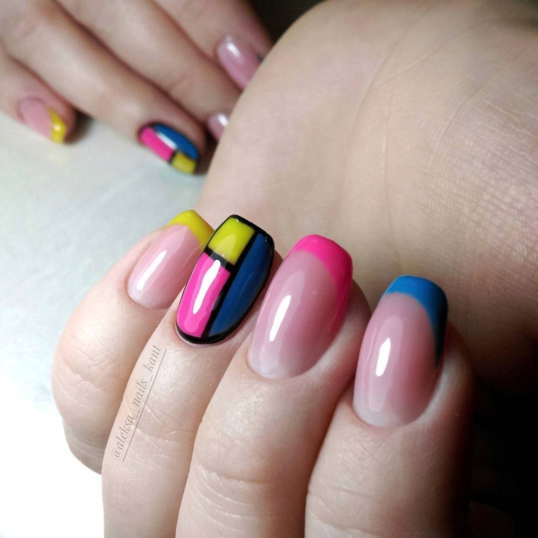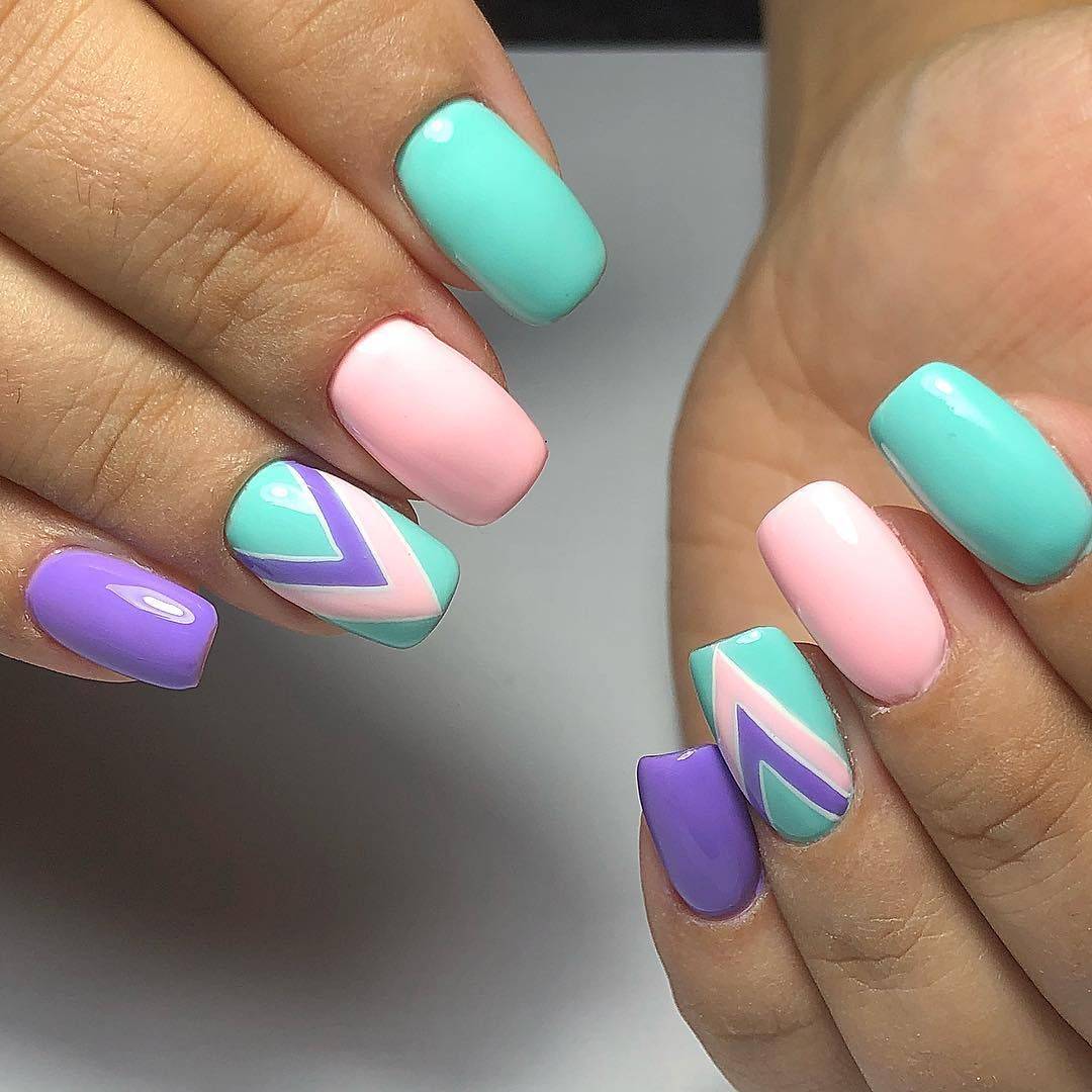 Оригинально смотрится маникюр с геометрическими фигурами, окрашенными в разные оттенки. Выполнять такой узор лучше на 1-2 пальцах руки, чтобы маникюр не выглядел слишком сложно. Чтобы геометрия смотрелась лаконичнее и нежнее, используйте полоски разного цвета, прорисованные по направлению роста ногтей.