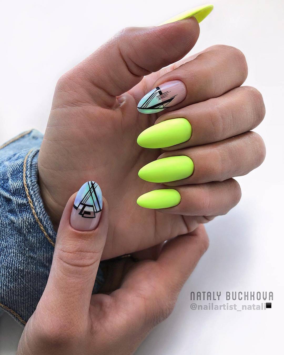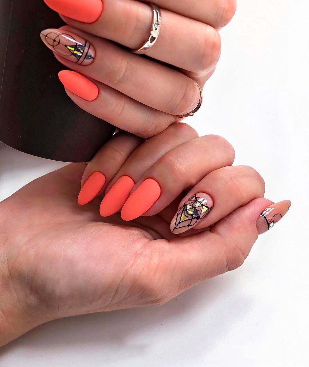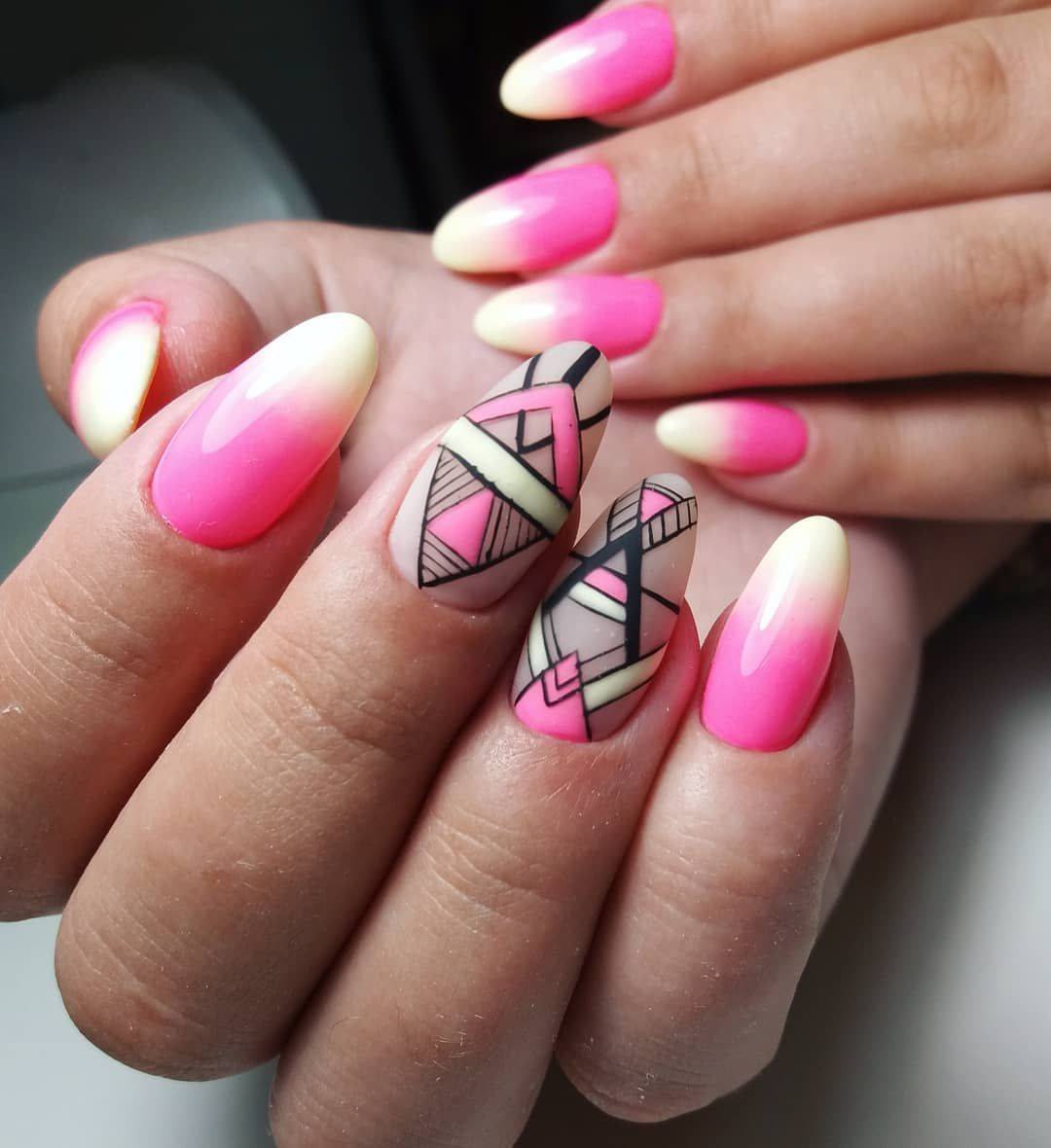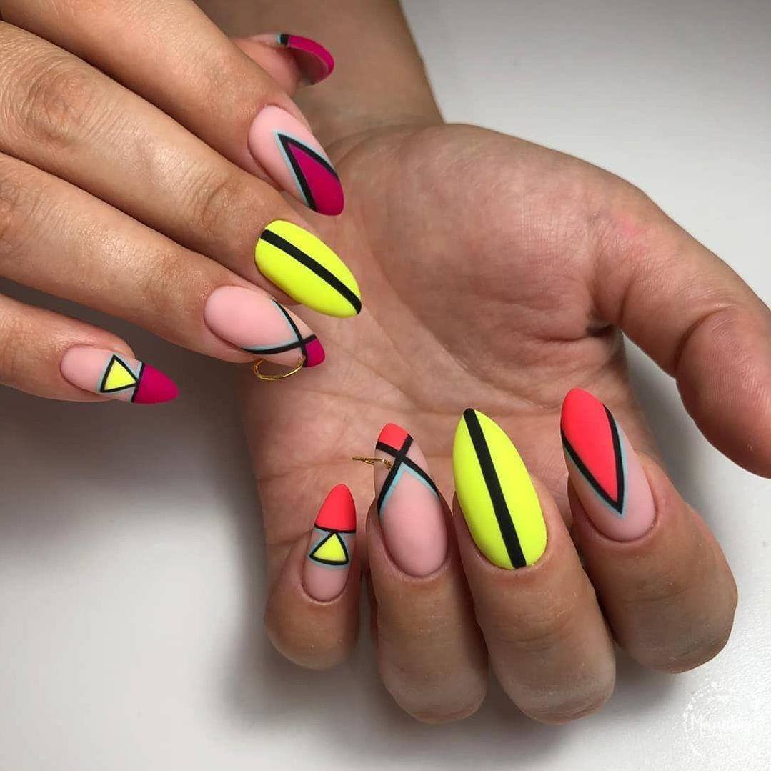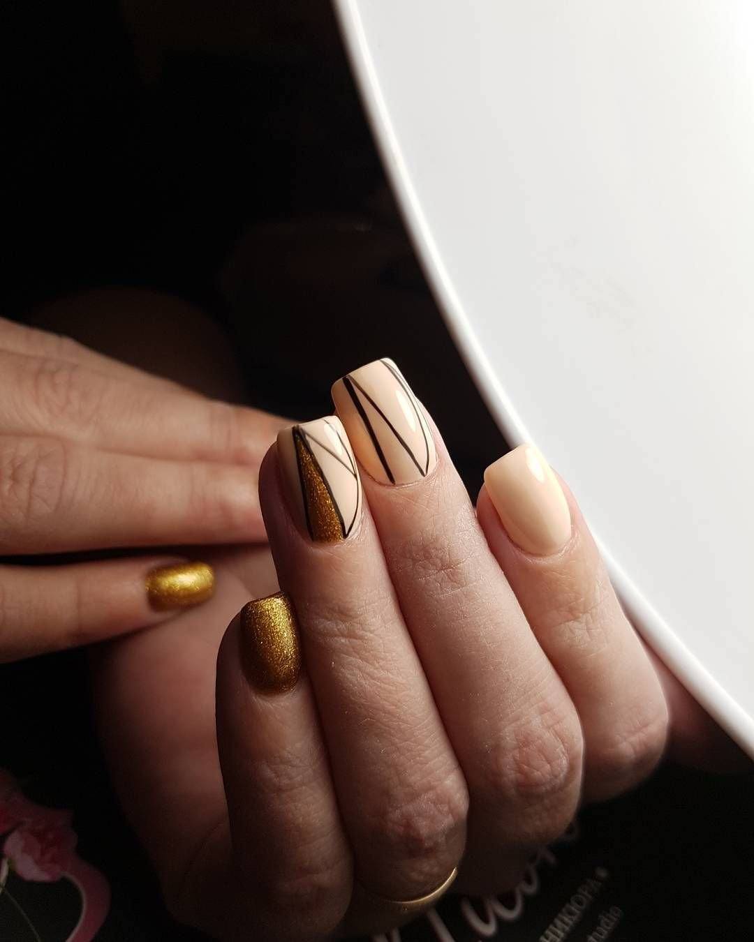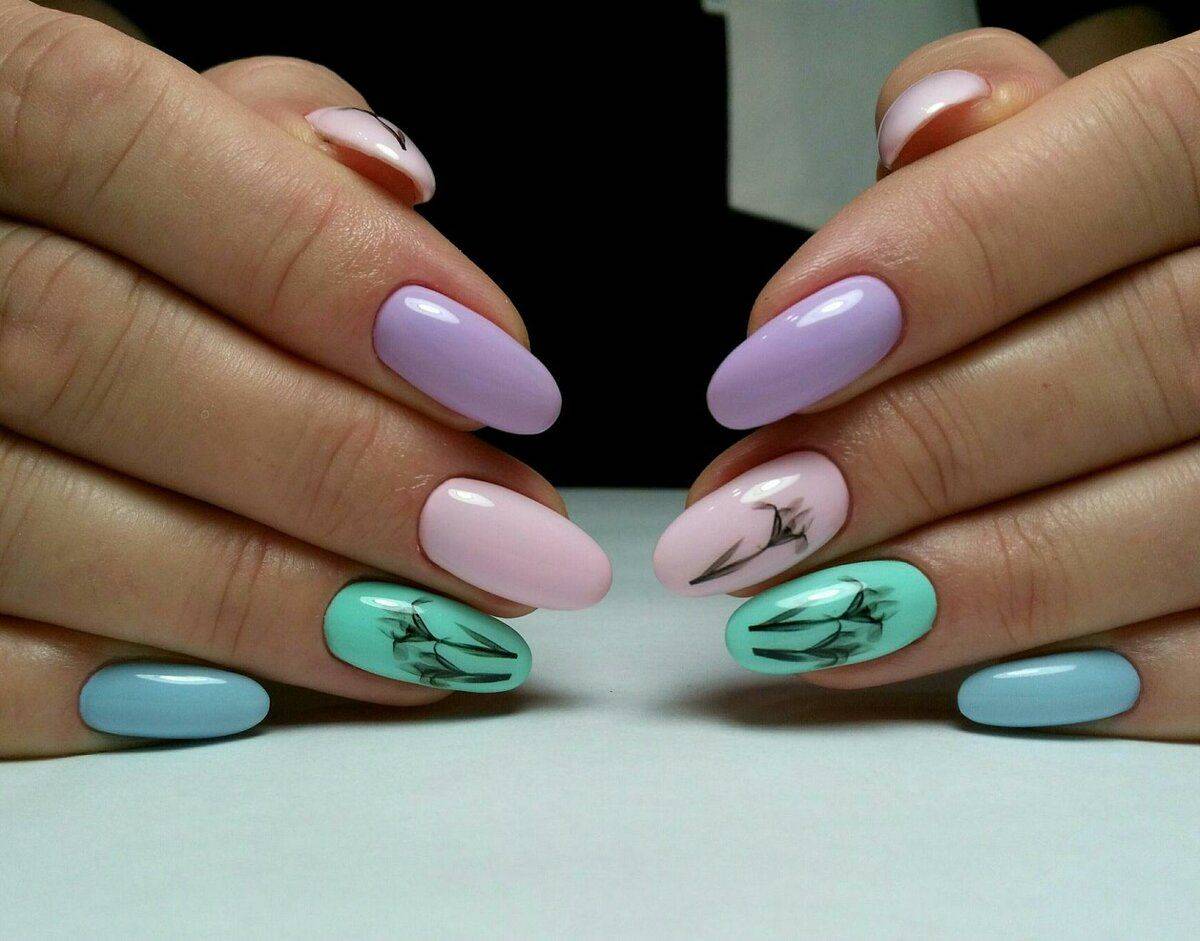Оригинально смотрится маникюр с геометрическими фигурами, окрашенными в разные оттенки. Выполнять такой узор лучше на 1-2 пальцах руки, чтобы маникюр не выглядел слишком сложно. Чтобы геометрия смотрелась лаконичнее и нежнее, используйте полоски разного цвета, прорисованные по направлению роста ногтей.