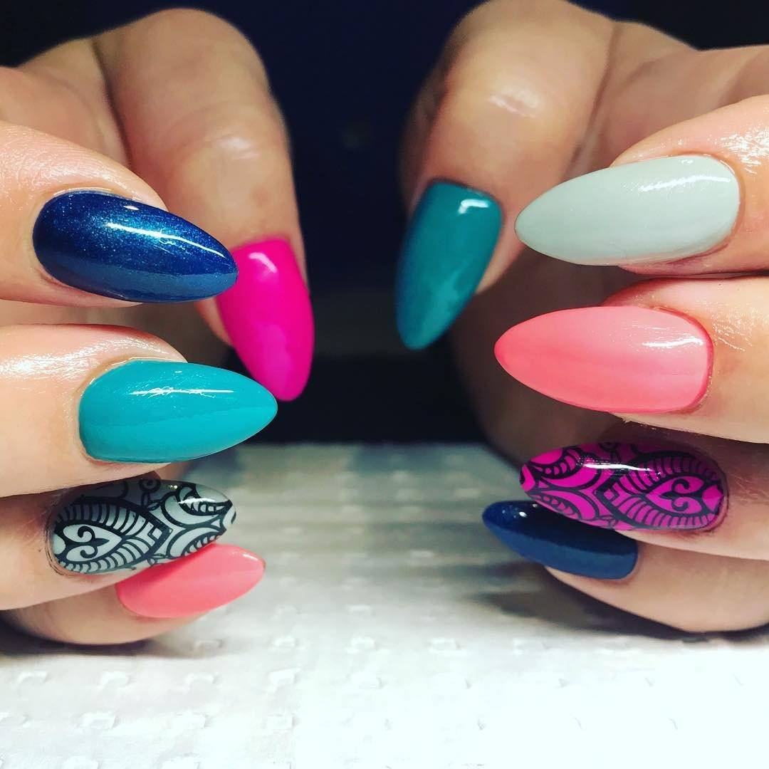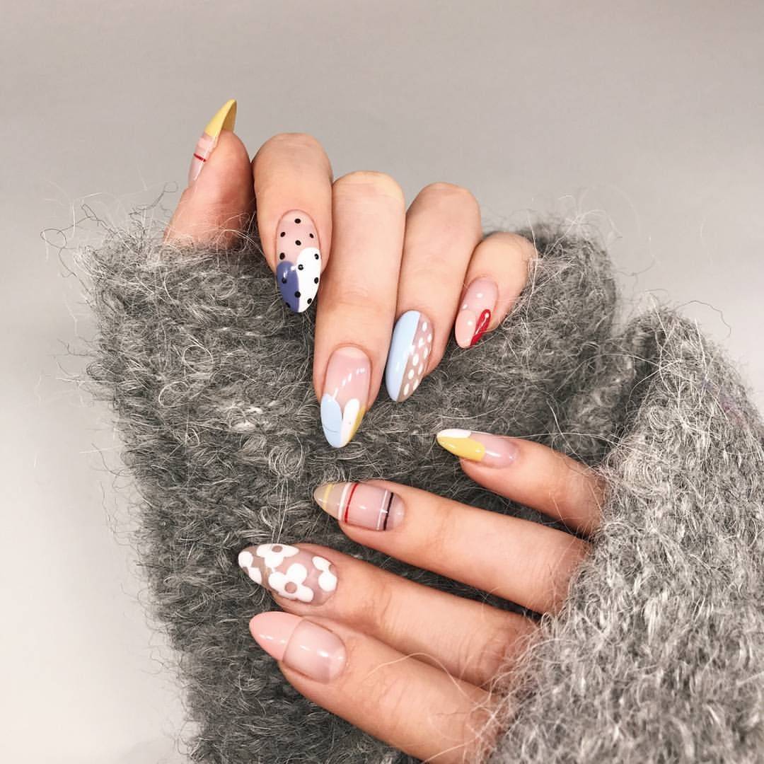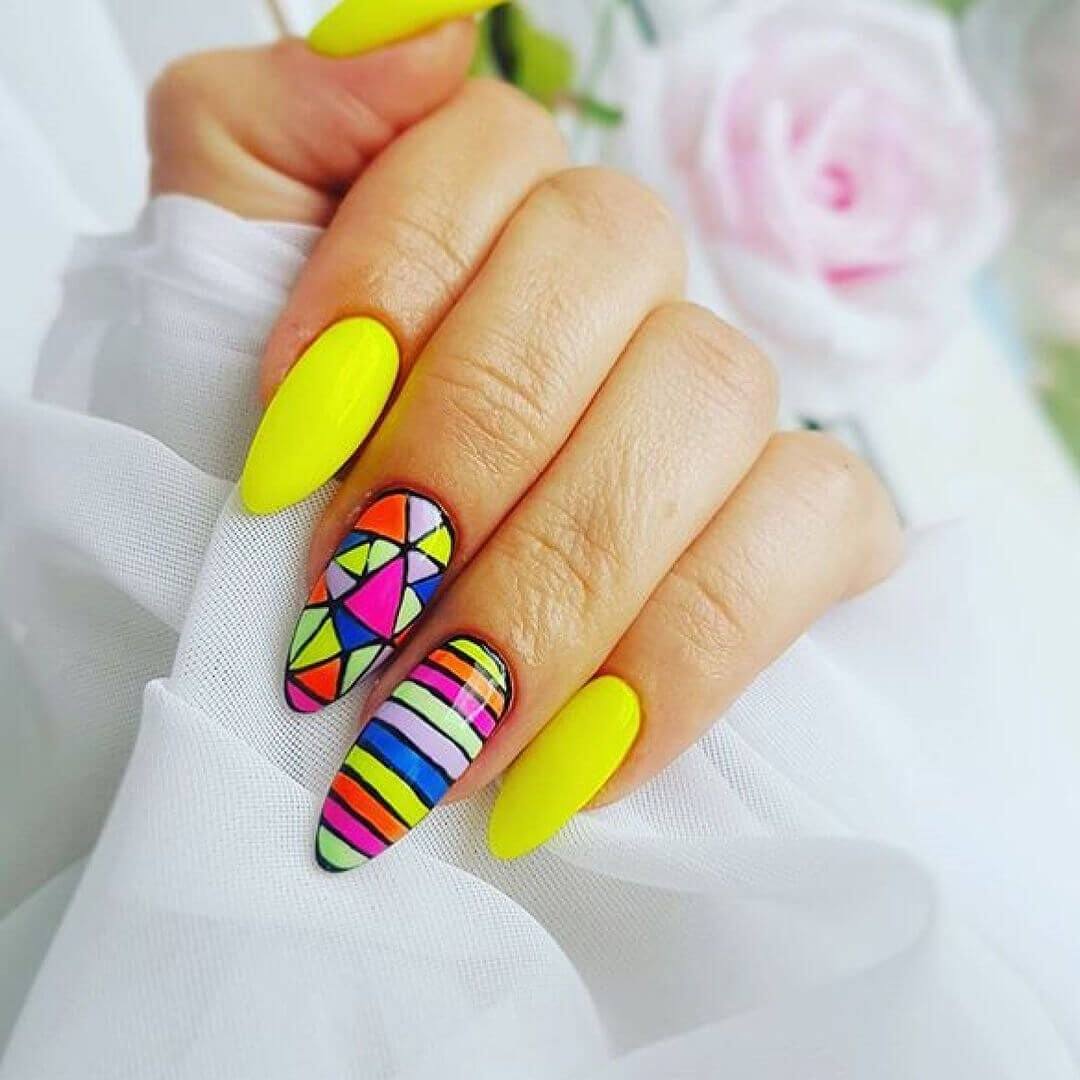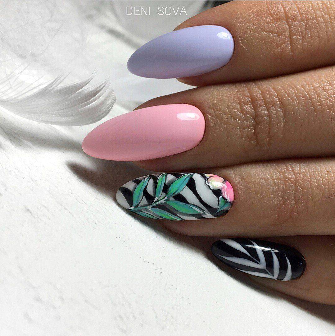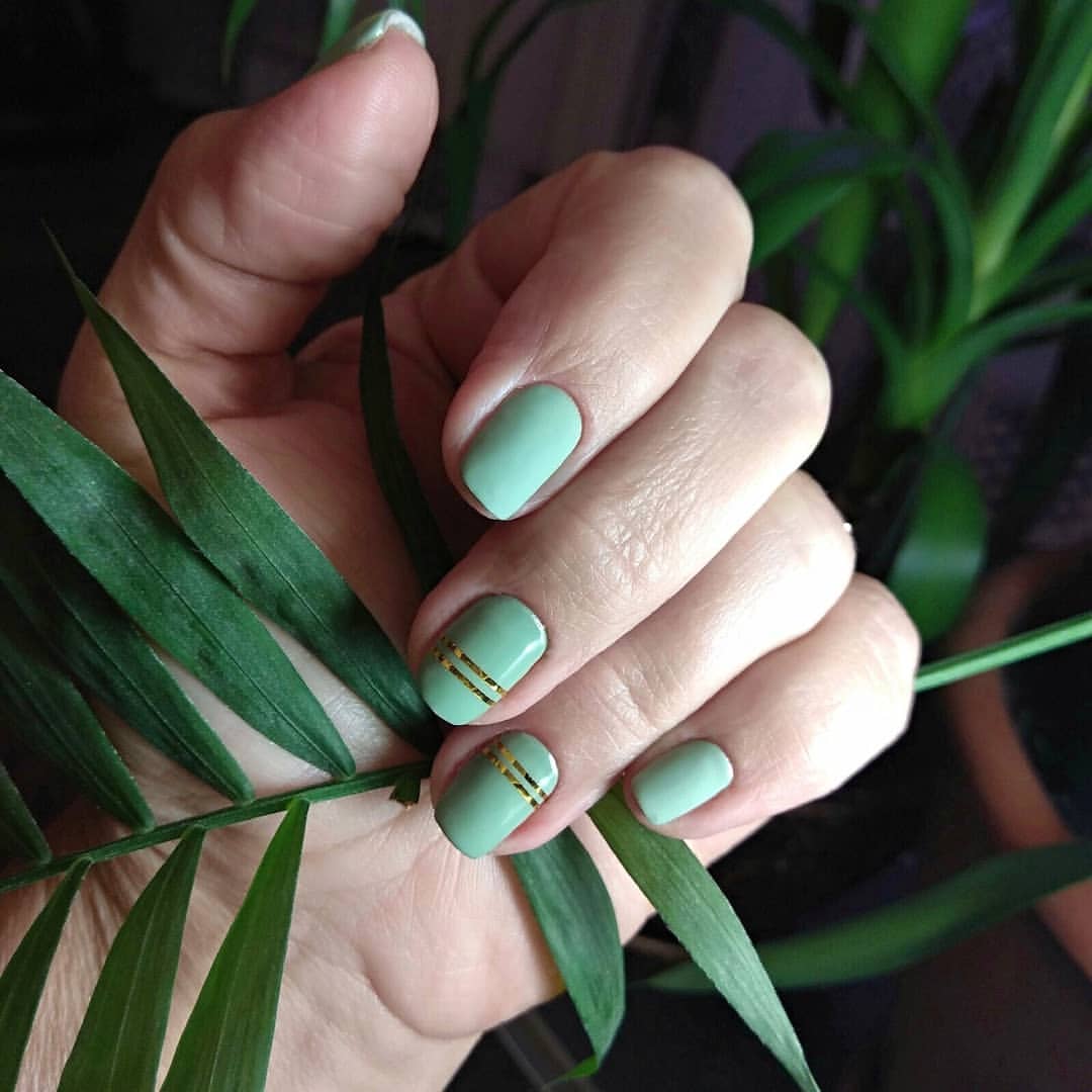 Оригинально смотрится маникюр с геометрическими фигурами, окрашенными в разные оттенки. Выполнять такой узор лучше на 1-2 пальцах руки, чтобы маникюр не выглядел слишком сложно. Чтобы геометрия смотрелась лаконичнее и нежнее, используйте полоски разного цвета, прорисованные по направлению роста ногтей.
