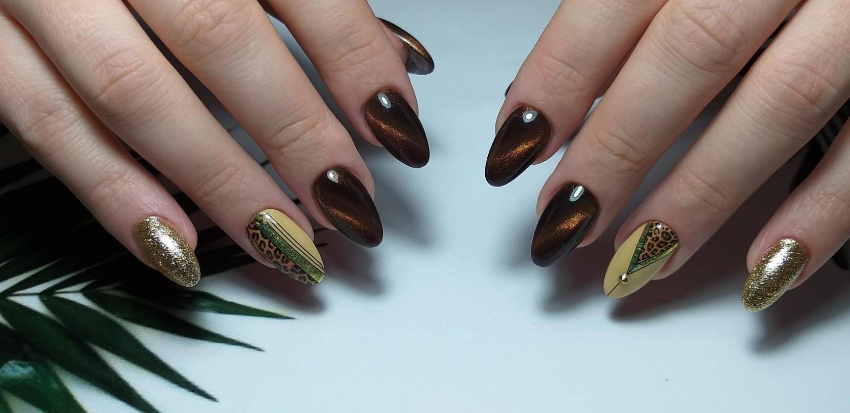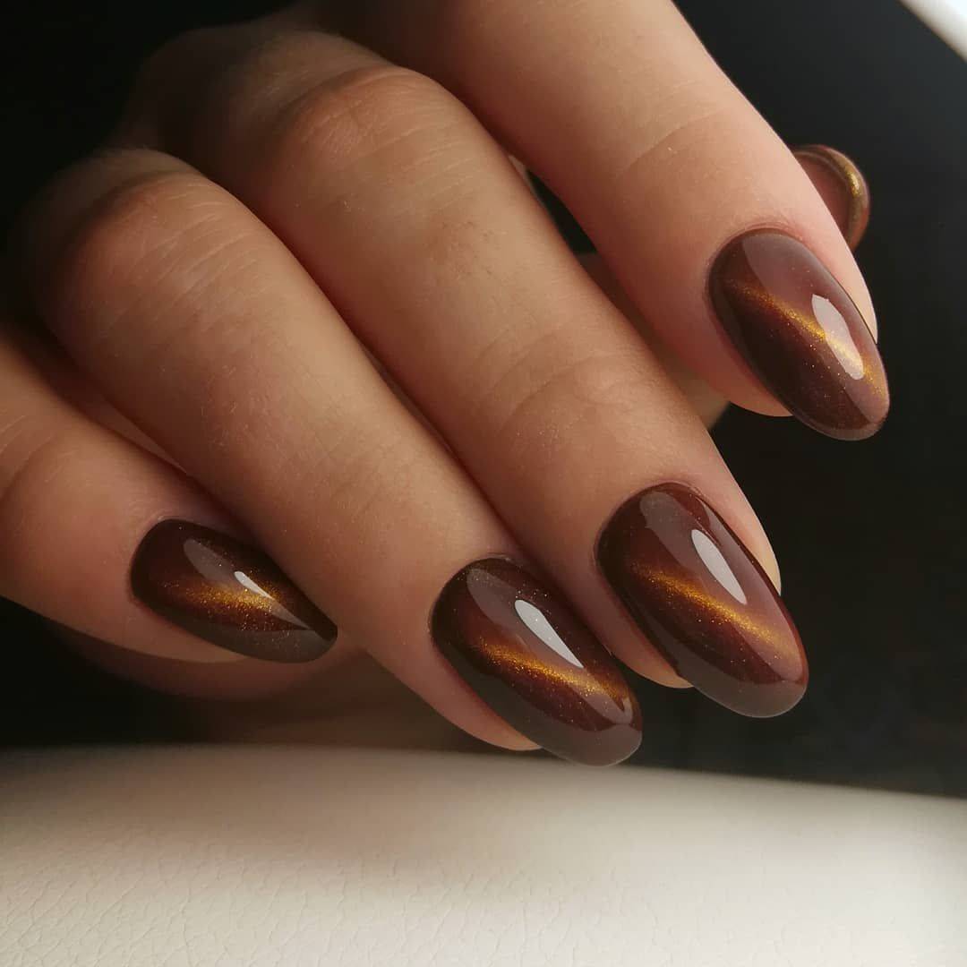 Новые тенденции осуществления стильного и роскошного маникюра 2020 года могут сочетаться с различными цветами лака. В этот перечень входит и разнообразная палитра коричневого цвета. Особенно ценится выполнение кошачьего глаза на коричневой основе. Мастера маникюра отмечают несколько техник выполнения ноготков в данной технике: