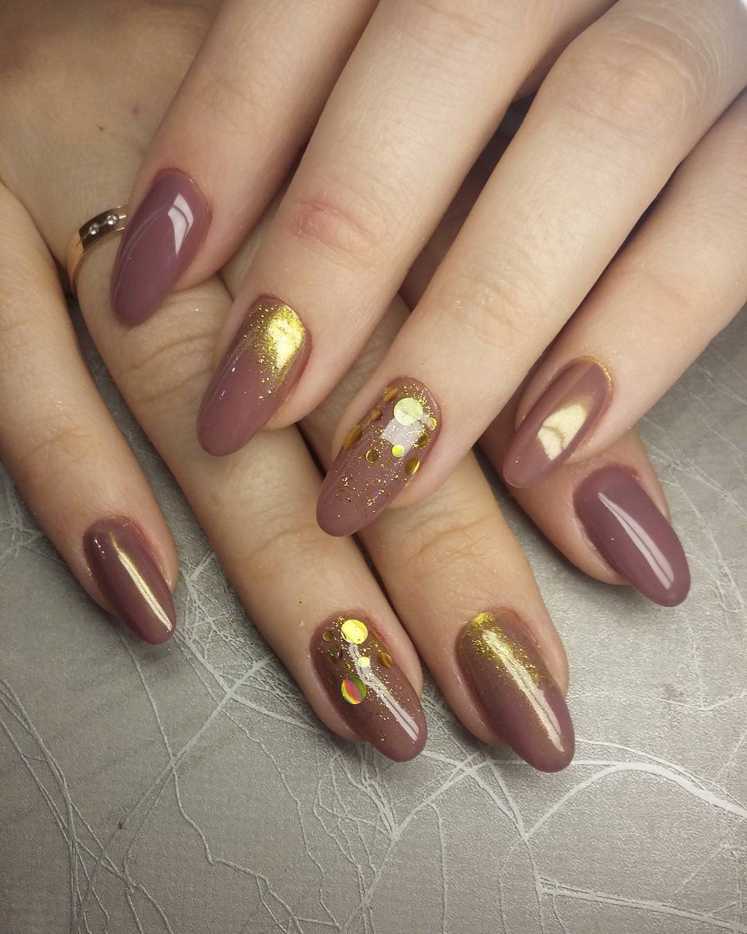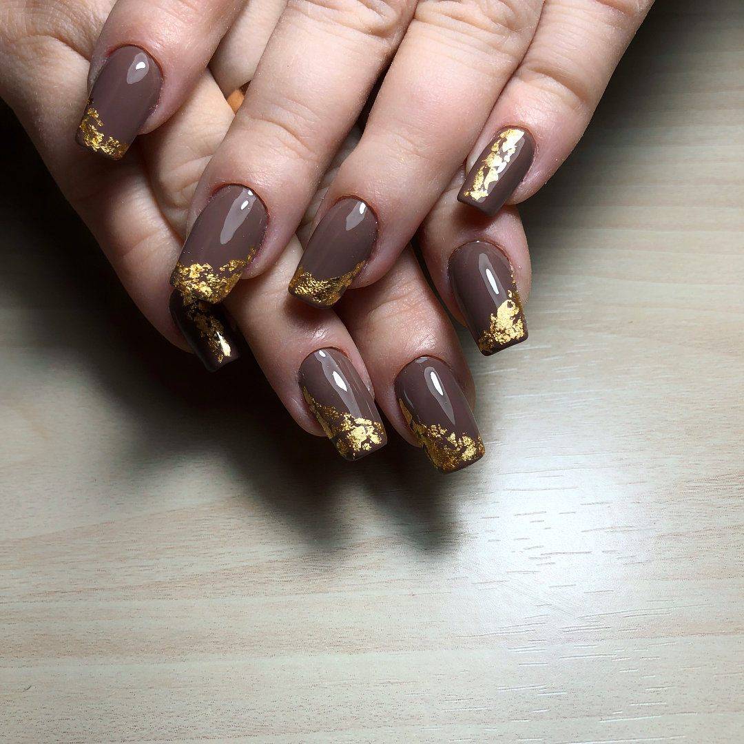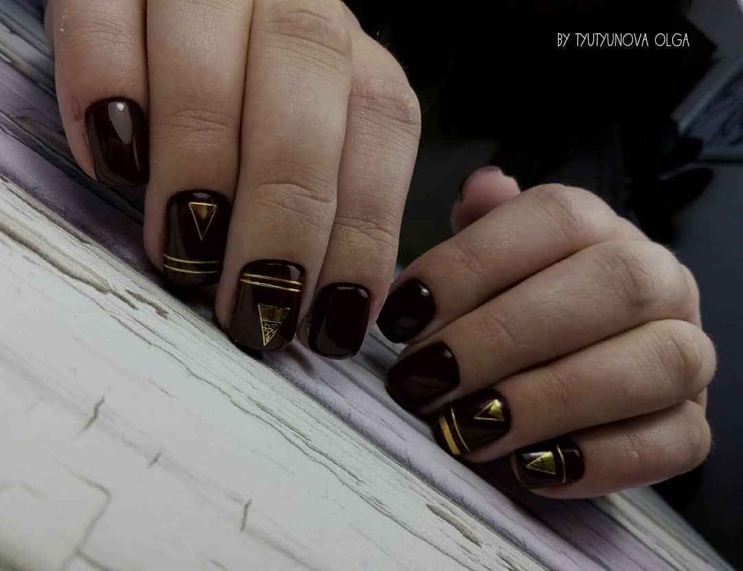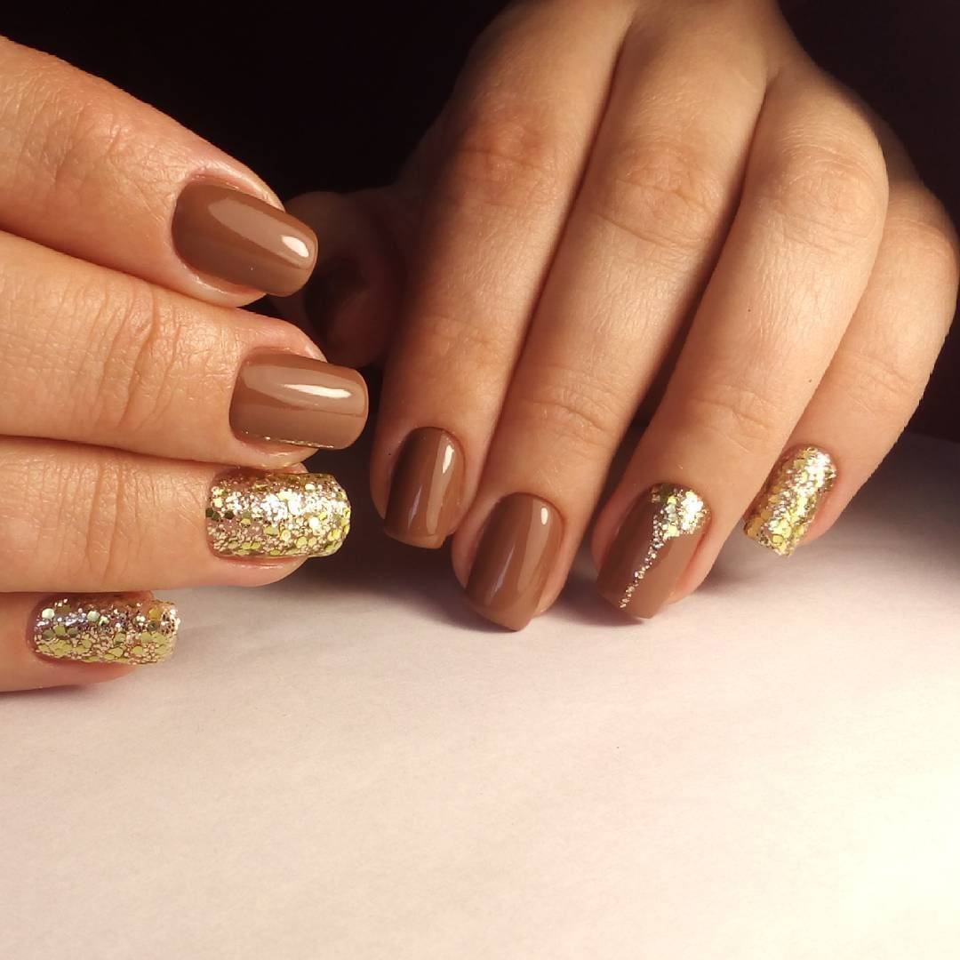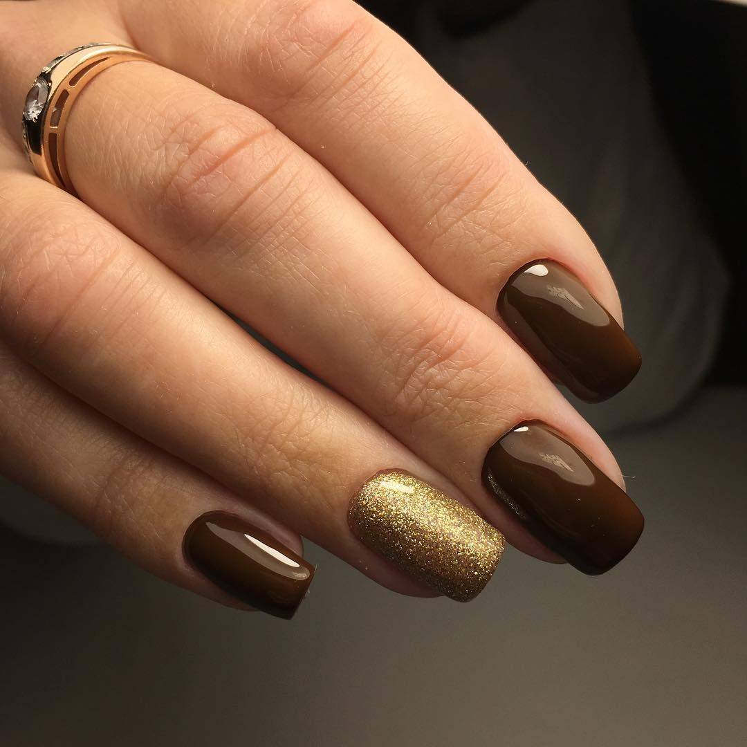 Наиболее дорогая и праздничная композиция сочетания коричневого цвета – это сочетание коричневого с золотом. Для декора вечернего маникюра мастера нейл-арта используют золотую фольгу, глиттер, конфетти, полноценное покрытие, создающее вид металлического глянца.