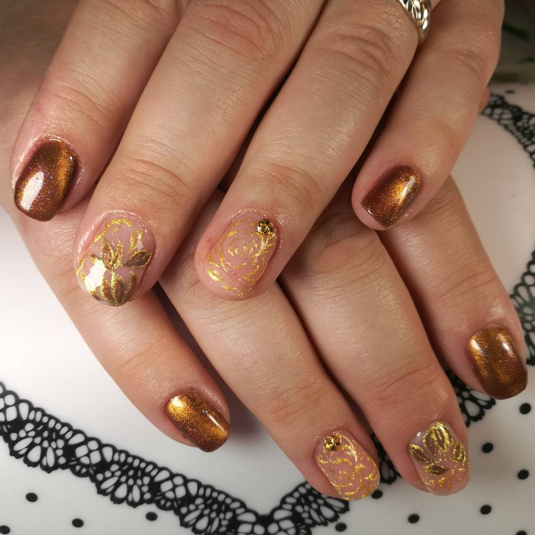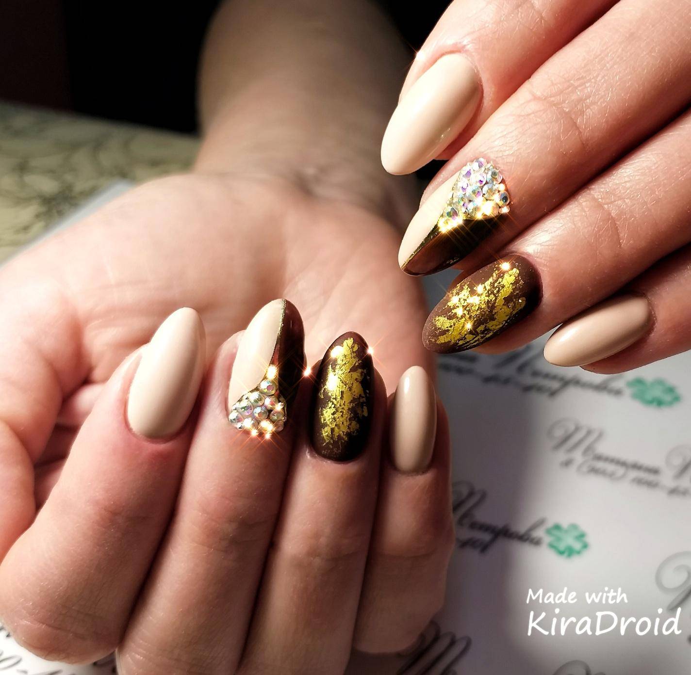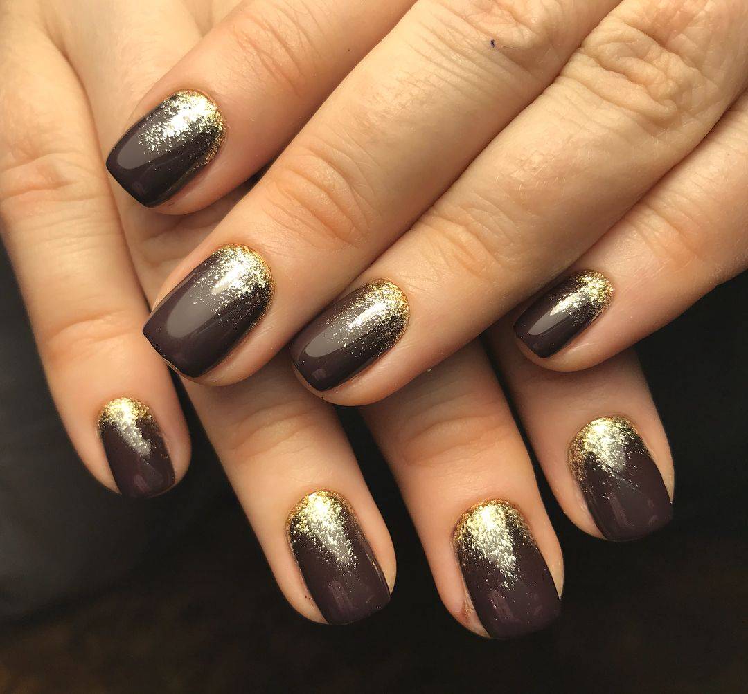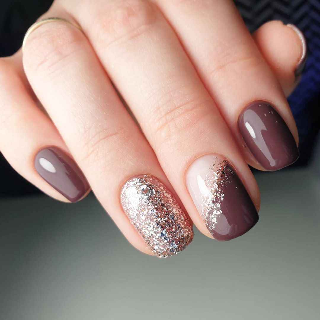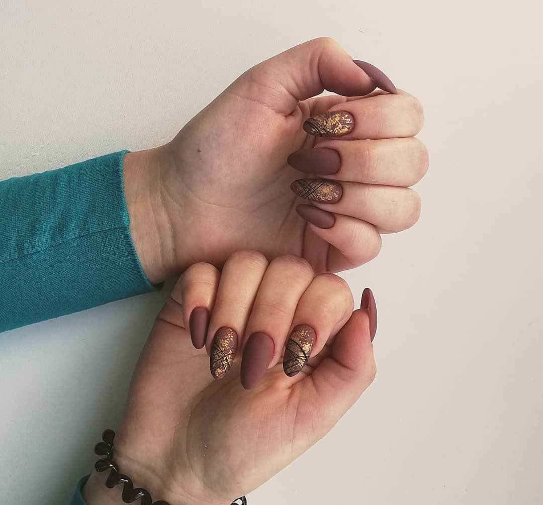 Наиболее дорогая и праздничная композиция сочетания коричневого цвета – это сочетание коричневого с золотом. Для декора вечернего маникюра мастера нейл-арта используют золотую фольгу, глиттер, конфетти, полноценное покрытие, создающее вид металлического глянца.