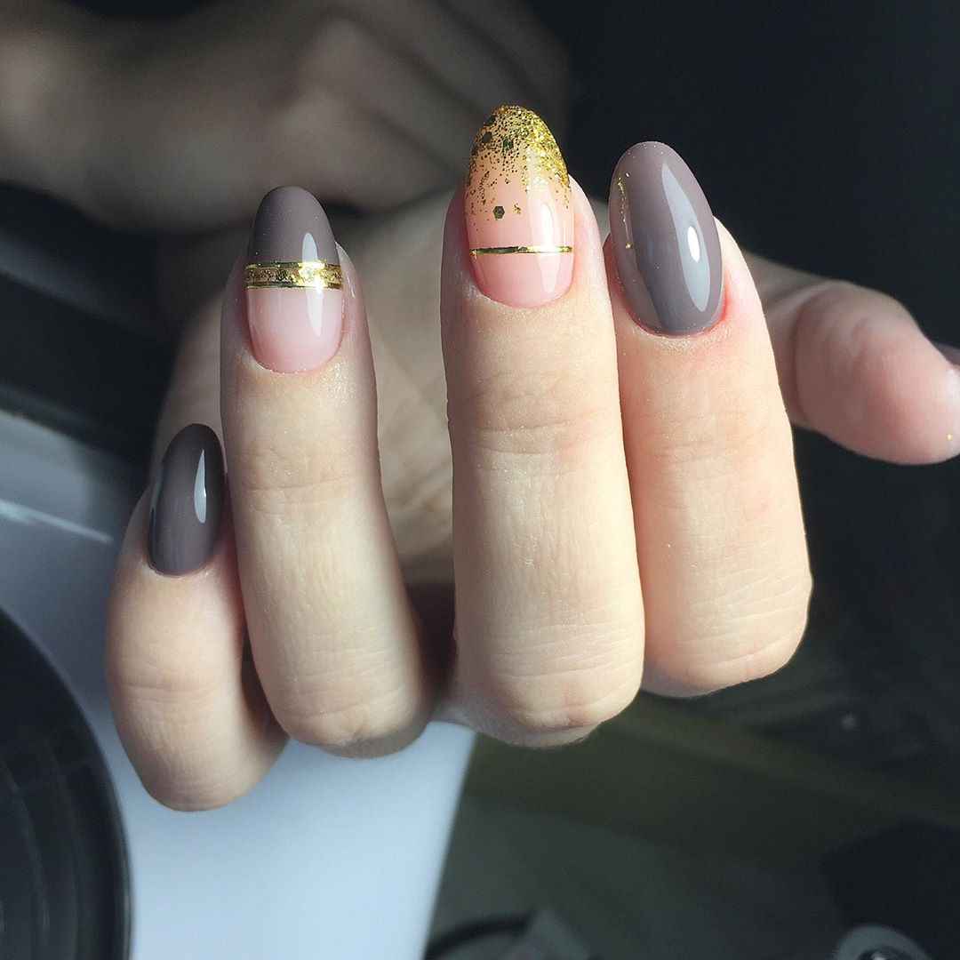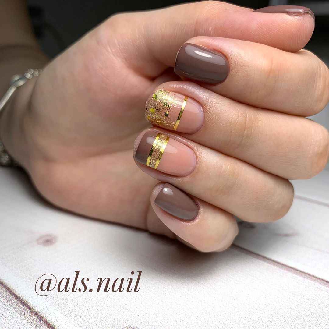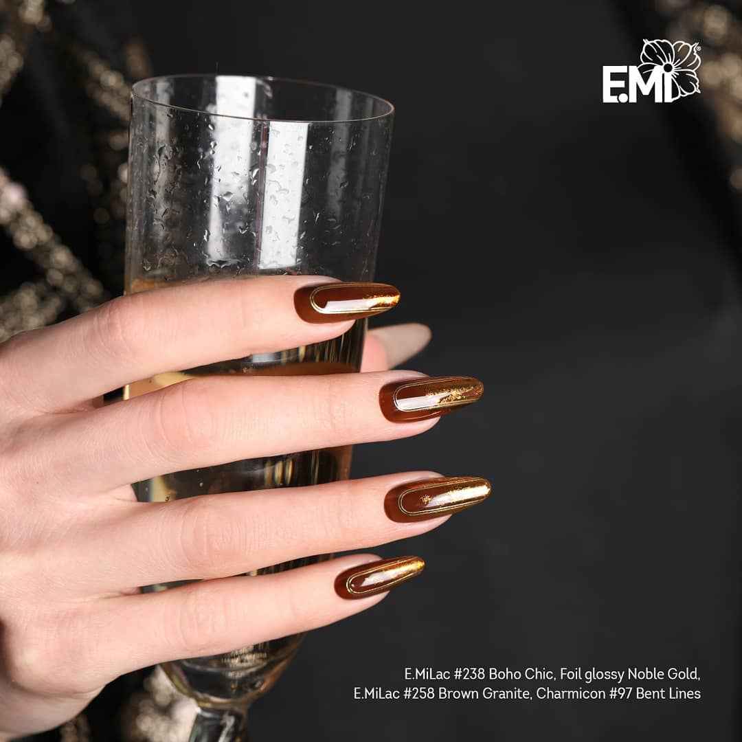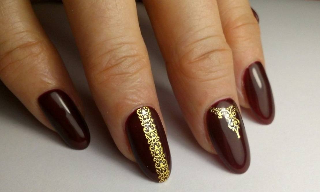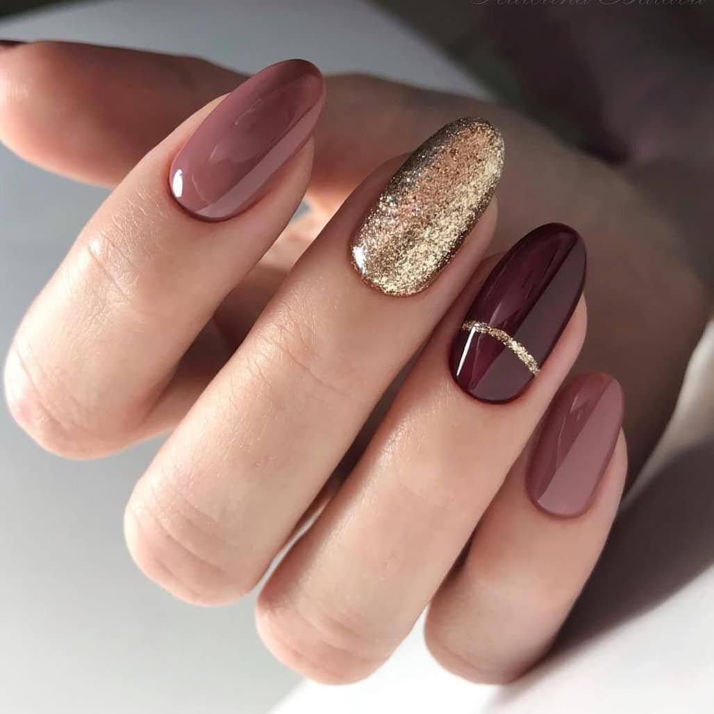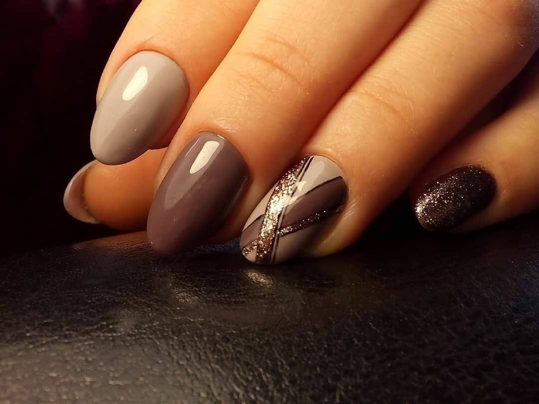 Наиболее дорогая и праздничная композиция сочетания коричневого цвета – это сочетание коричневого с золотом. Для декора вечернего маникюра мастера нейл-арта используют золотую фольгу, глиттер, конфетти, полноценное покрытие, создающее вид металлического глянца.