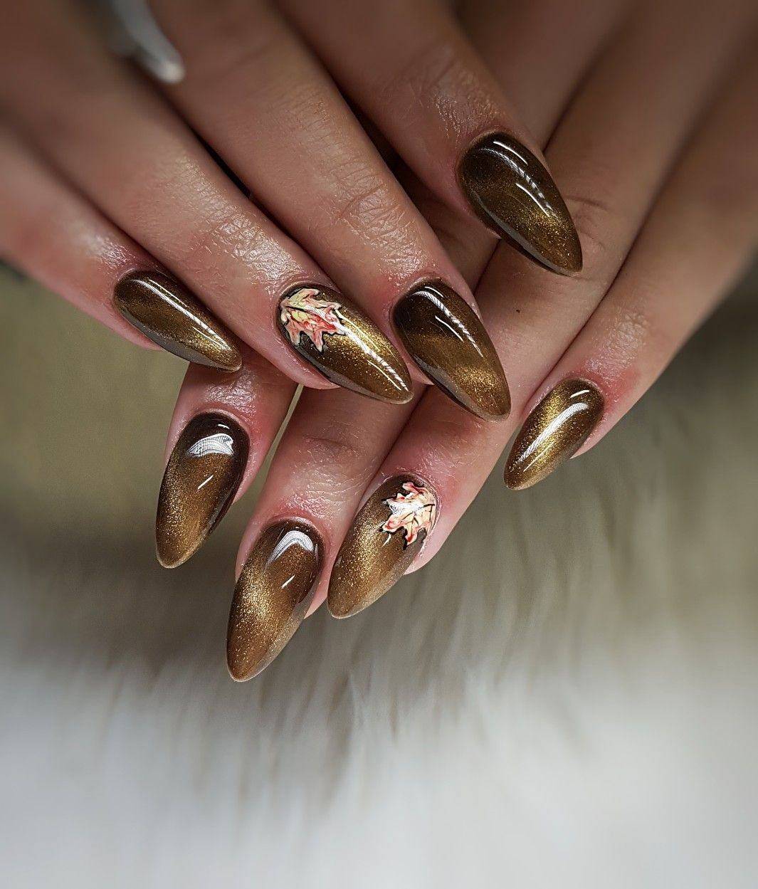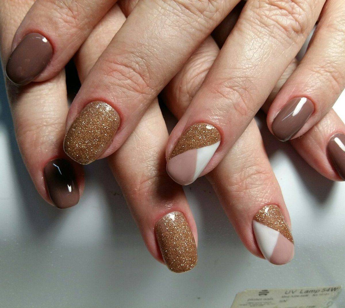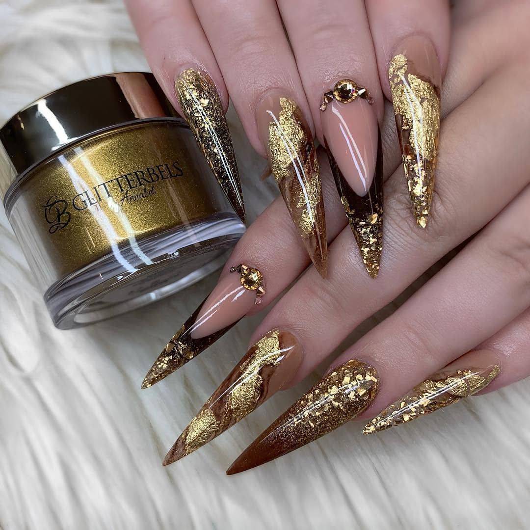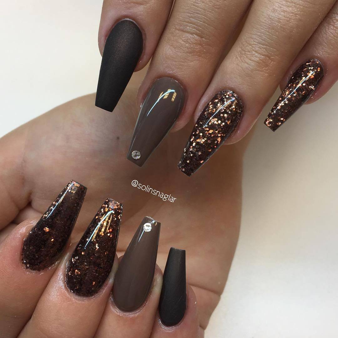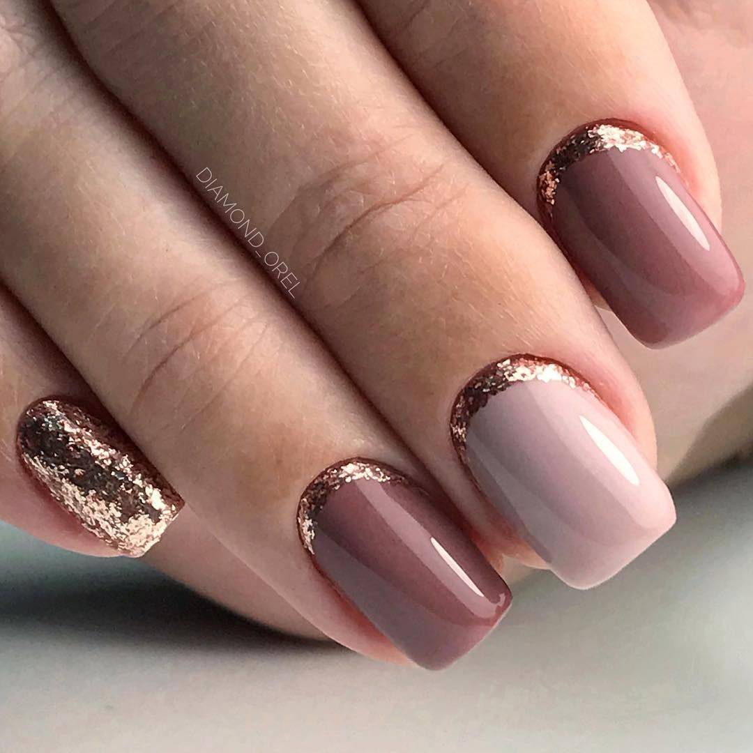 Наиболее дорогая и праздничная композиция сочетания коричневого цвета – это сочетание коричневого с золотом. Для декора вечернего маникюра мастера нейл-арта используют золотую фольгу, глиттер, конфетти, полноценное покрытие, создающее вид металлического глянца.
