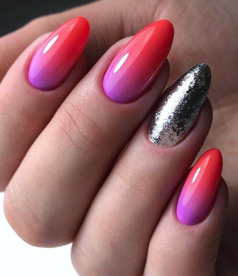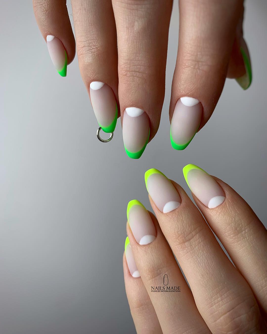 Для французского маникюра можно использовать градиентную технику по краю ногтевой пластины. При этом остальное пространство ногтевой пластины лучше оставить прозрачной. Присмотритесь к нейл-артам с разными оттенками по краю ногтя на каждой руке. При выборе оттенков также ориентируйтесь на цветовой круг. Яркий френч отлично смотрится на квадратных и миндальных ногтях. Лучше использовать классическую овальную форму “улыбки”.