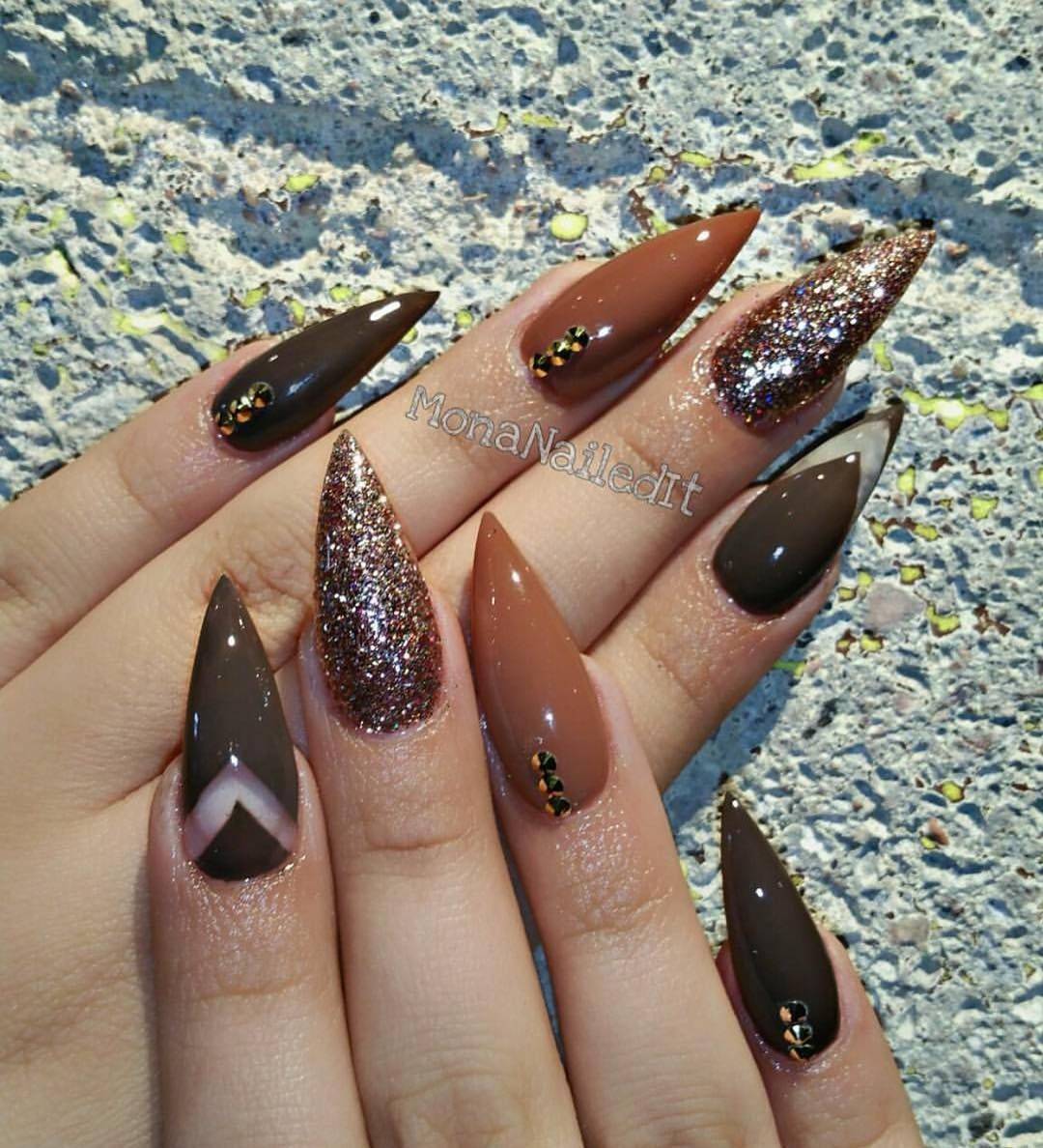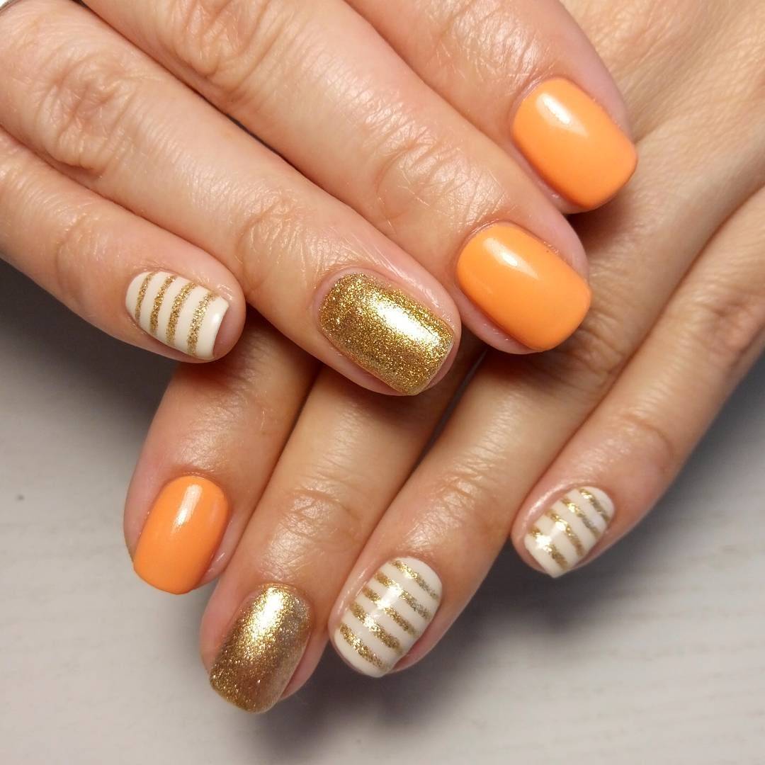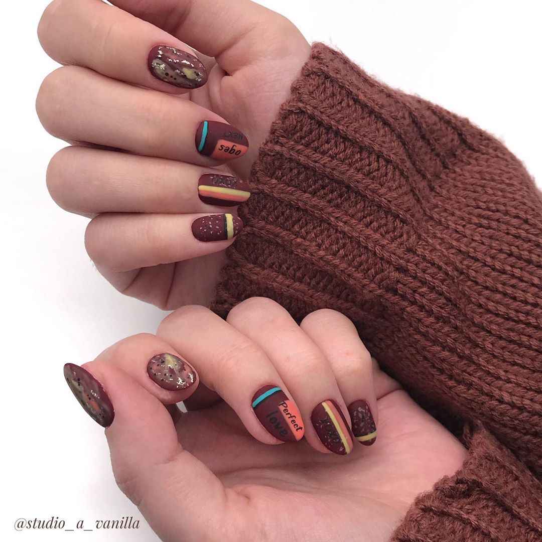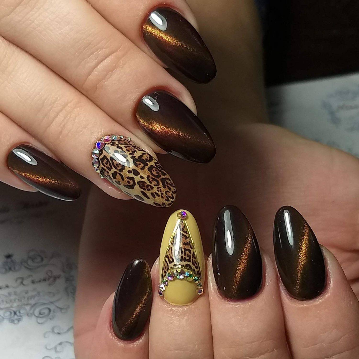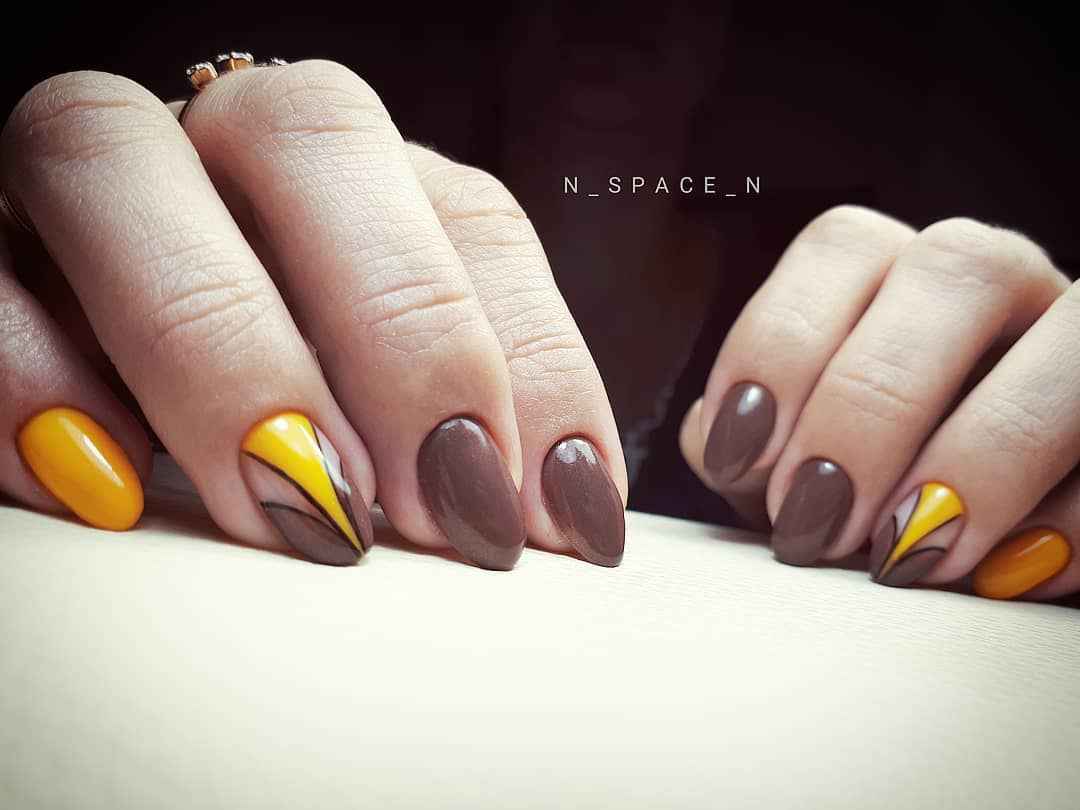 Мастера нейл-арта сочетают коричневый цвет с желтым и даже с оранжевым цветом. Желтым или оранжевым цветом выделяют ноготки, поверх которых создают декор стразами или блестками.