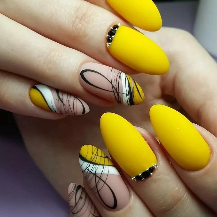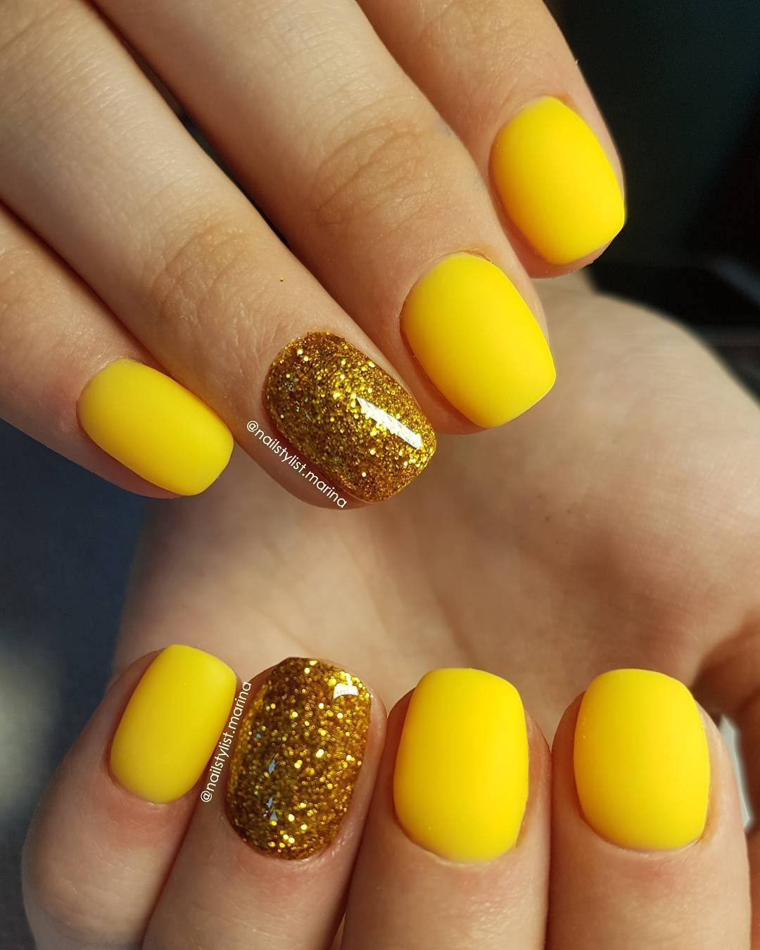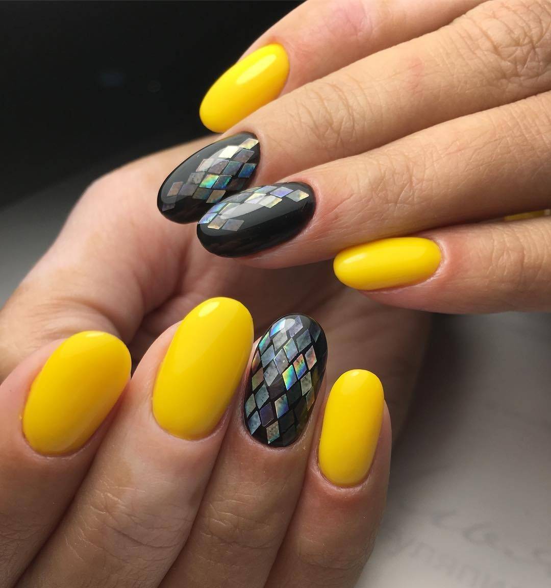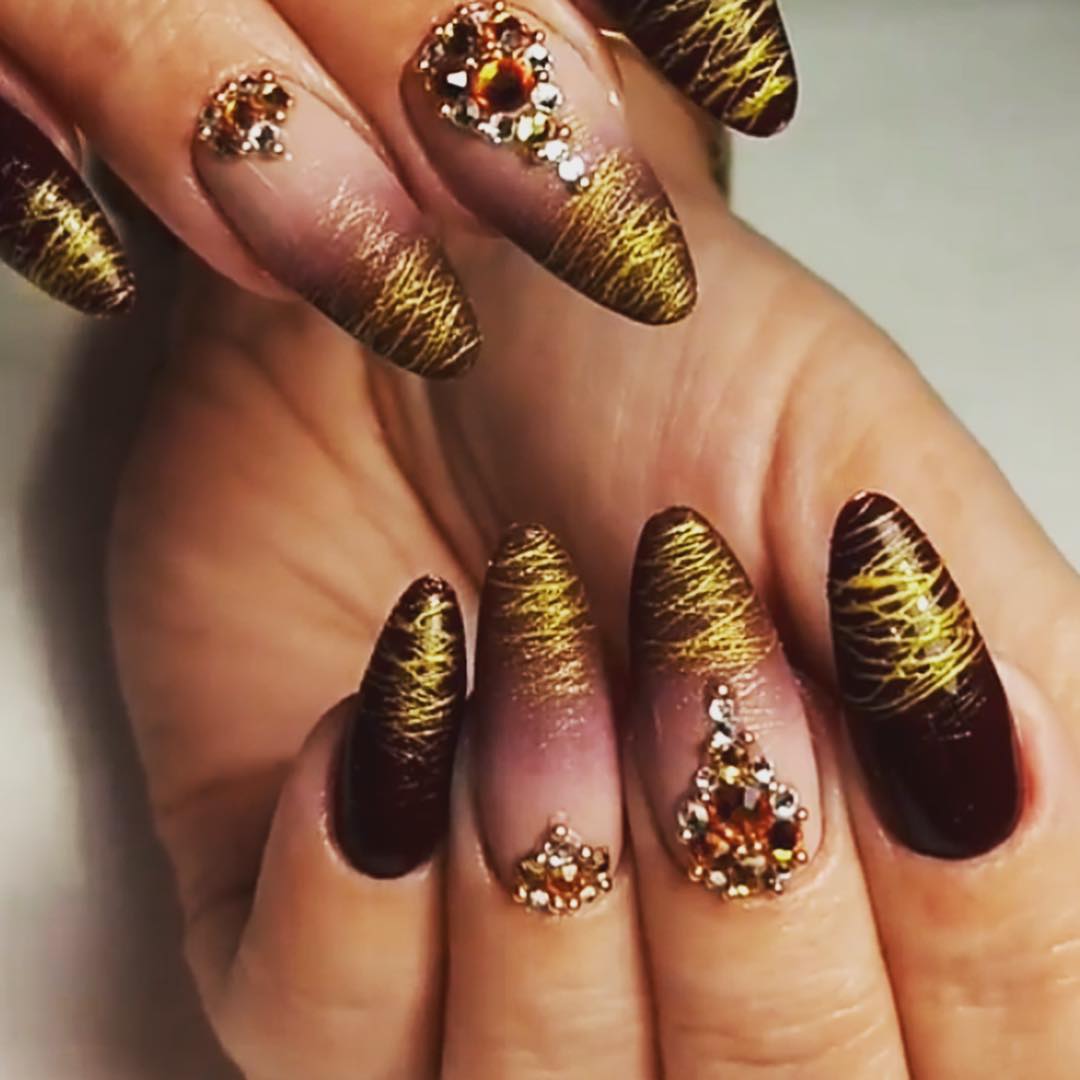 Мастера нейл-арта сочетают коричневый цвет с желтым и даже с оранжевым цветом. Желтым или оранжевым цветом выделяют ноготки, поверх которых создают декор стразами или блестками.