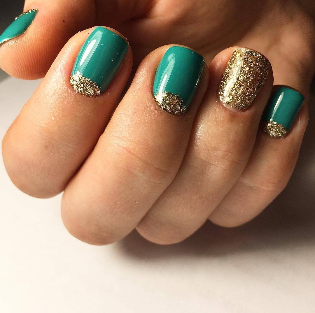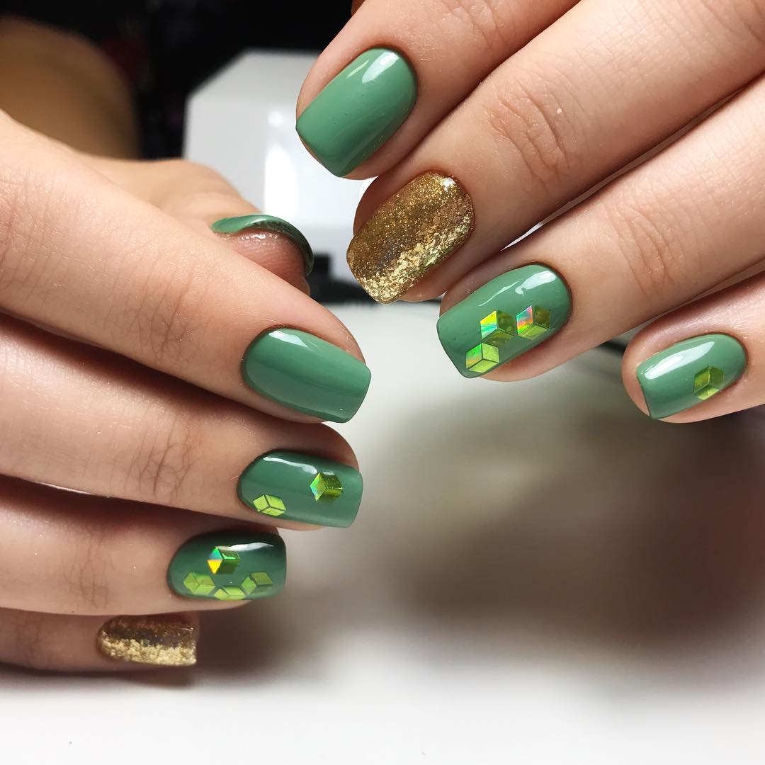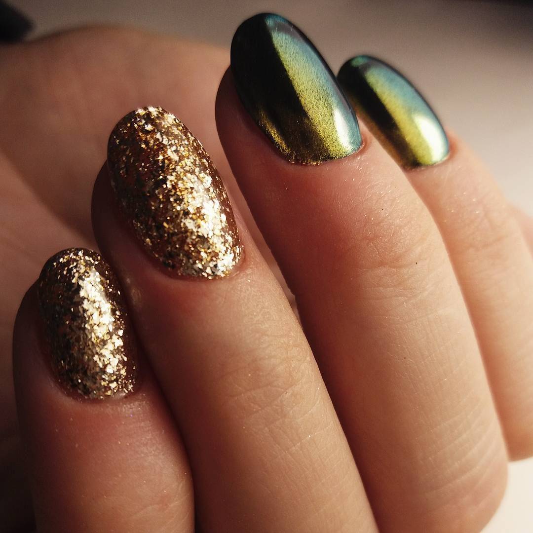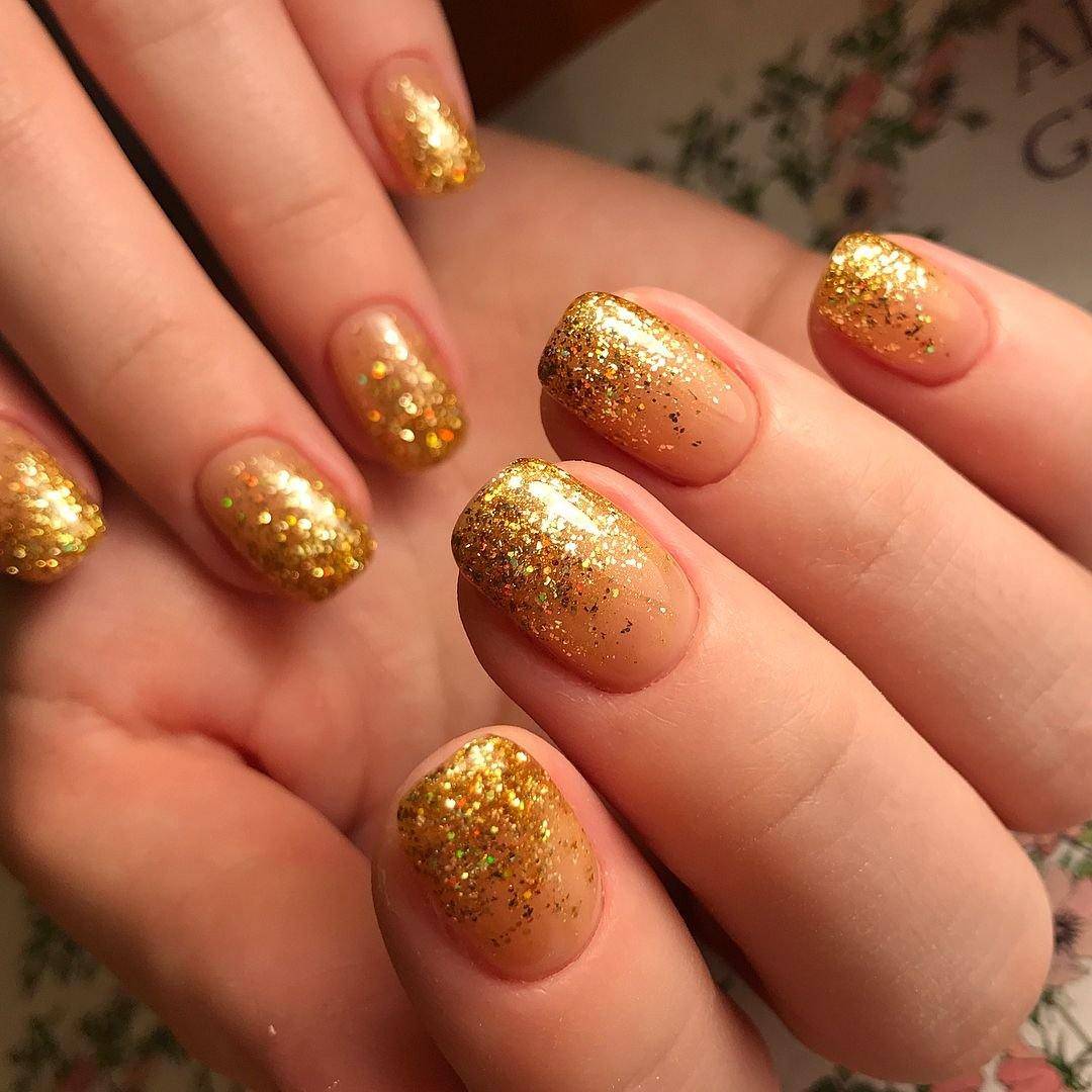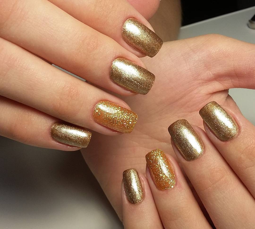 Также золотой маникюр можно сделать при помощи блесток. Такой вариант подойдет девушкам, которые желают «блистать» в прямом смысле этого слова. Ногти, в оформлении которых задействованы блестки, всегда выглядят по-праздничному. Блестки бывают двух видов: глиттер (крупные блестящие частички различных форм) или декоративная пыль, которая позволяет достичь 3D эффекта. Блестки могут быть нанесены в различных техниках: на всю ногтевую пластину или в виде определенного узора. Также в последнее время, мастера используют блестки-наклейки. Золото отлично комбинируется с модными цветами маникюра, такими как серый, черный, синий и др.