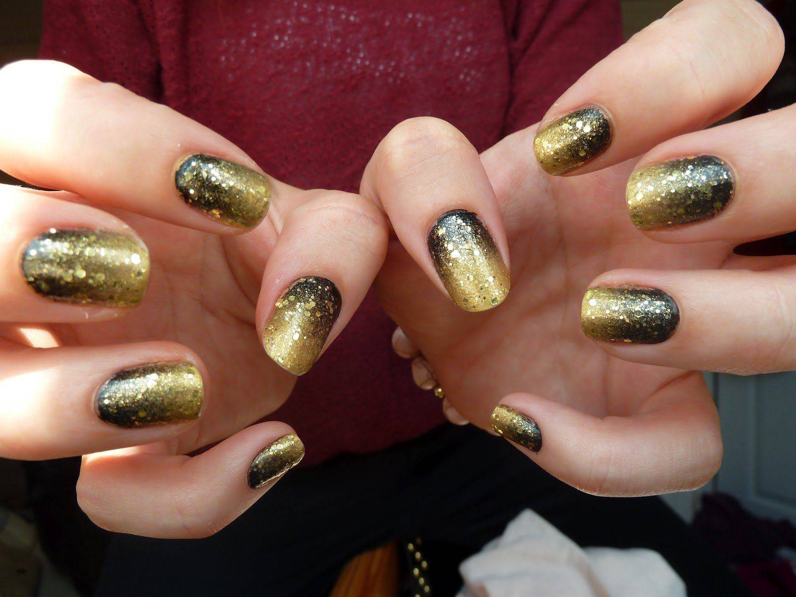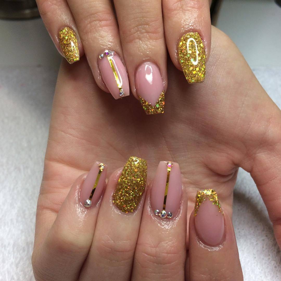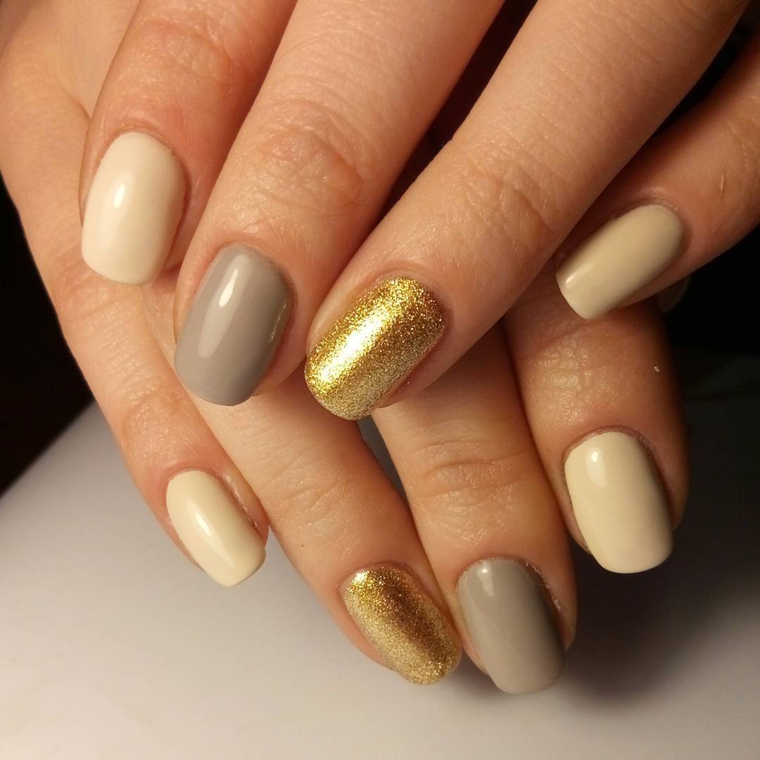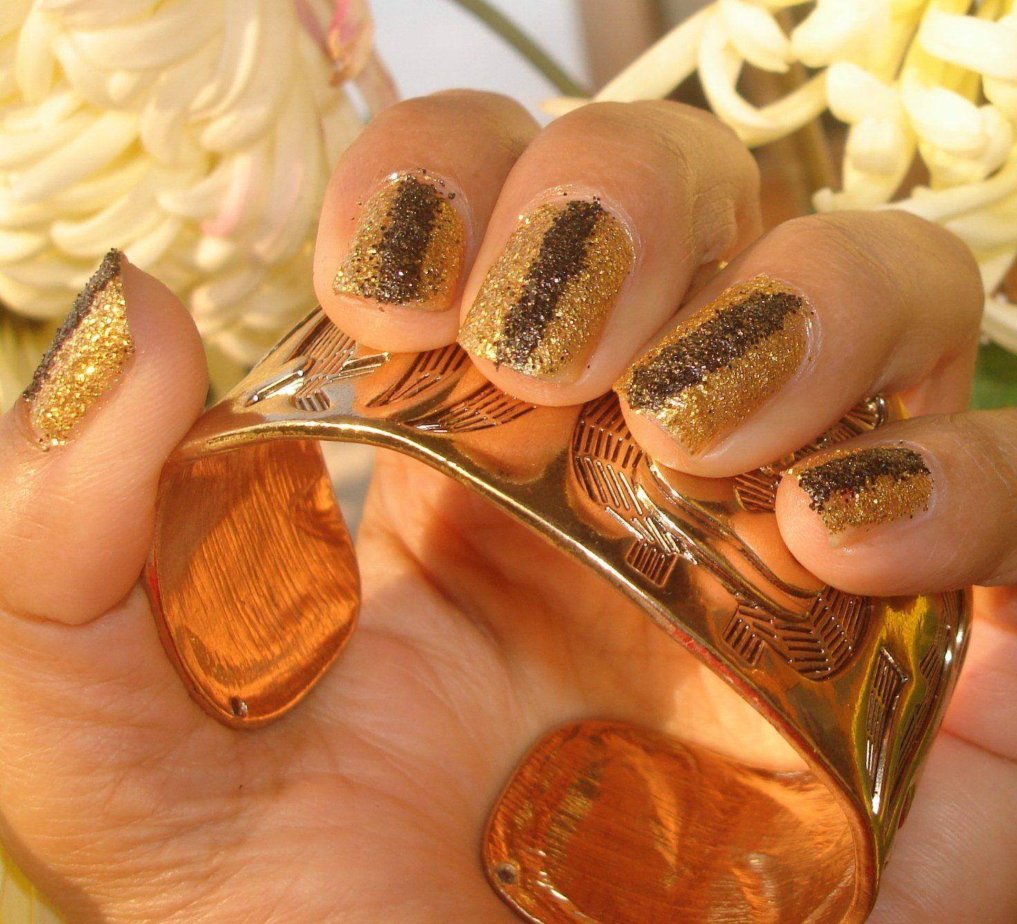 Также золотой маникюр можно сделать при помощи блесток. Такой вариант подойдет девушкам, которые желают «блистать» в прямом смысле этого слова. Ногти, в оформлении которых задействованы блестки, всегда выглядят по-праздничному. Блестки бывают двух видов: глиттер (крупные блестящие частички различных форм) или декоративная пыль, которая позволяет достичь 3D эффекта. Блестки могут быть нанесены в различных техниках: на всю ногтевую пластину или в виде определенного узора. Также в последнее время, мастера используют блестки-наклейки. Золото отлично комбинируется с модными цветами маникюра, такими как серый, черный, синий и др.