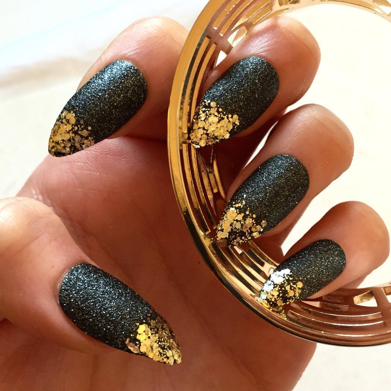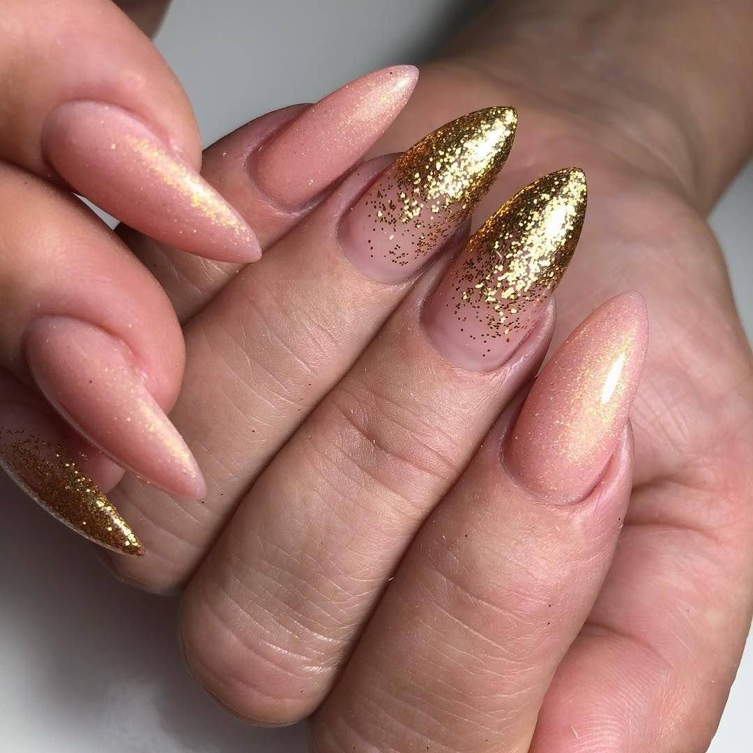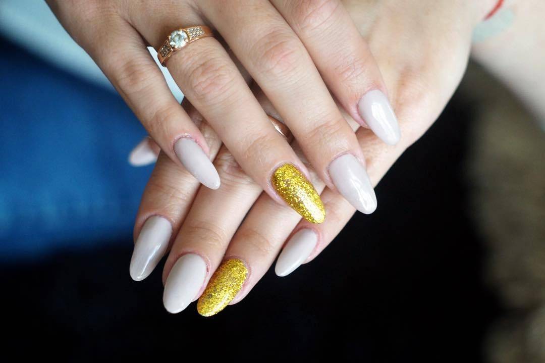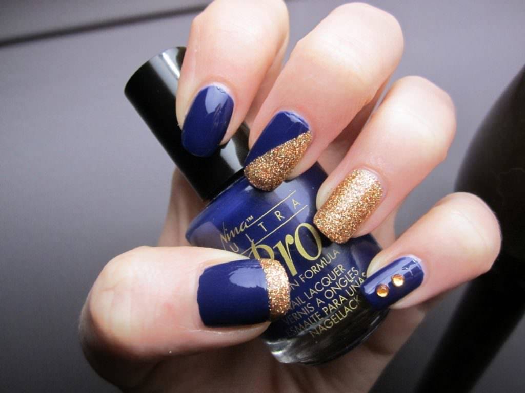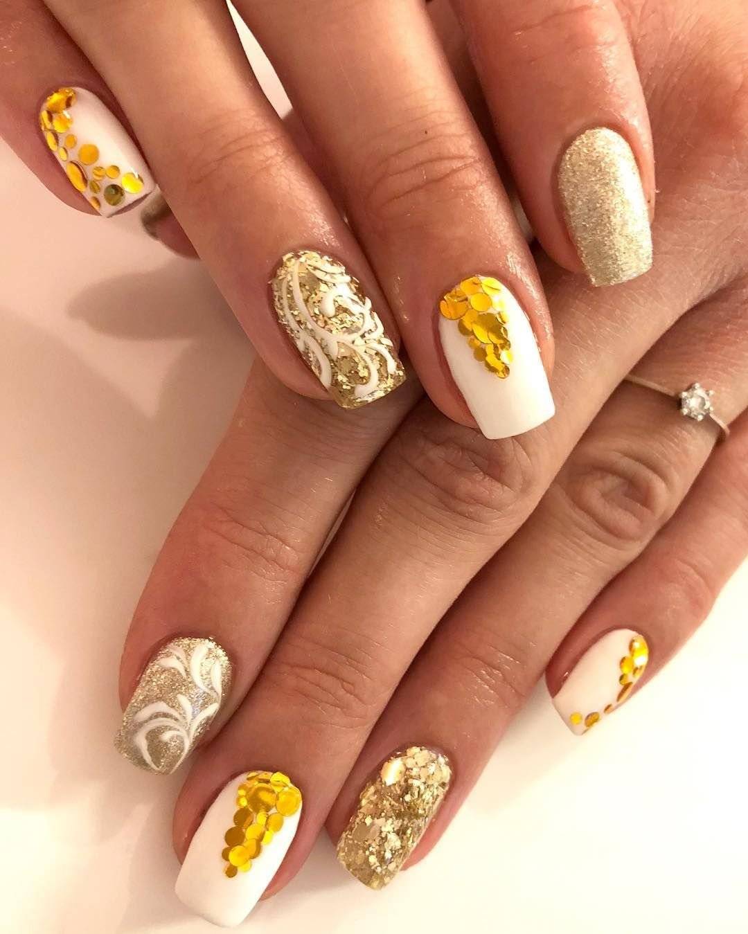 Также золотой маникюр можно сделать при помощи блесток. Такой вариант подойдет девушкам, которые желают «блистать» в прямом смысле этого слова. Ногти, в оформлении которых задействованы блестки, всегда выглядят по-праздничному. Блестки бывают двух видов: глиттер (крупные блестящие частички различных форм) или декоративная пыль, которая позволяет достичь 3D эффекта. Блестки могут быть нанесены в различных техниках: на всю ногтевую пластину или в виде определенного узора. Также в последнее время, мастера используют блестки-наклейки. Золото отлично комбинируется с модными цветами маникюра, такими как серый, черный, синий и др.