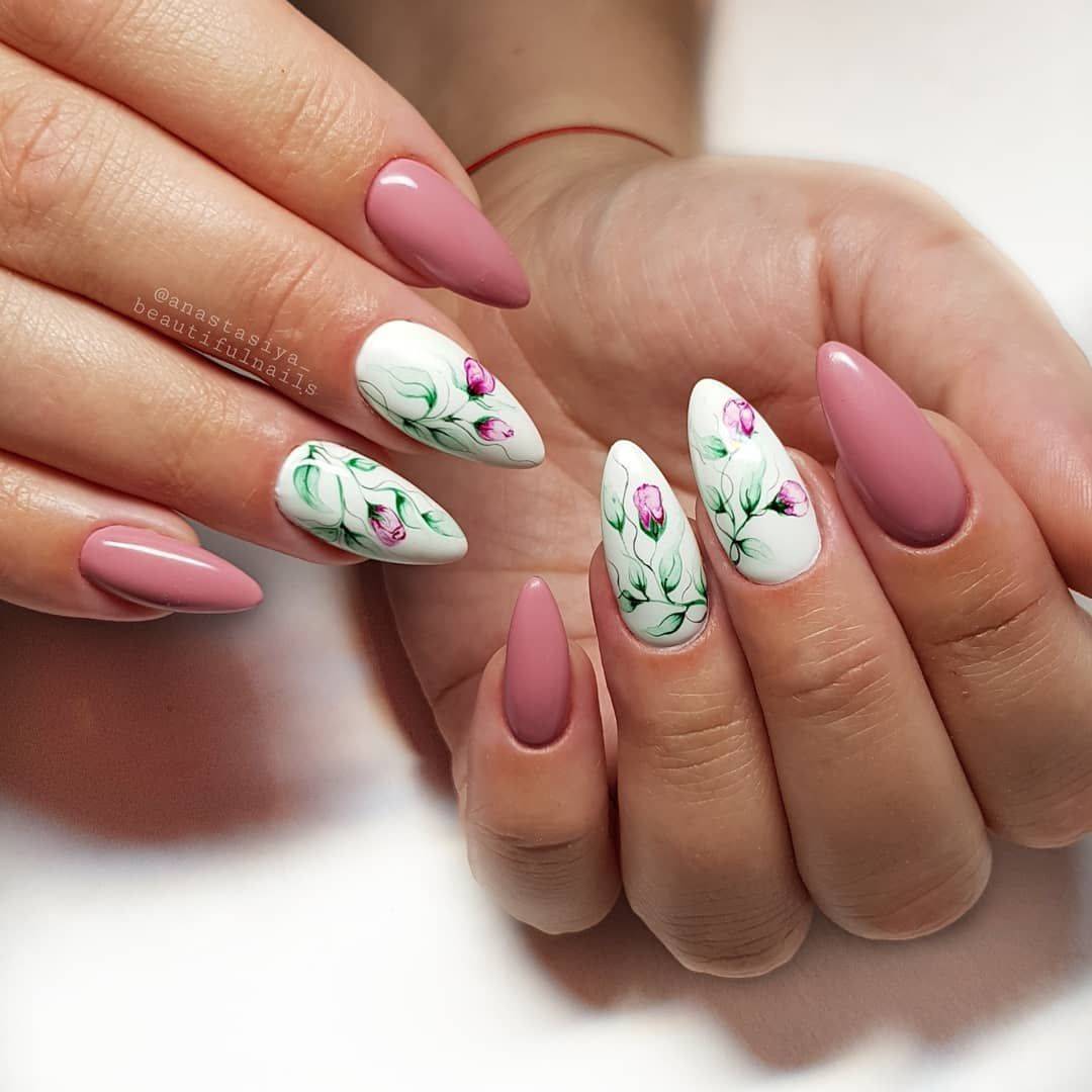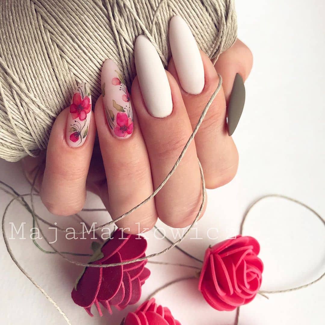 Оригинально выглядит сочетание белого и красного. Такой дизайн точно не останется незамеченным. Что касается техник маникюра, то интересно выглядит геометрический дизайн в красно-белом цвете, дизайн с фольгой. Присмотритесь к нейл-артам с флористикой. Дизайн с цветами 2020 – это нежные и лаконичные идеи, где декор занимает незначительное пространство ногтевой пластины. Если вы решили выполнить красно-белый маникюр с цветами, то рисуйте аккуратные нежные узоры с веточками, бутонами и листьями.