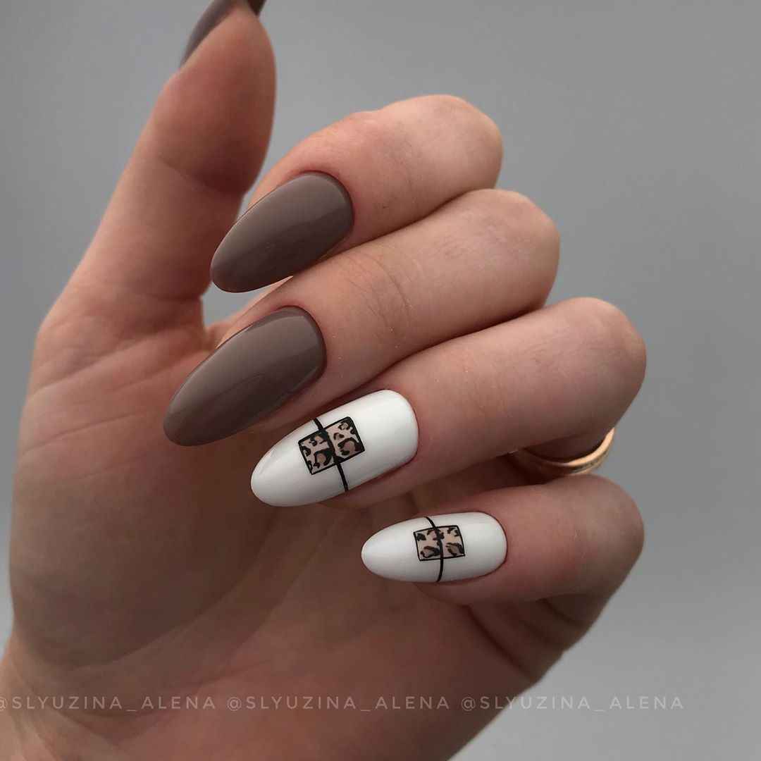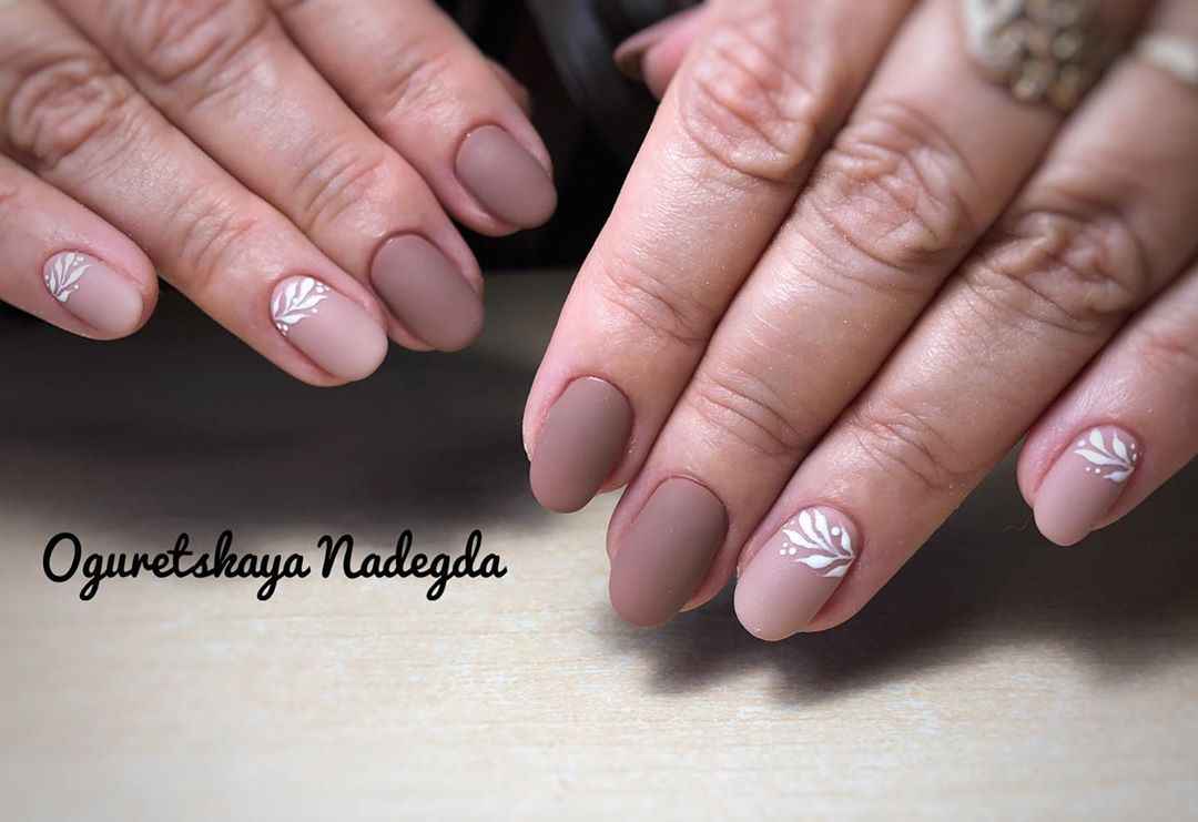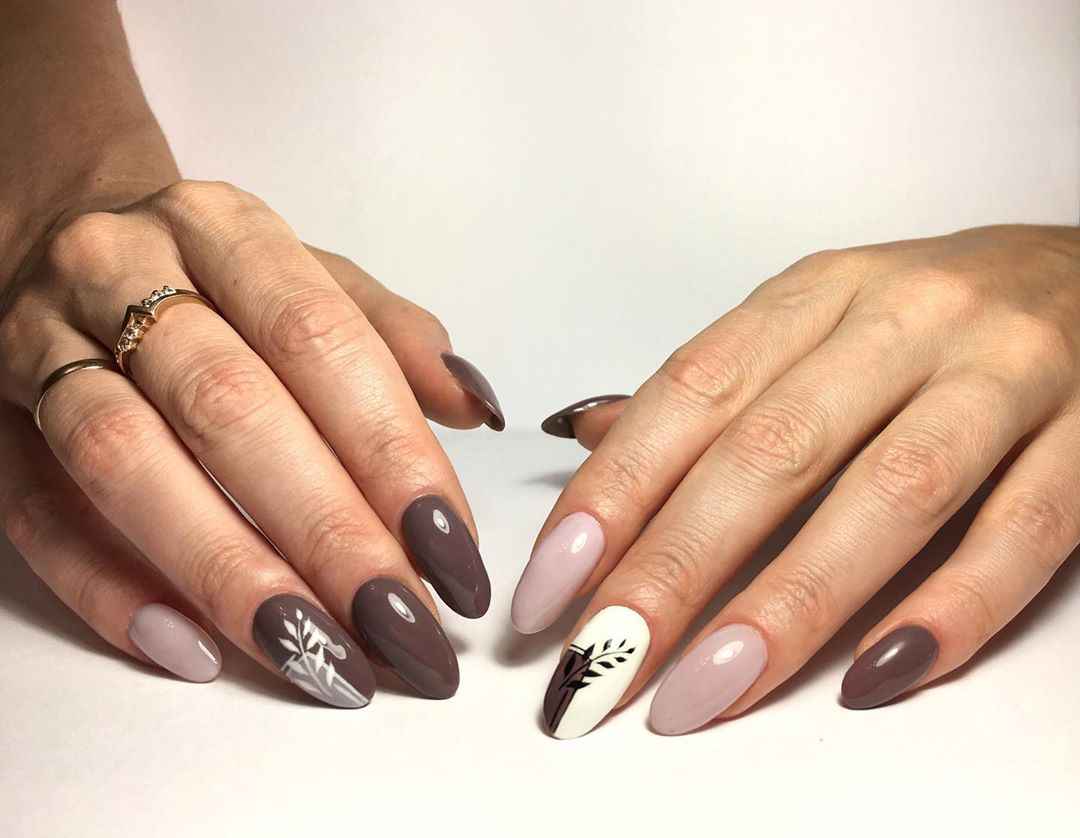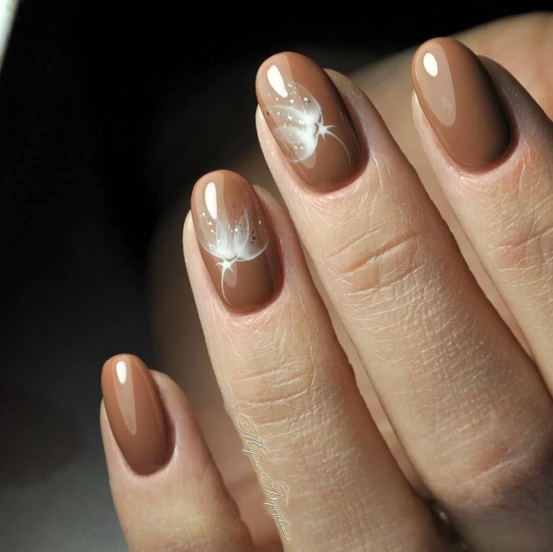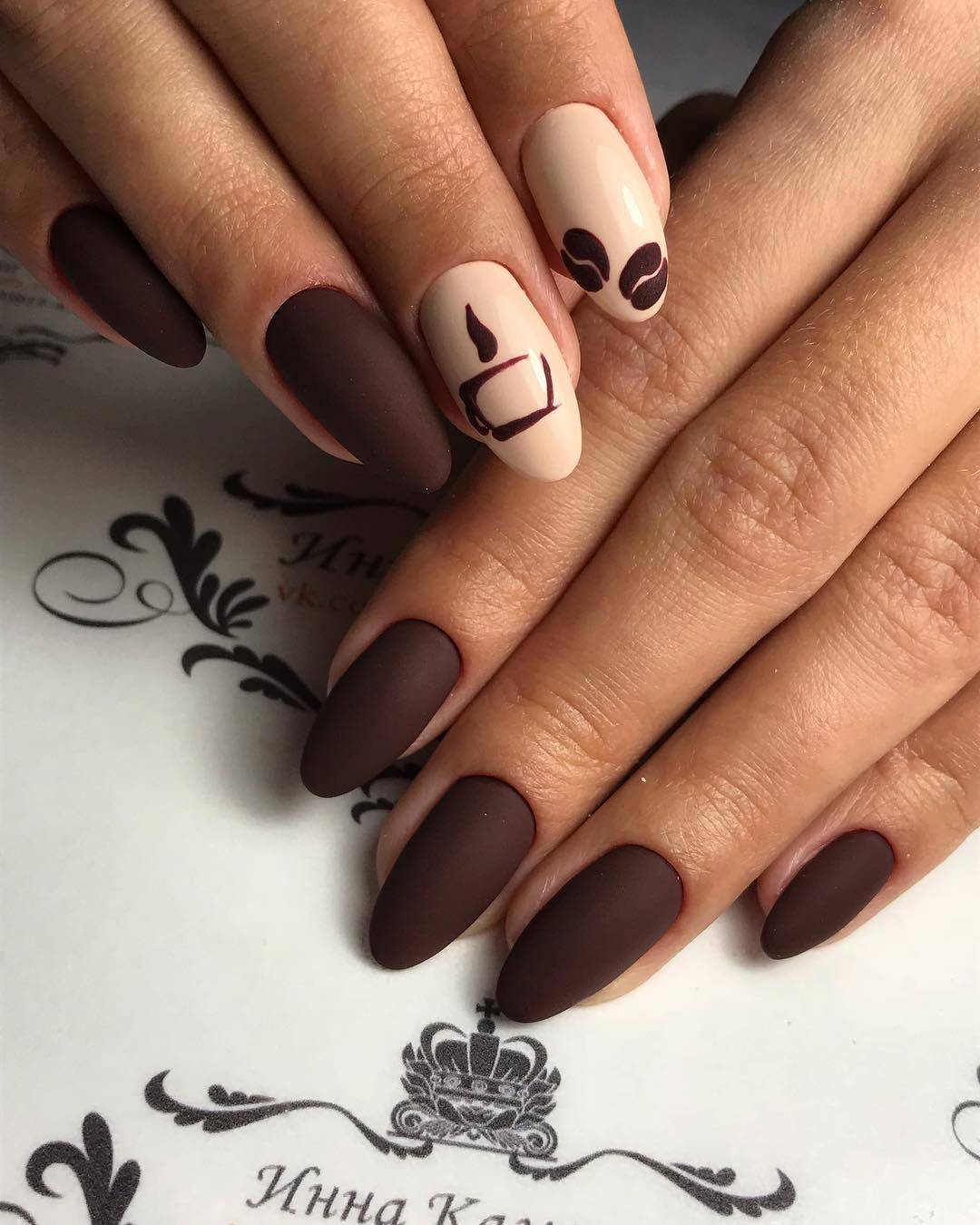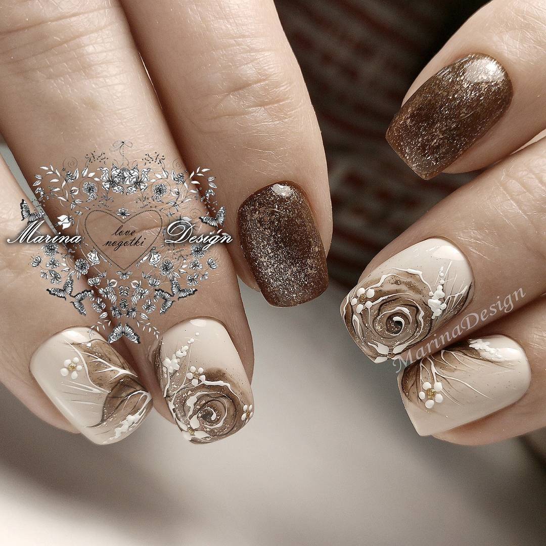 Самым беспроигрышным вариантом является сочетание коричневого и бежевого цветов. Бежевым цветом как правило покрывают несколько ноготков, на которых прорисовываются рисунки коричневым цветом.