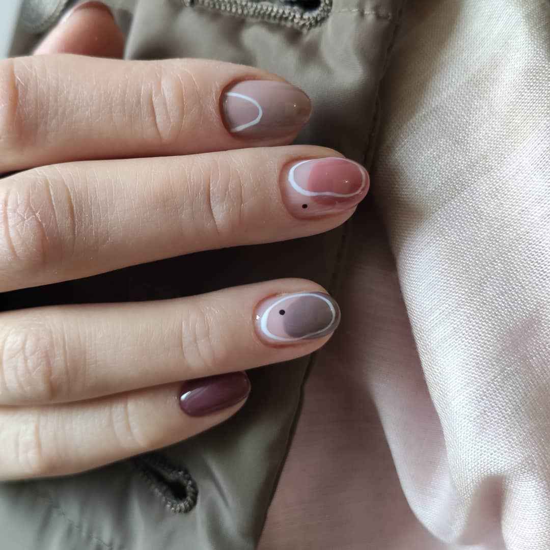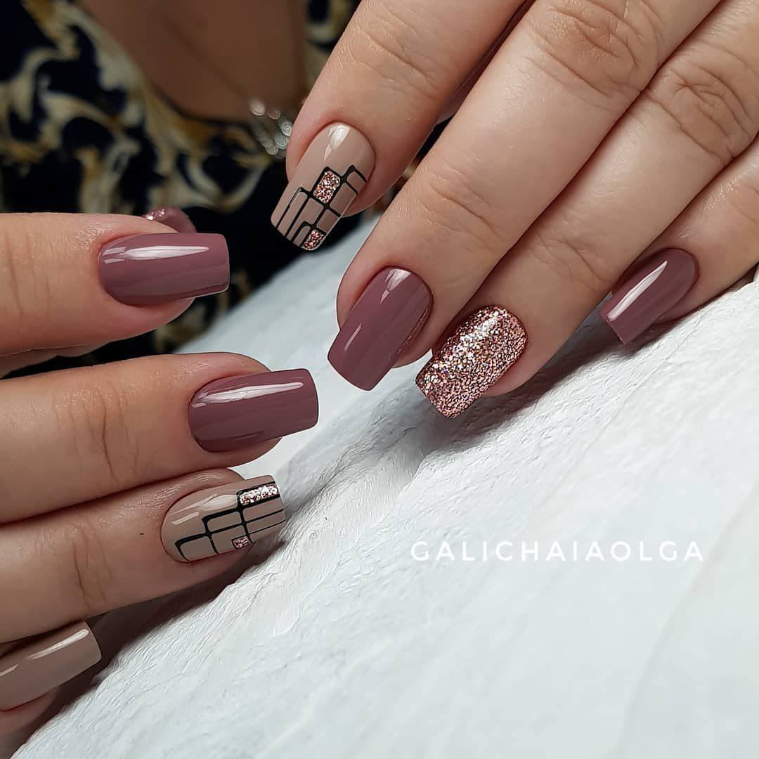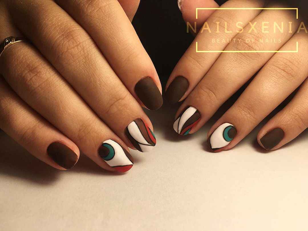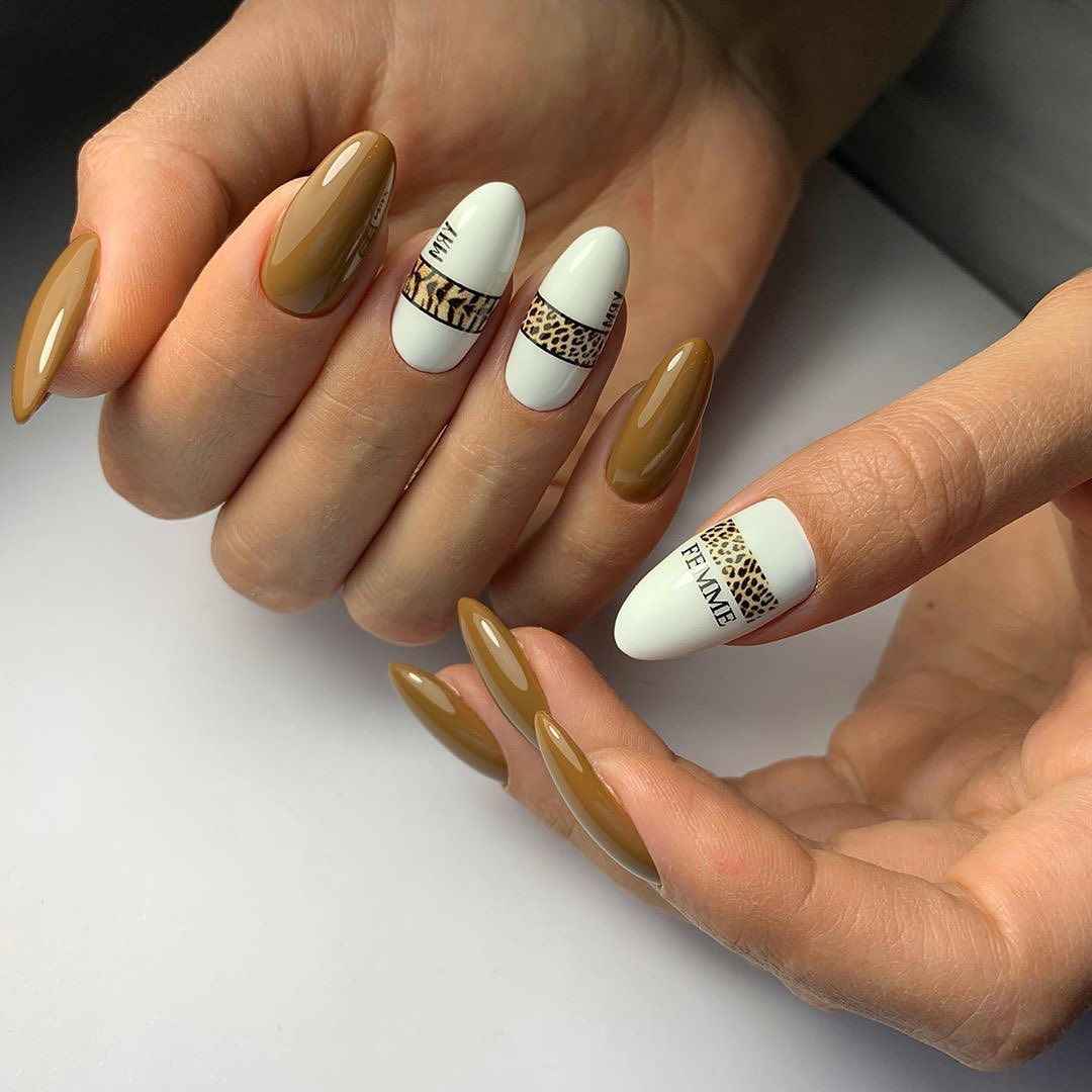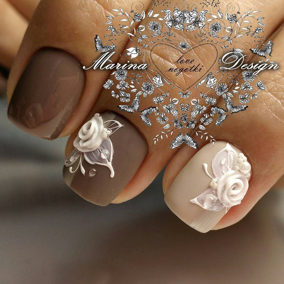 Самым беспроигрышным вариантом является сочетание коричневого и бежевого цветов. Бежевым цветом как правило покрывают несколько ноготков, на которых прорисовываются рисунки коричневым цветом.