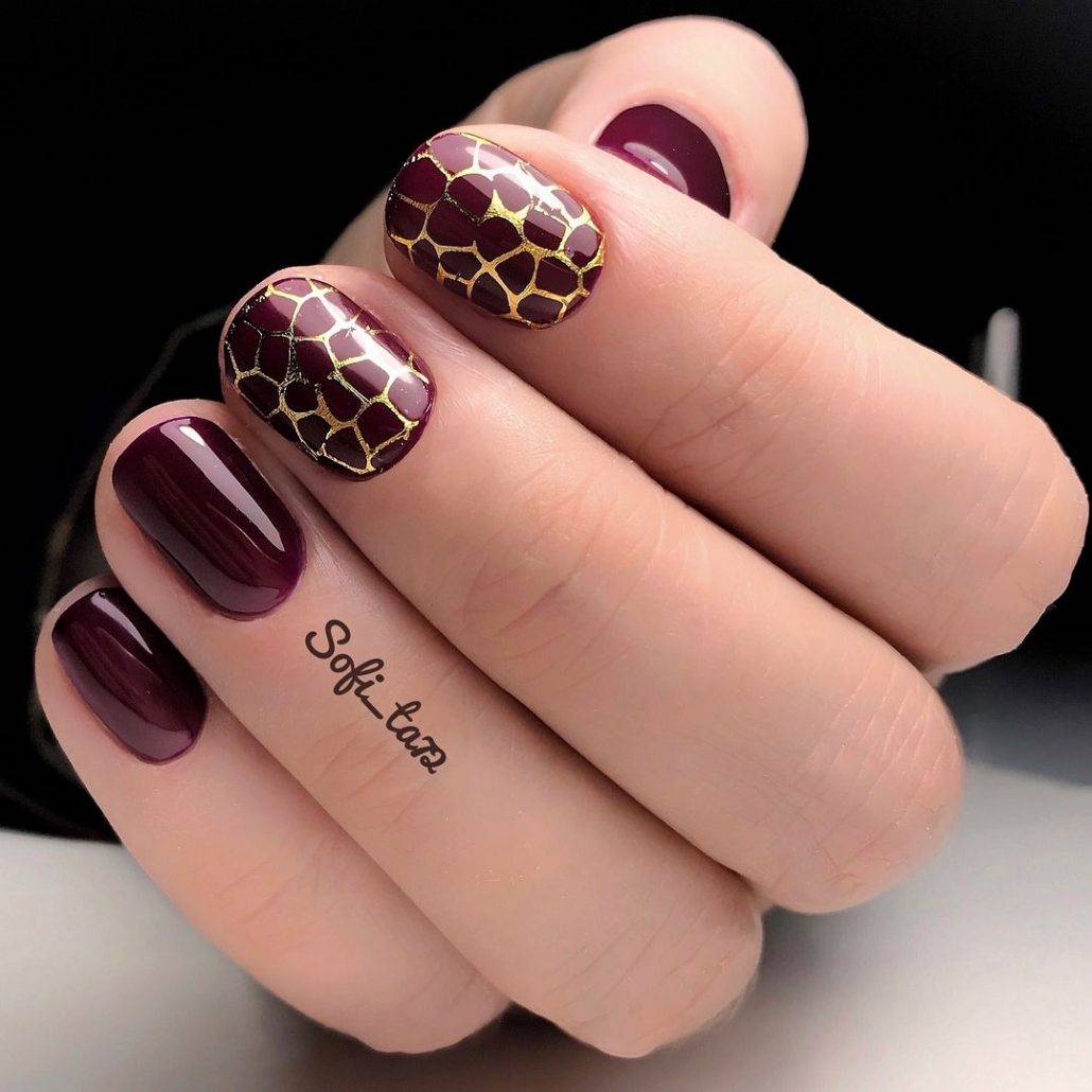 Осенью можно использовать новую технику оформления ногтей, которая называется кракелюр фольгой. Узор наносится хаотично методом отлипа на гель-лак с липким слоем. Фиксируется результат матовым или глянцевым прозрачным топом. Шикарно смотрится черно-красное сочетание лака и фольги. Выполняется дизайн считанные минуты.