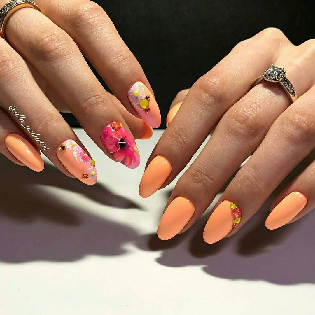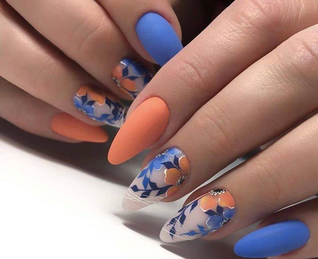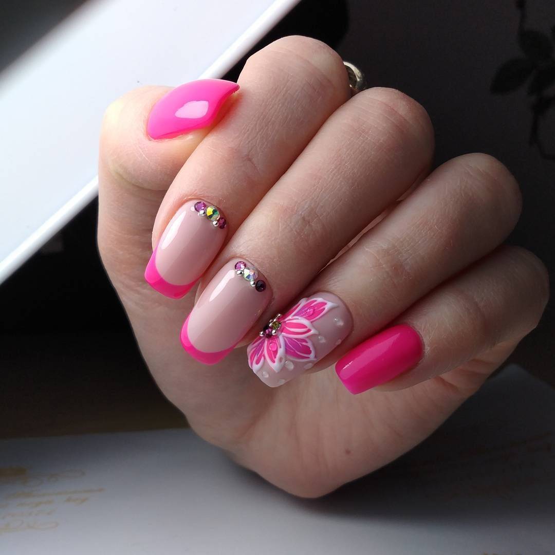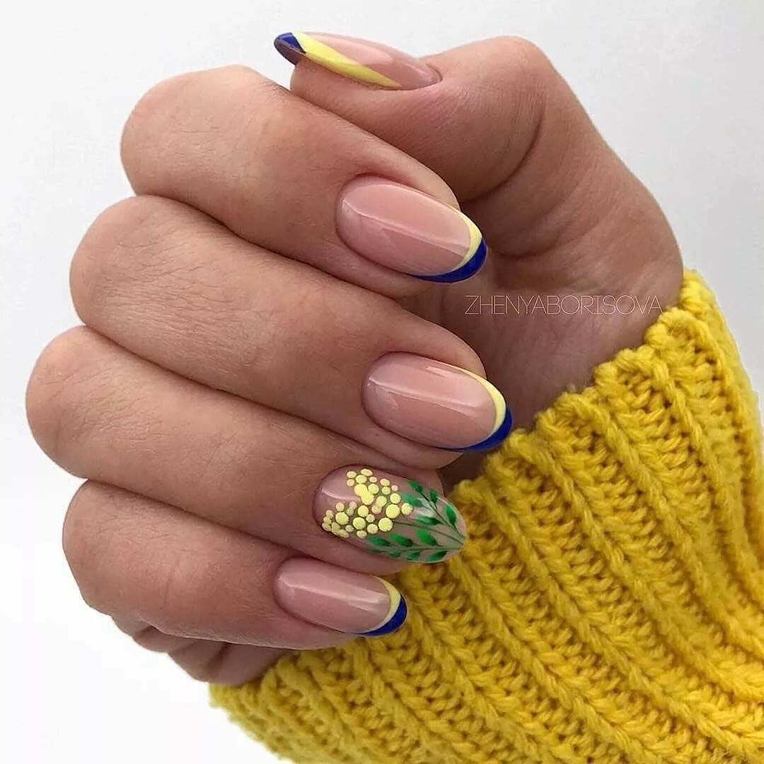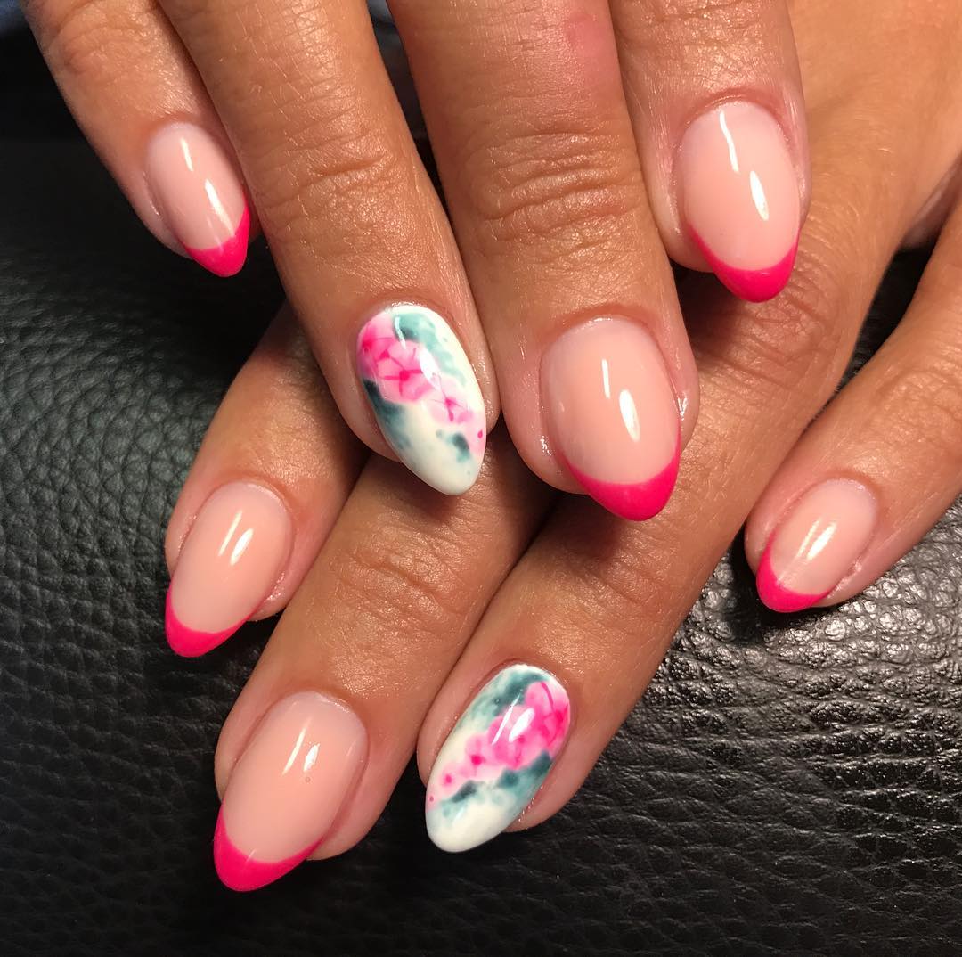 Цветной френч отлично сочетается с флористикой. Маникюр смотрится ярко и броско, особенно если декор также выполнен в сочных оттенках. Цветной френч лучше выполнять на длинных квадратных или миндальных ногтях. На такой «длине» получится сделать широкую «улыбку» и показать красивый цветной градиент.
