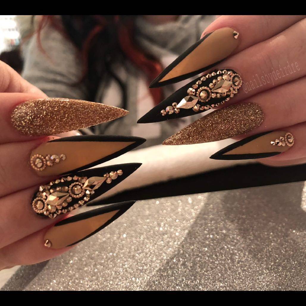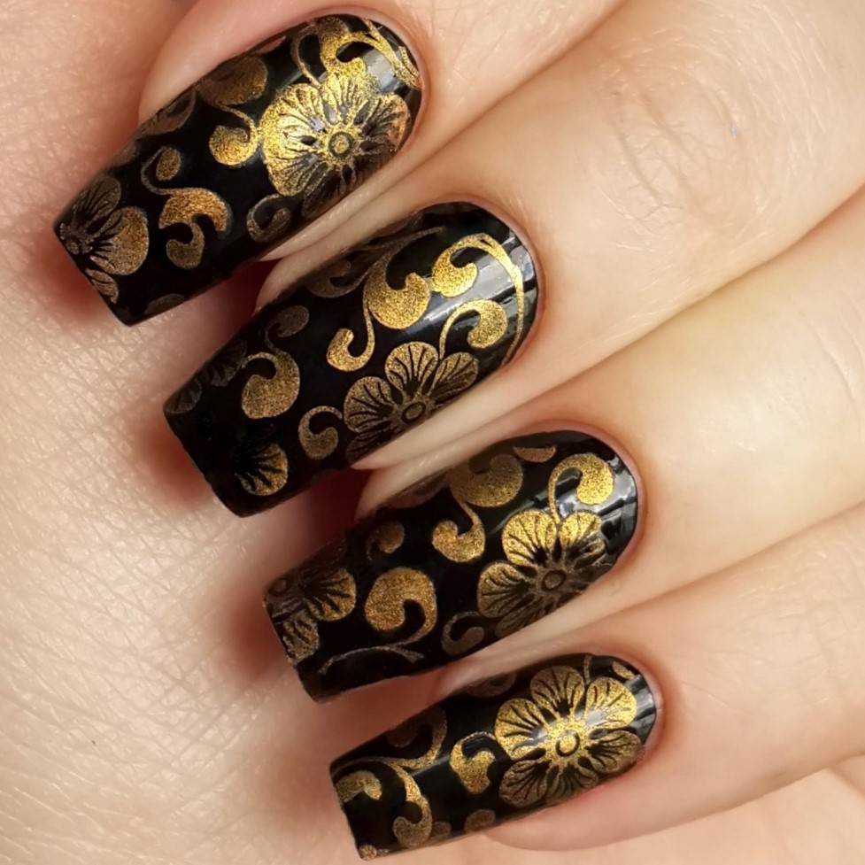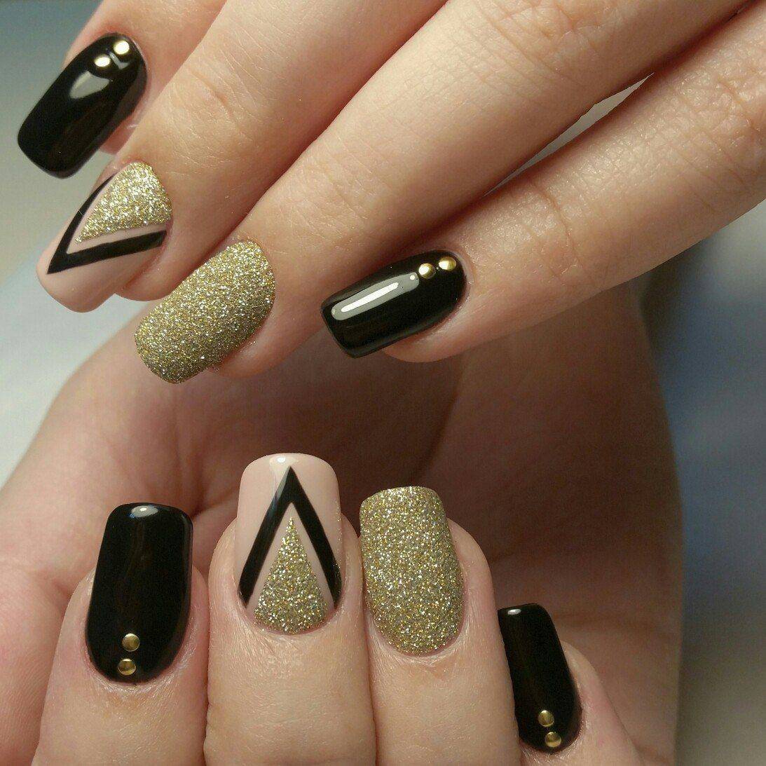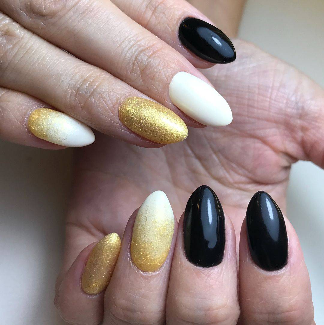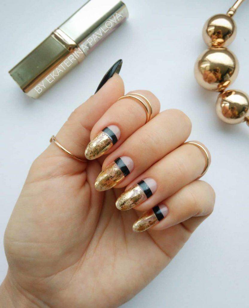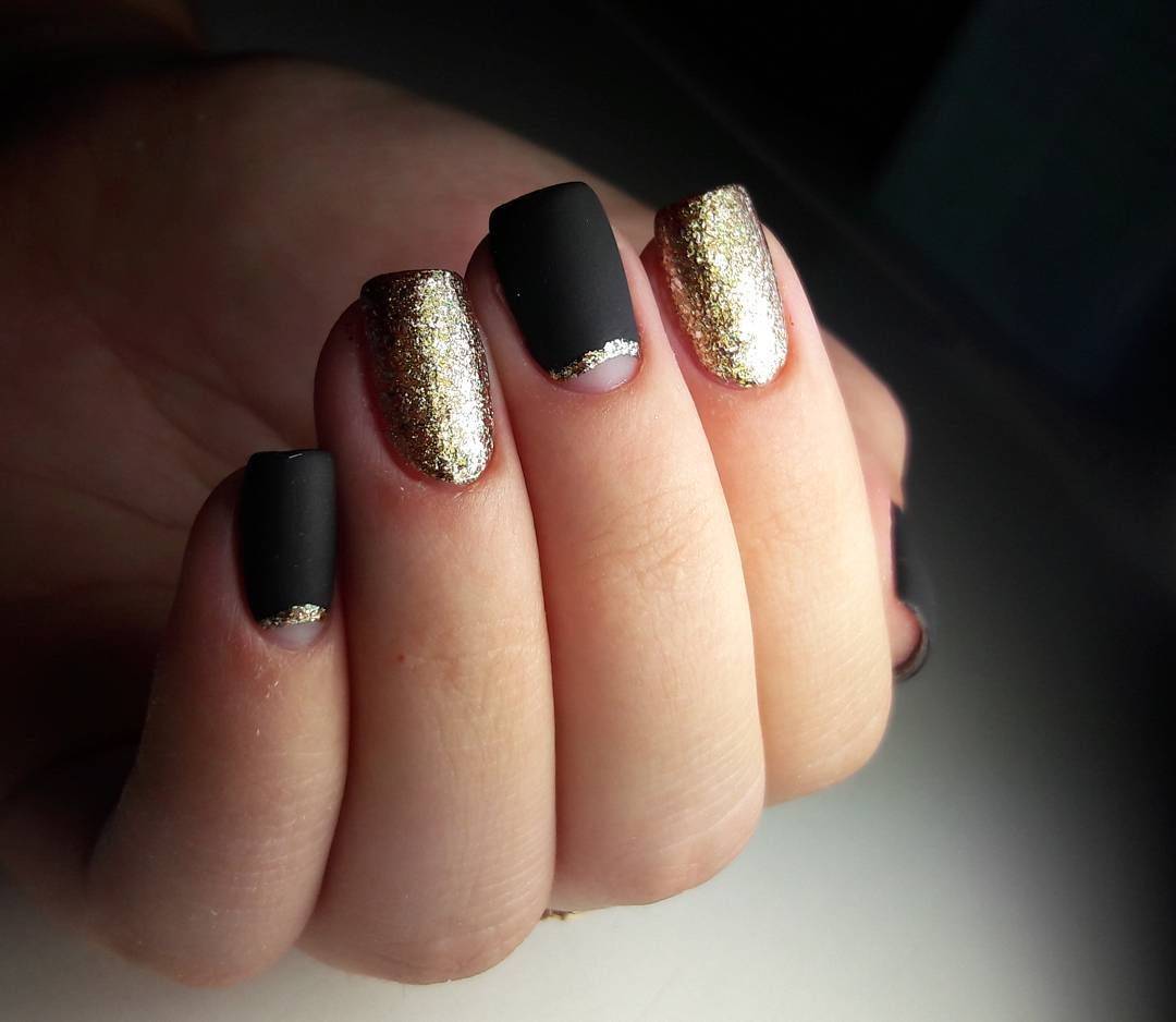 Сочетание черного с золотом – это истинная роскошь. Такой дизайн ногтей смотрится восхитительно и необычно. Классически черный цвет подчеркивает особый шарм и торжественность золотого оттенка. Выполнив черно-золотой маникюр (фото чуть ниже), вы можете смело отправляться на вечеринку с друзьями или на свидание. Изысканный и утонченный, он обязательно притянет восторженные взгляды к вашим рукам. Черно-золотой маникюр может быть выполнен в различных вариантах. Например, красиво смотрится классический французский маникюр, когда кончики ногтей покрываются черным лаком и обрамляются золотом. Или же другой вариант – когда все ногти окрашивают черным, а один или несколько разрисовываются золотыми узорами.