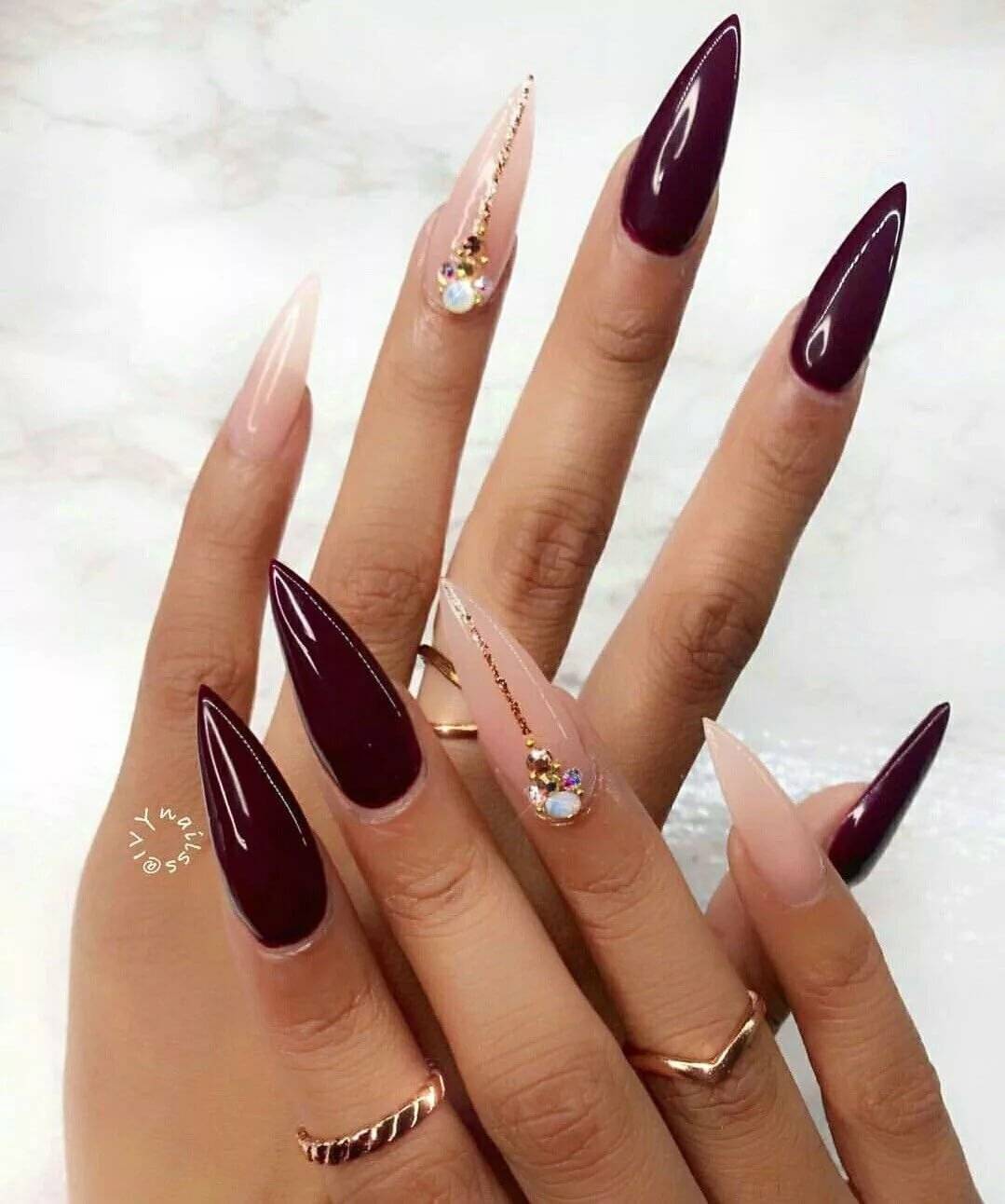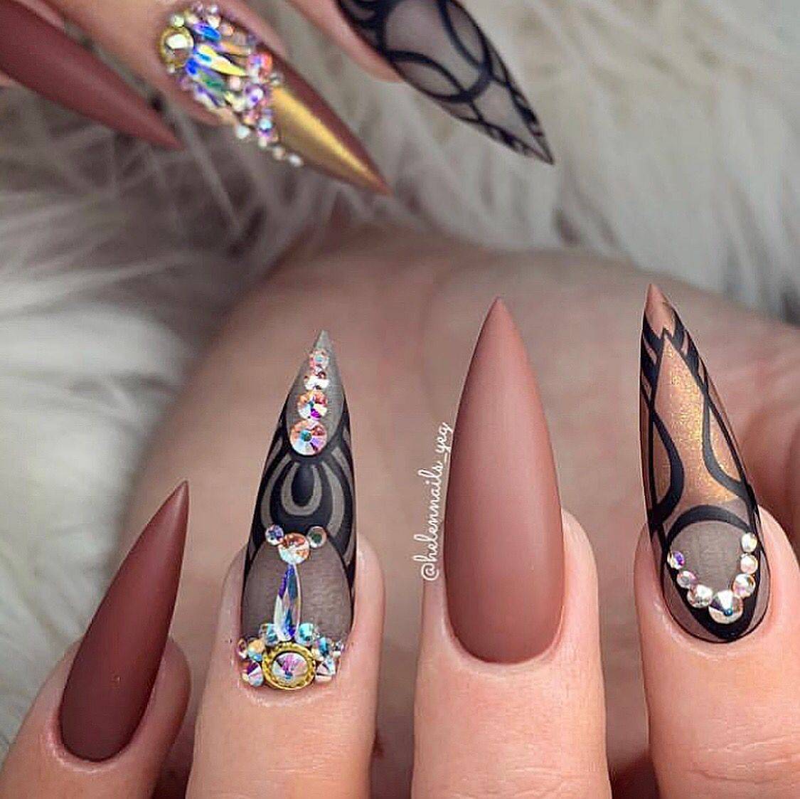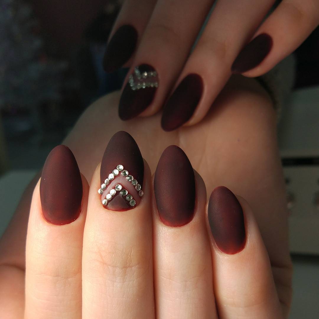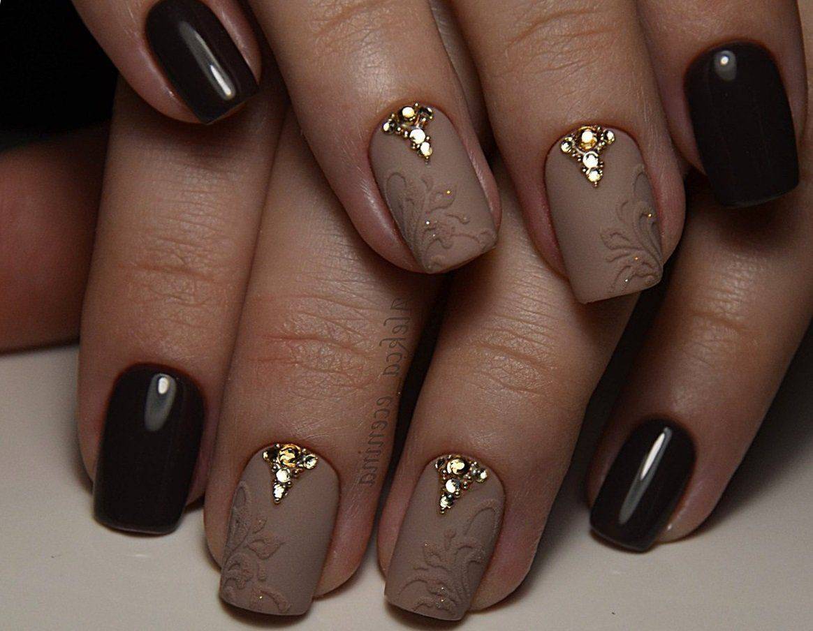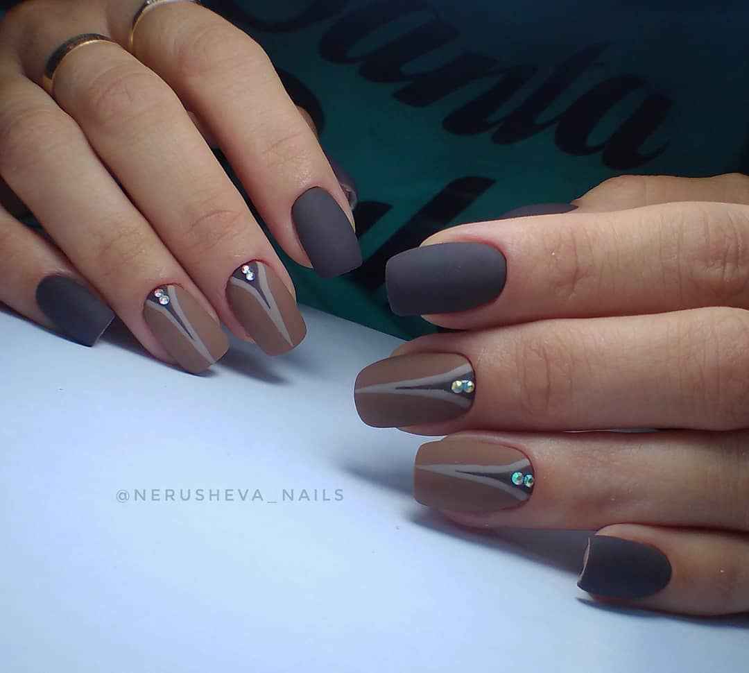 Шикарно смотрится однотонный коричневый маникюр с черными камнями в прикорневой зоне. Дизайн выглядит несложно, но и не банально. Такой маникюр делает ноготки изящными и утонченными.