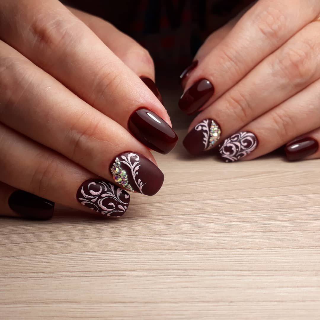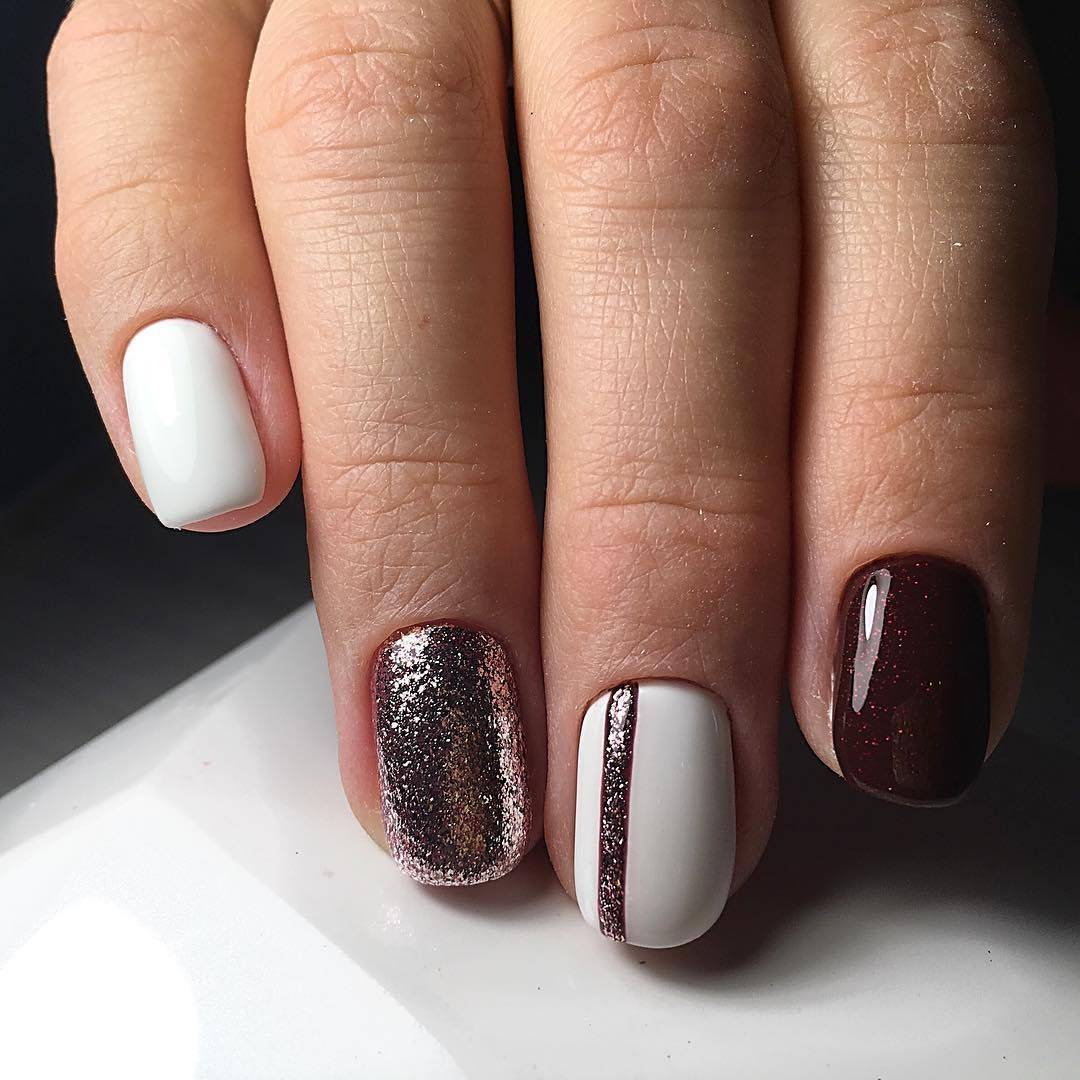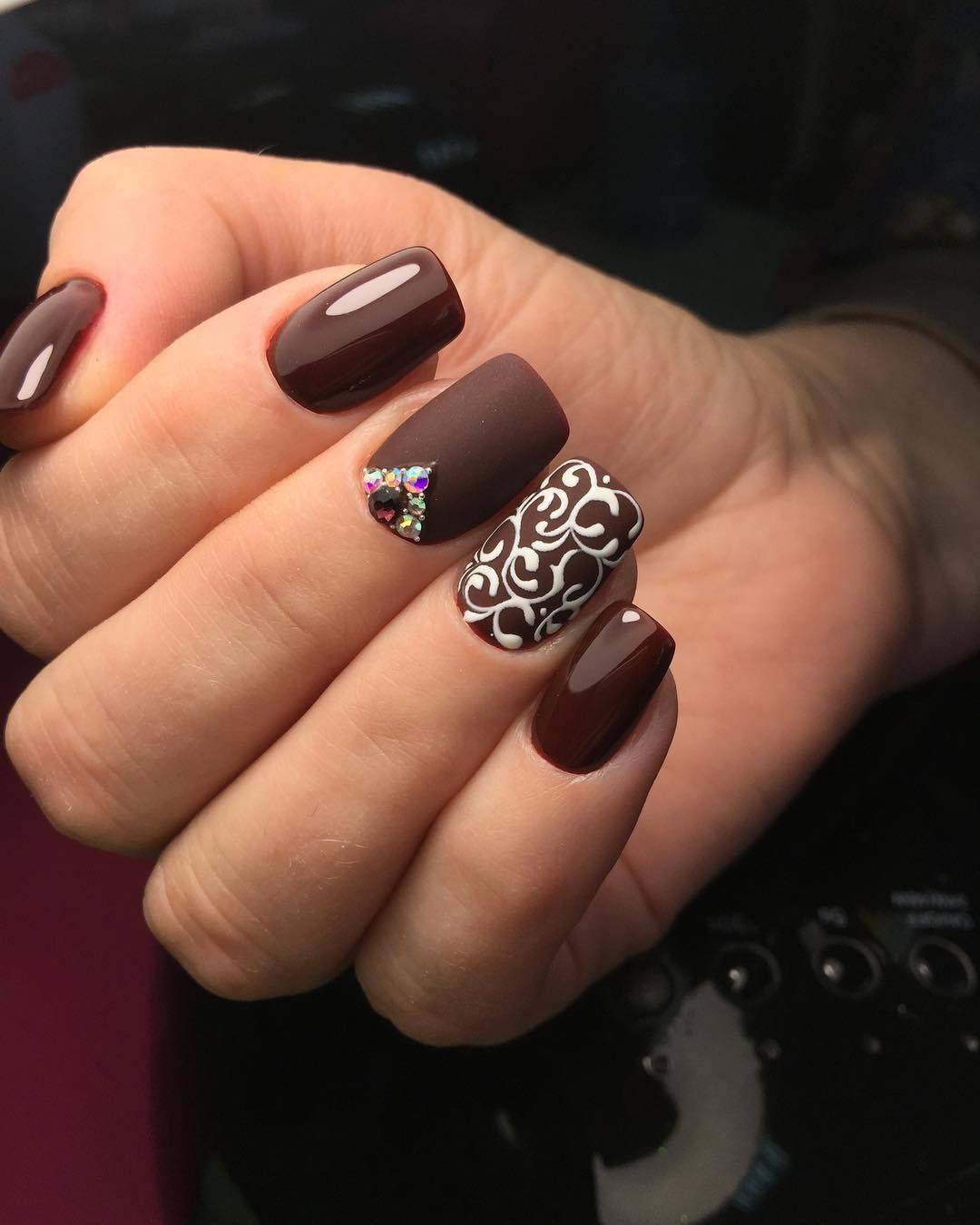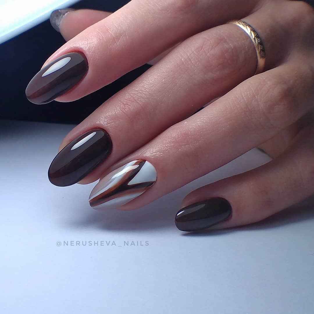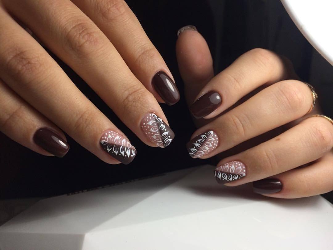 Коричневый цвет прекрасно сочетается с белым цветом. В таком дизайне маникюра коричневый цвет является доминантным. Белым цветом выделяют один или несколько ноготков. Отличным примером такого маникюра будет дизайн, когда безымянный пальчик покрывают прозрачной основой и на ней прорисовывают вензеля белого цвета. При этом остальные ноготки покрывают коричневым цветом, вензелями украшают лишь зону лунулы. Омбре тоже смотрится бесподобно.