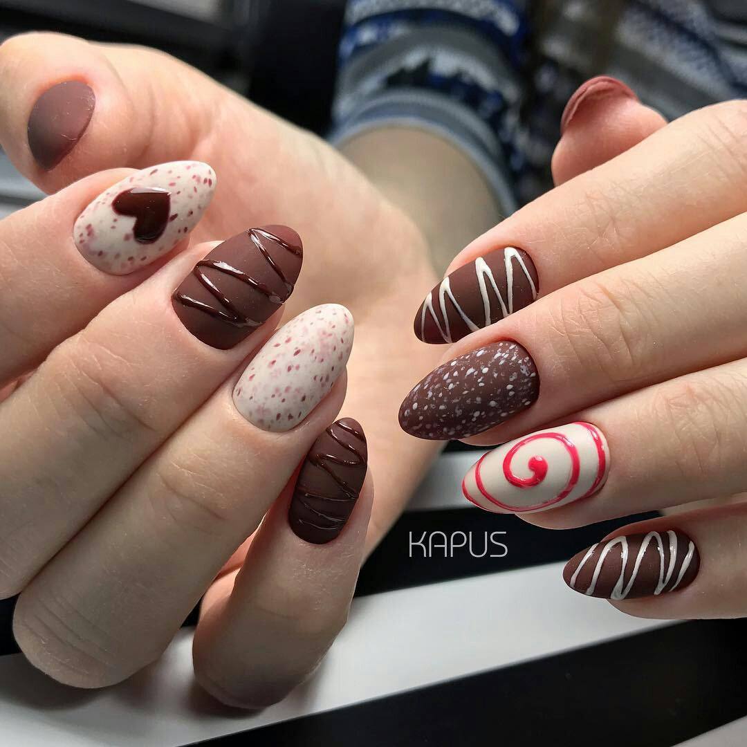 На коричневой основе мастера нейл-арта создают большое количество различных рисунков. Это могут быть как популярные геометрические мотивы и «шоколадные» абстракции, так и не менее популярные рисунки в растительной тематике в виде цветов, а также рисунки с мультяшными героями.