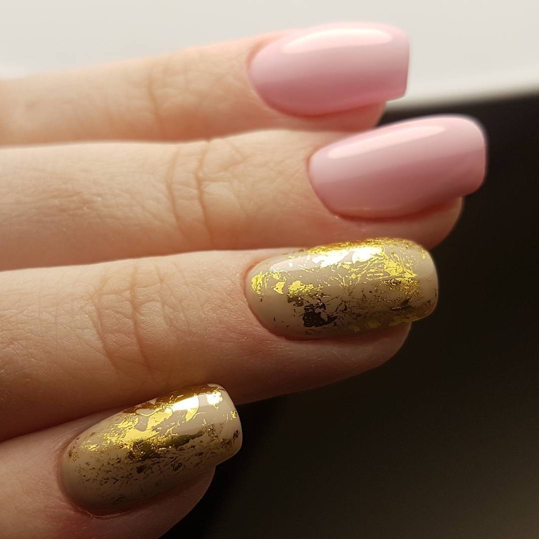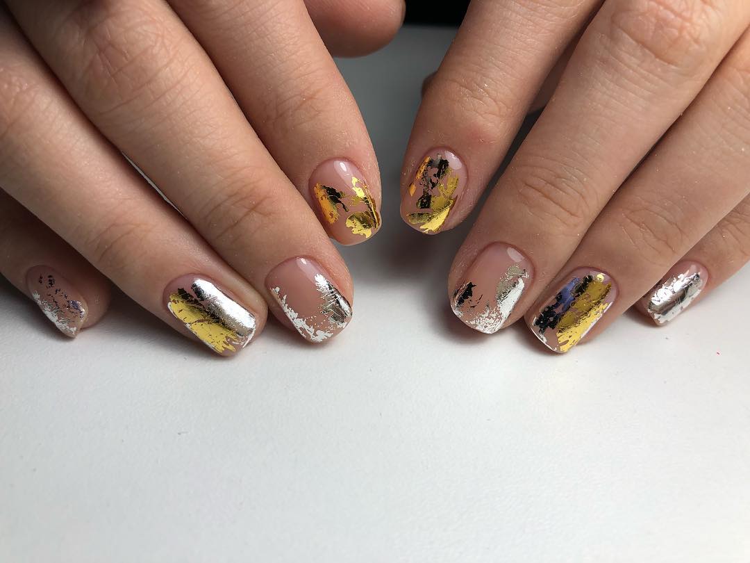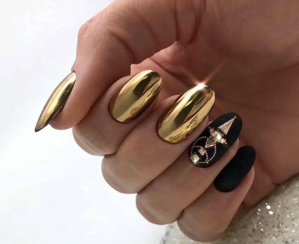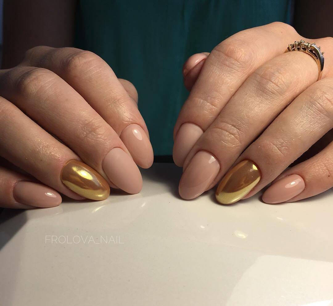 Это новый вид ногтевого дизайна, который заключается в нанесении на гель-лак с липким слоем специального металлизированного пигмента. Обычно при оформлении ногтей золотом декорируется один или два ноготка.