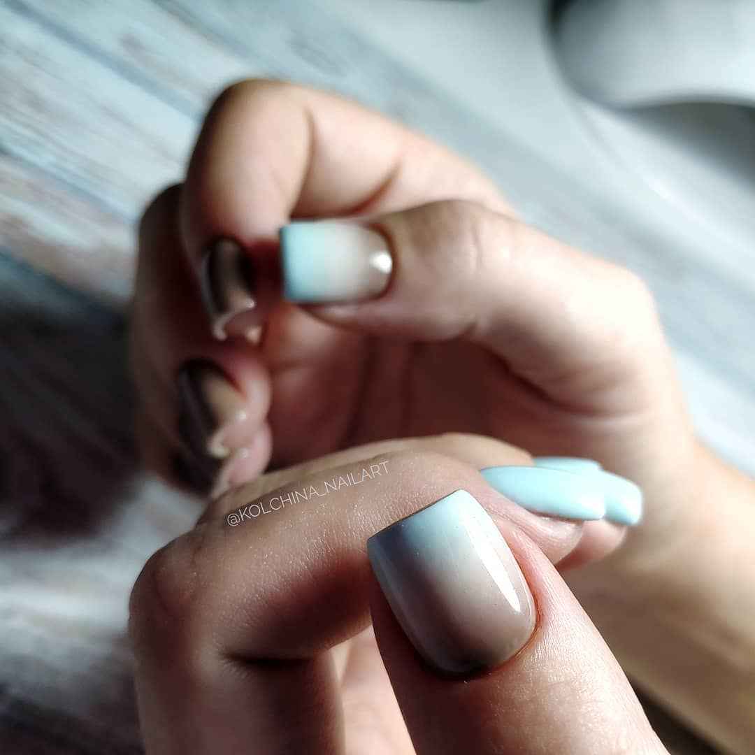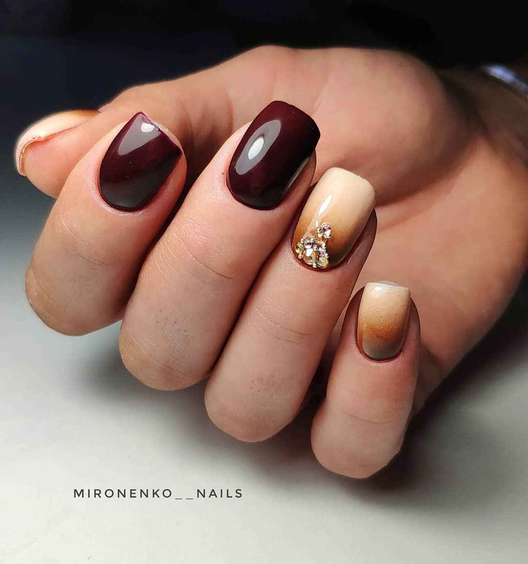 Еще одна популярная в этом году технология нанесения покрытия, в которой сочетаются сразу несколько тонов лака. Комбинировать лучше близкие по цветовой гамме оттенки. Примеры осеннего маникюра, выполненные градиентом можно увидеть на фото.