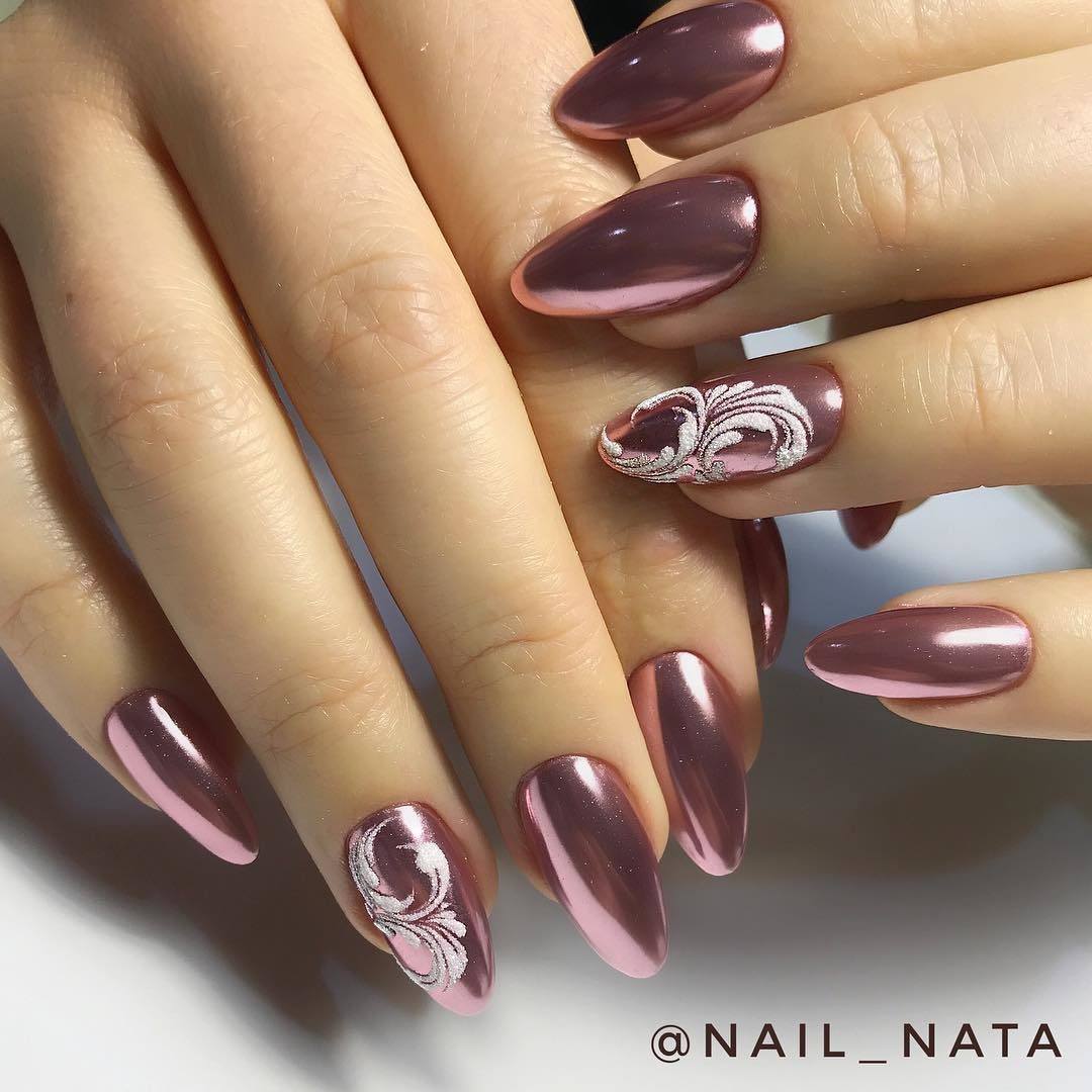 Коричневый маникюр с втиркой создает просто шикарный и сногсшибательный эффект. С помощью втирки на коричневом фоне получается яркий и изящный дизайн.