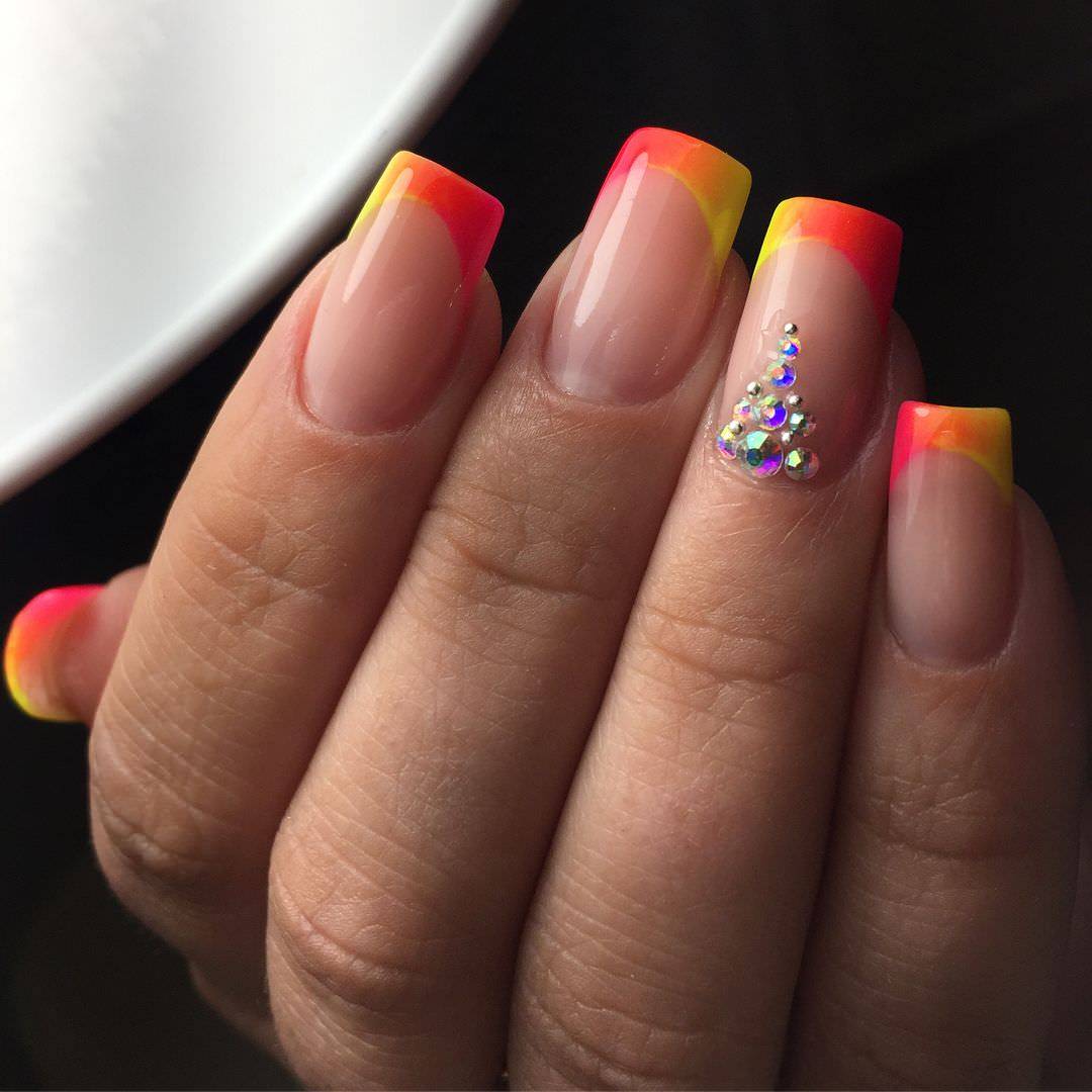Цветной френч – отличная идея для весеннего и летнего образа. В цветном френче край ногтя выделен любым цветным гель-лаком или сразу несколькими оттенками, выполненными в градиентной технике.