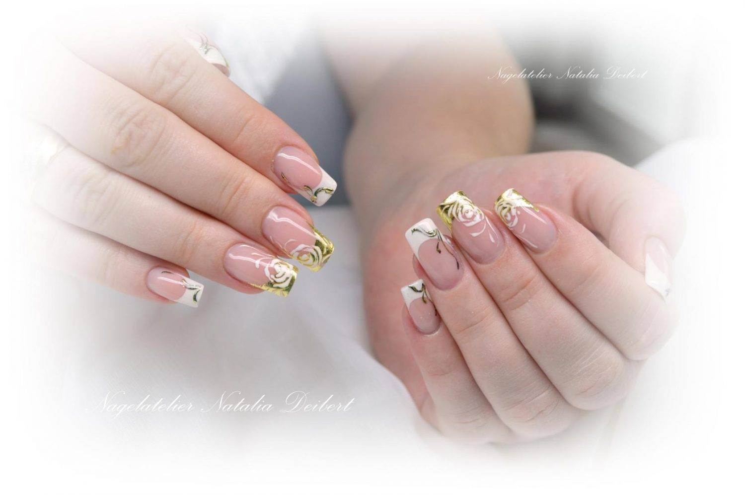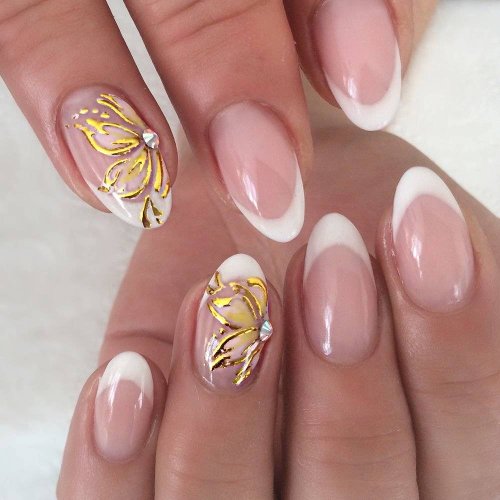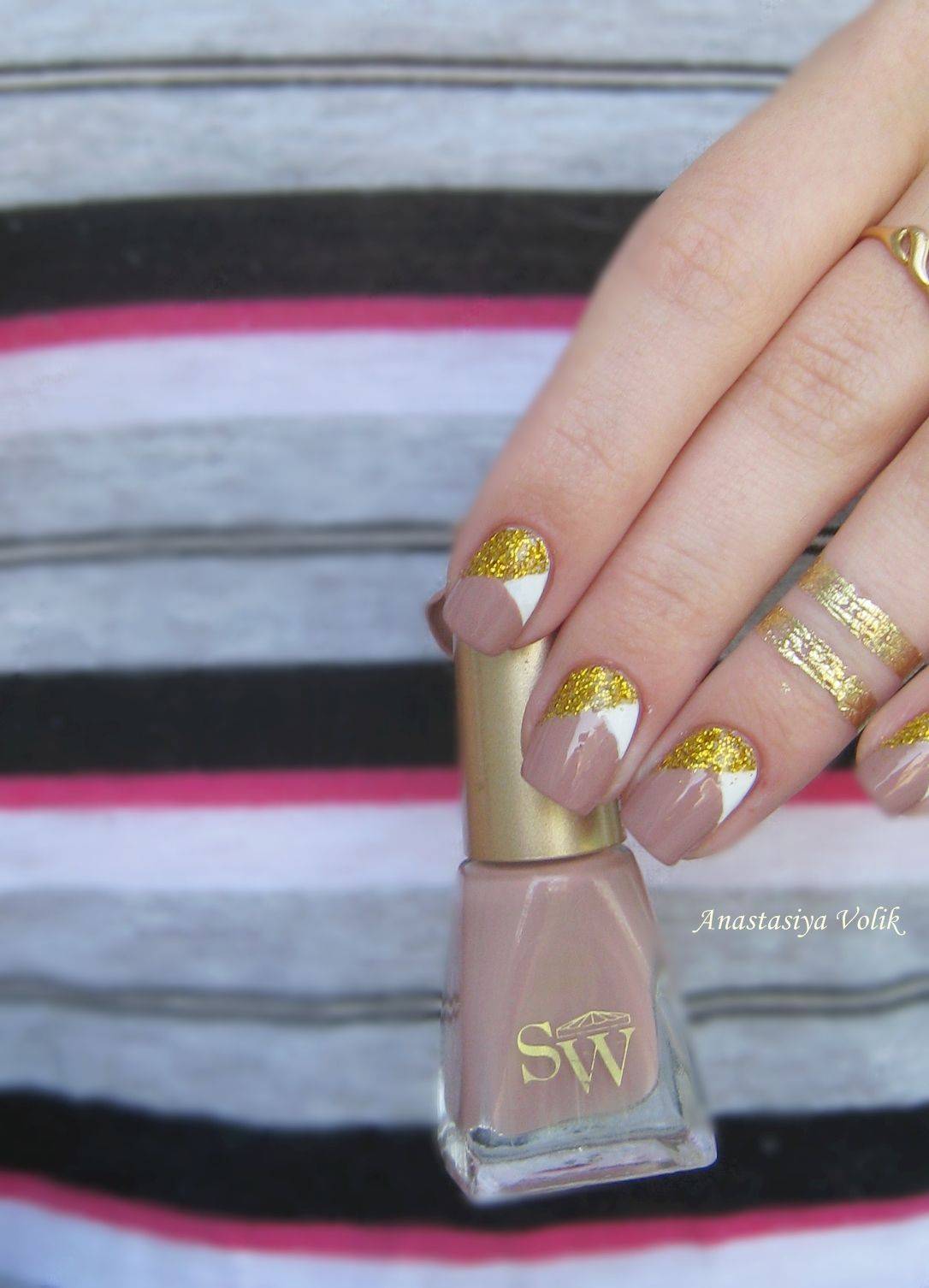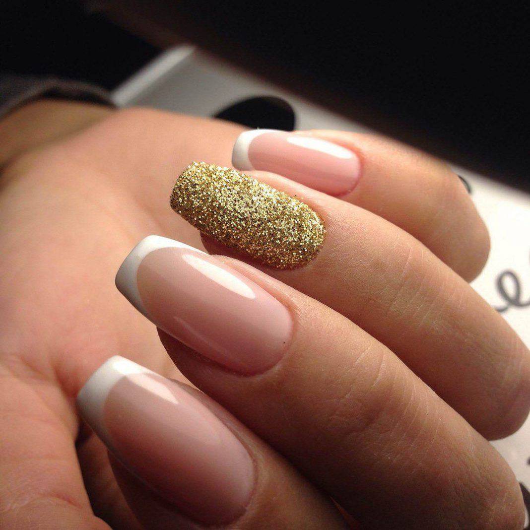 Для более строго стиля подойдет маникюр белый с золотым. Технически выполняется, как стандартный френч.