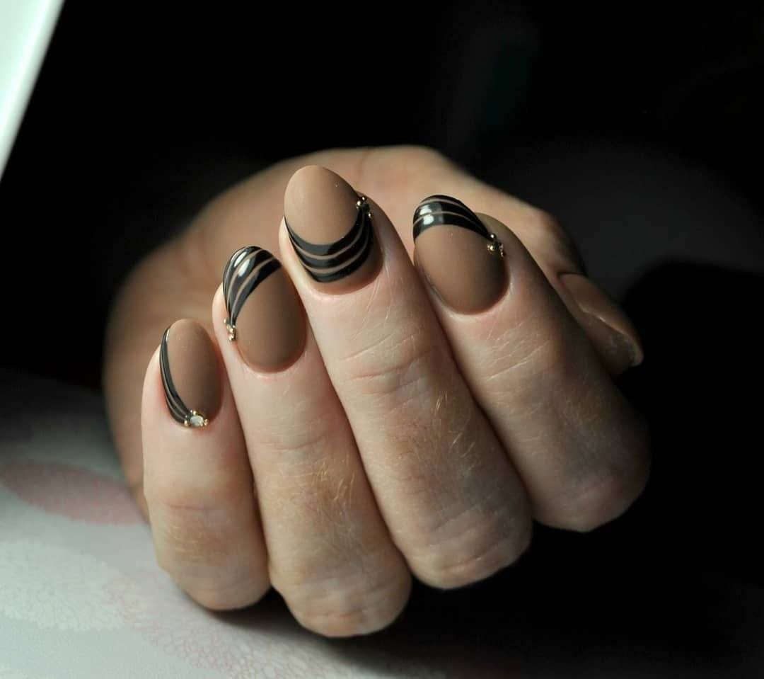 Черный и коричневый цвета в одном нейл-арте смотрятся очень благородно и сдержанно. Такой маникюр выдает в своей обладательнице тонкую натуру, которая уверена в своих решениях. Ведь не каждая девушка решится выполнить маникюр в столь выразительных и заметных оттенках.