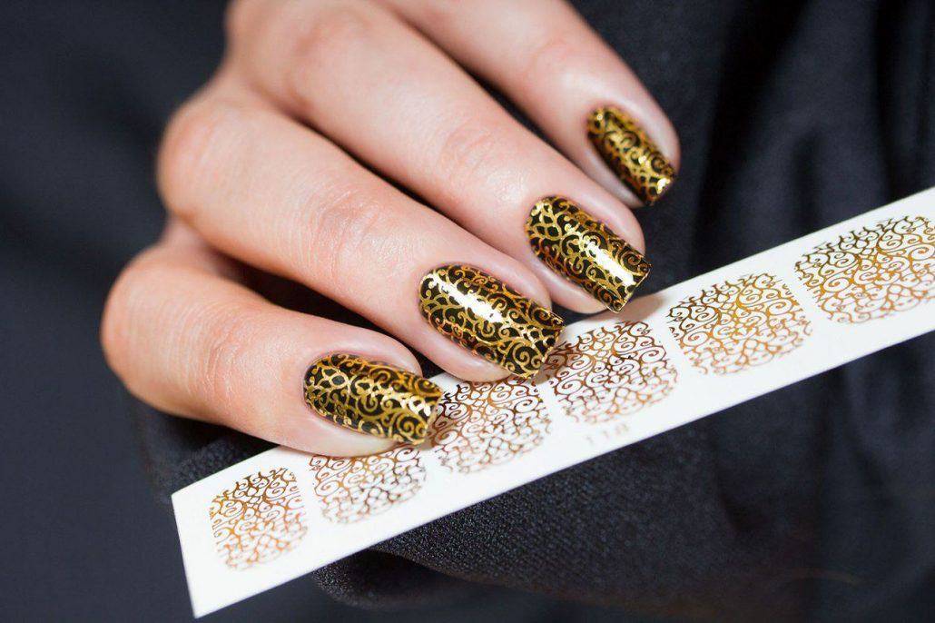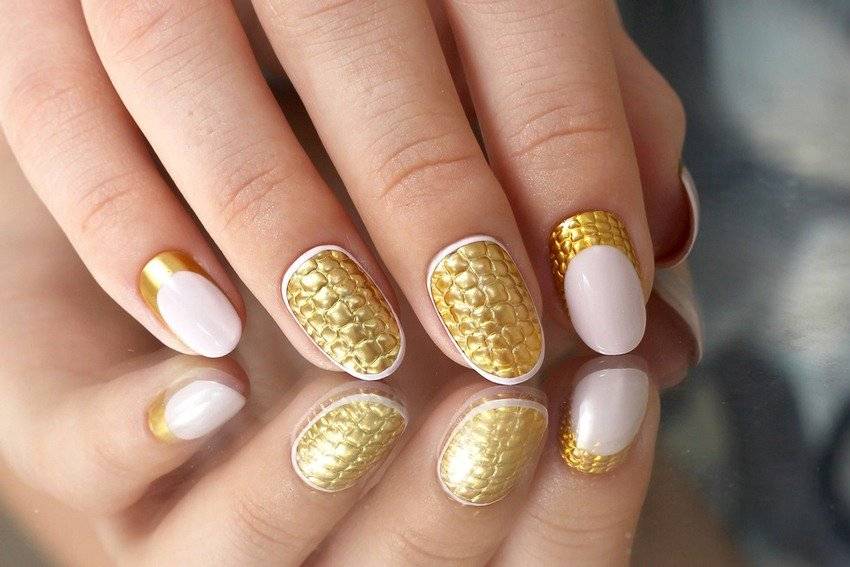 Золотой маникюр при помощи фольги – это яркий и неординарный способ украсить свои ноготочки. В этом случае применяется специальная фольга, которая может быть: тисненой, листовой, стикеры и термо – фольга. Идеи для создания маникюра с фольгой можно черпать из Интернета. Это могут быть горизонтальные полоски, французский или лунный маникюр, какой-то абстрактный узор и многое другое.