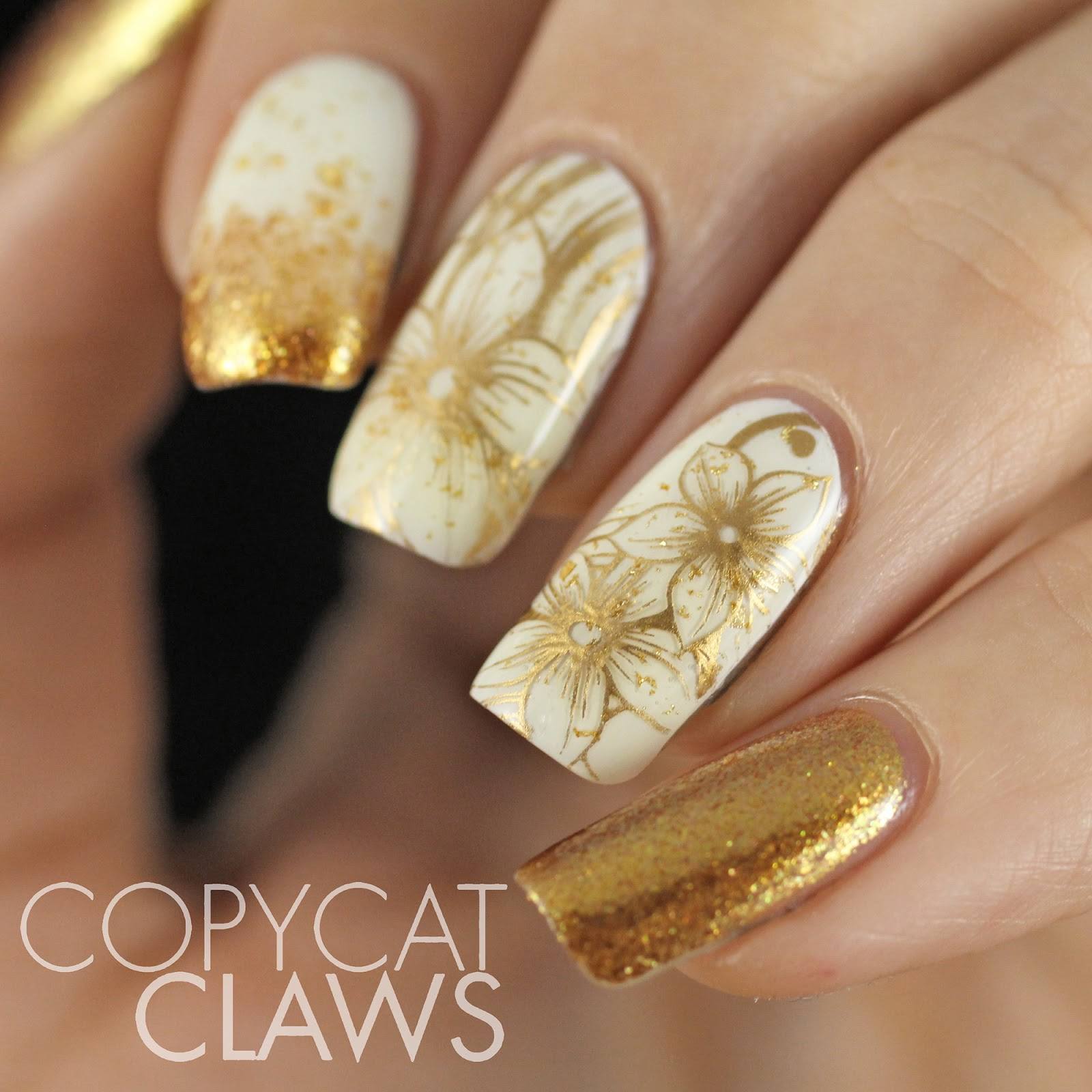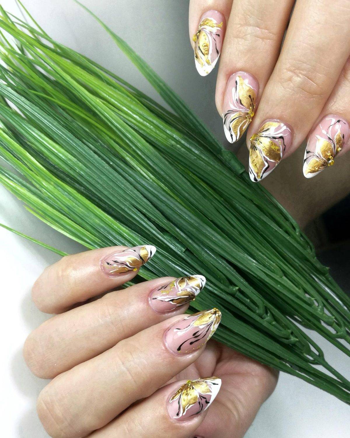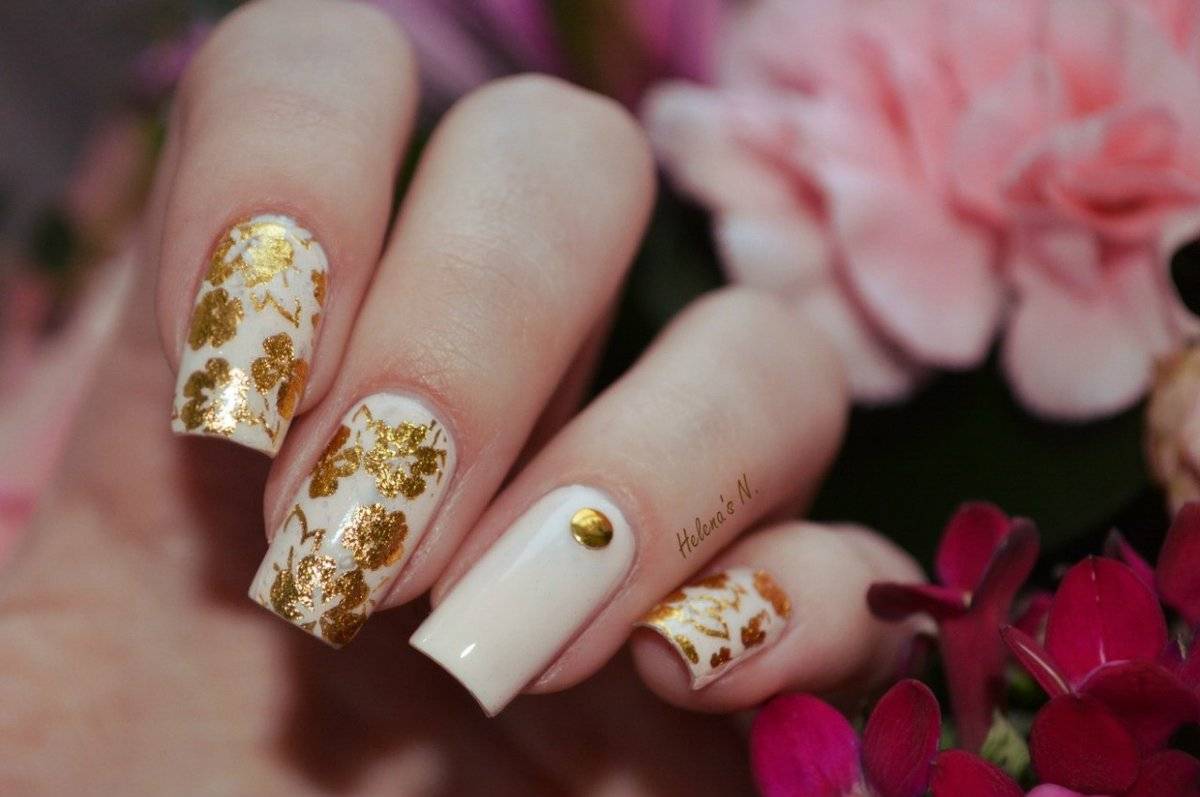 Чтоб маникюр выглядел интересно и необычно, просто необходимо использовать дополнения в виде рисунков. В последнее время возросла популярность нанесения флористических рисунков в золотом цвете. Золотые цветов выглядит красиво и восхитительно, именно поэтому данный дизайн так нравится модницам. Можете смело сочетать такие рисунки с любыми модными техниками маникюра.