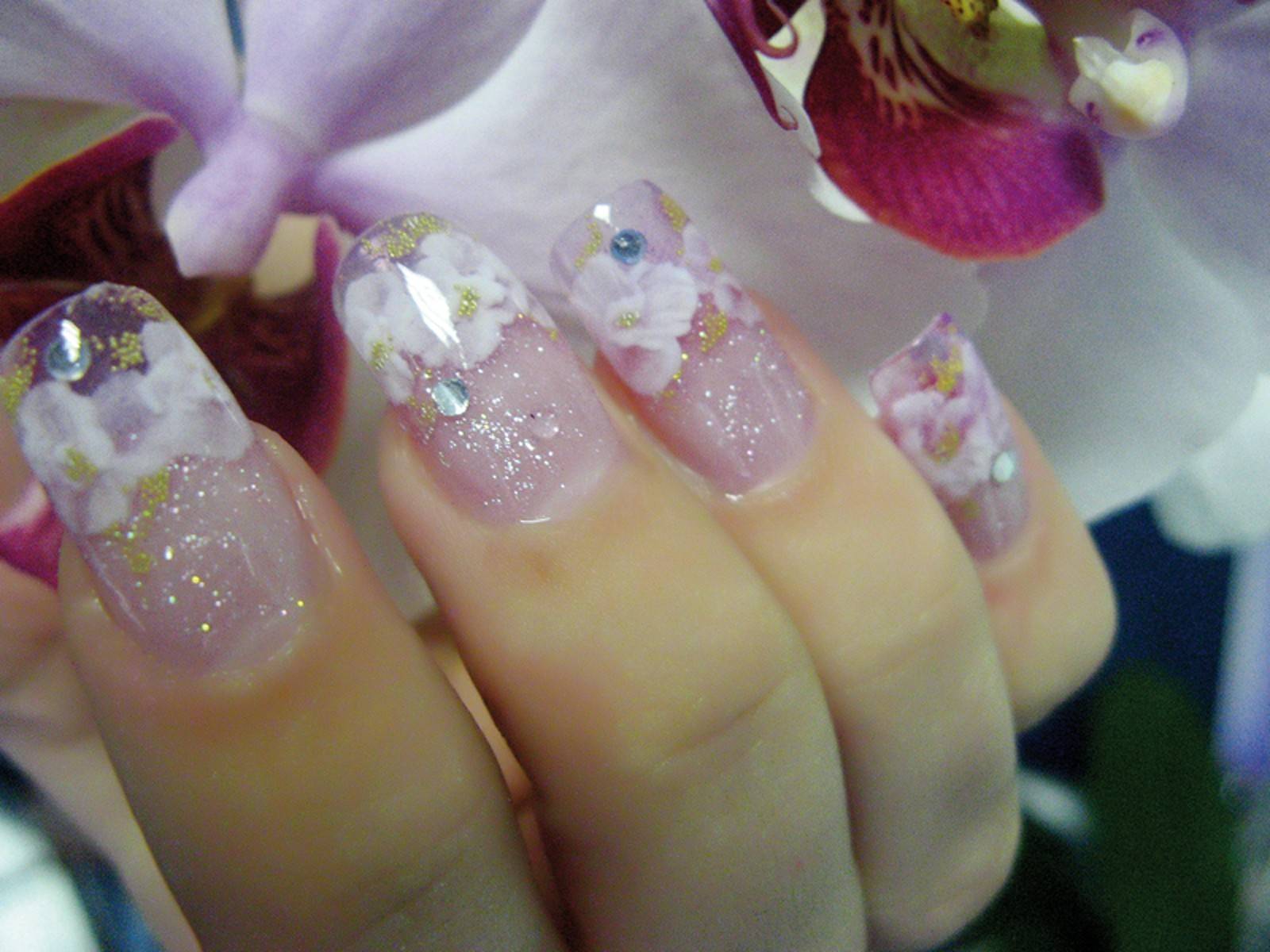 Прекрасные и утонченные цветочки, выполненные золотым глиттером, выглядят роскошно и изящно. Такой узор лучше всего наносить на основе контрастного цвета. Очень привлекательно и обворожительно выглядят переливающиеся цветочные рисунки на матовой поверхности. Чтоб рисунок выделялся, можно выполнить окантовку лаком контрастного цвета.