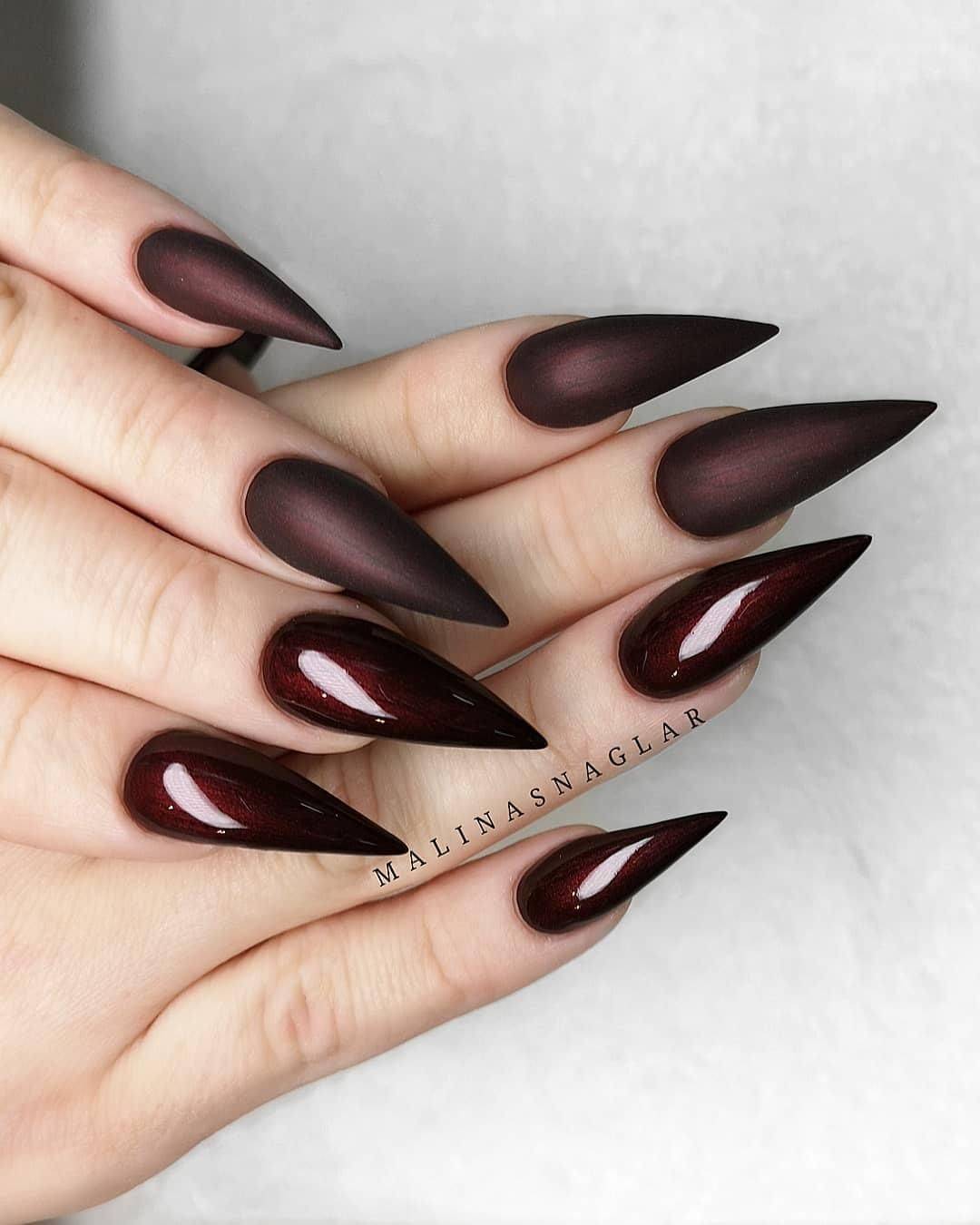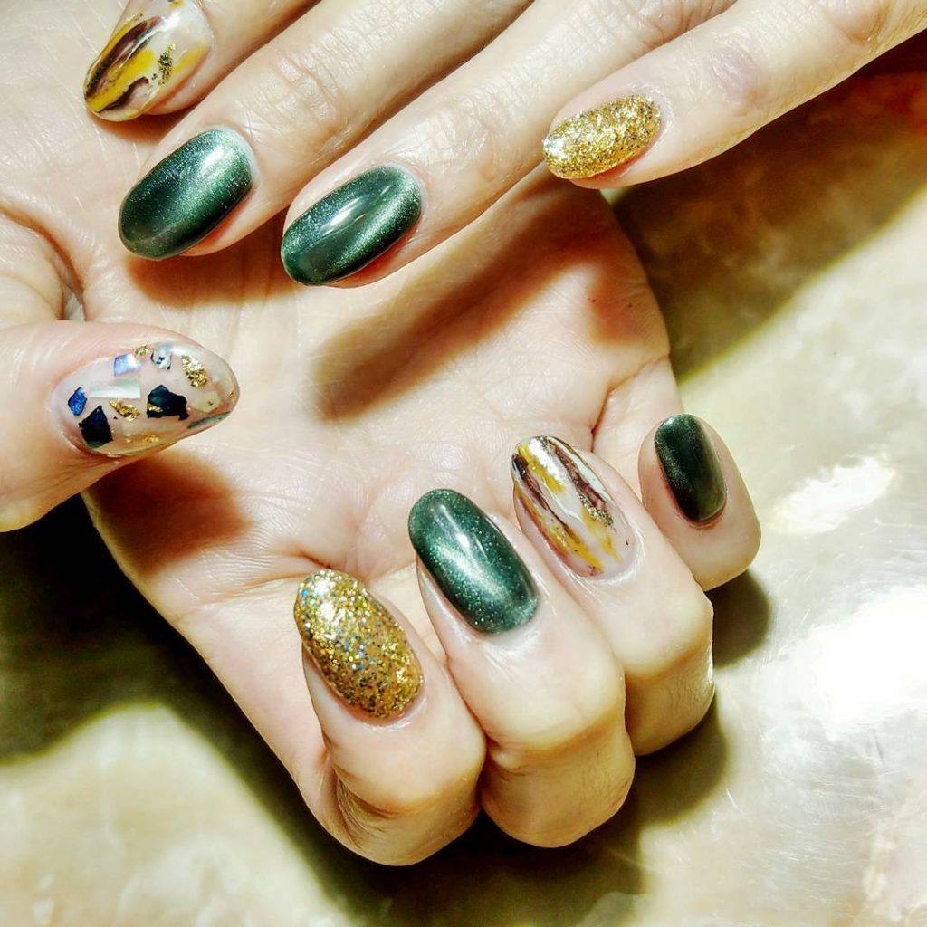 - окрашивание нескольких ноготков при помощи техники кошачий глаз, при этом остальные ноготки выполняются матовой или глянцевой структурой.