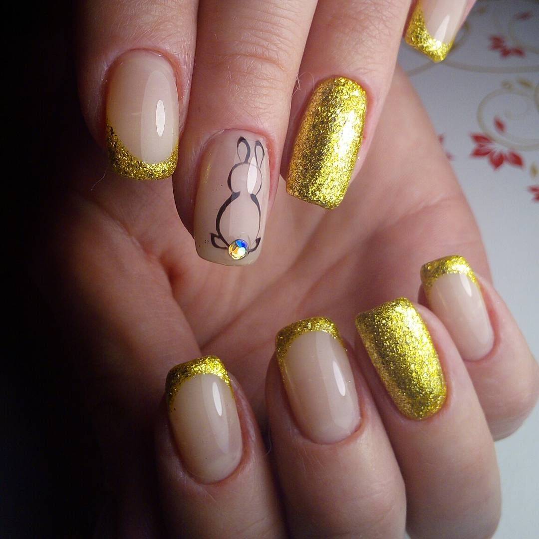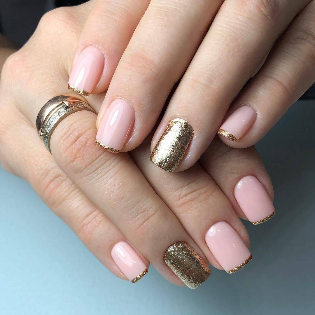 Как уже говорилось выше, золотой цвет в маникюре пользуется завидной популярностью. Его используют не только для однотонного покрытия, но и более оригинального оформления с дизайном. Классический френч с золотым акцентом – изумительное решение для вечернего выхода. К тому же, столь яркий дизайн визуально преображает классику и делает ее более актуальной.
