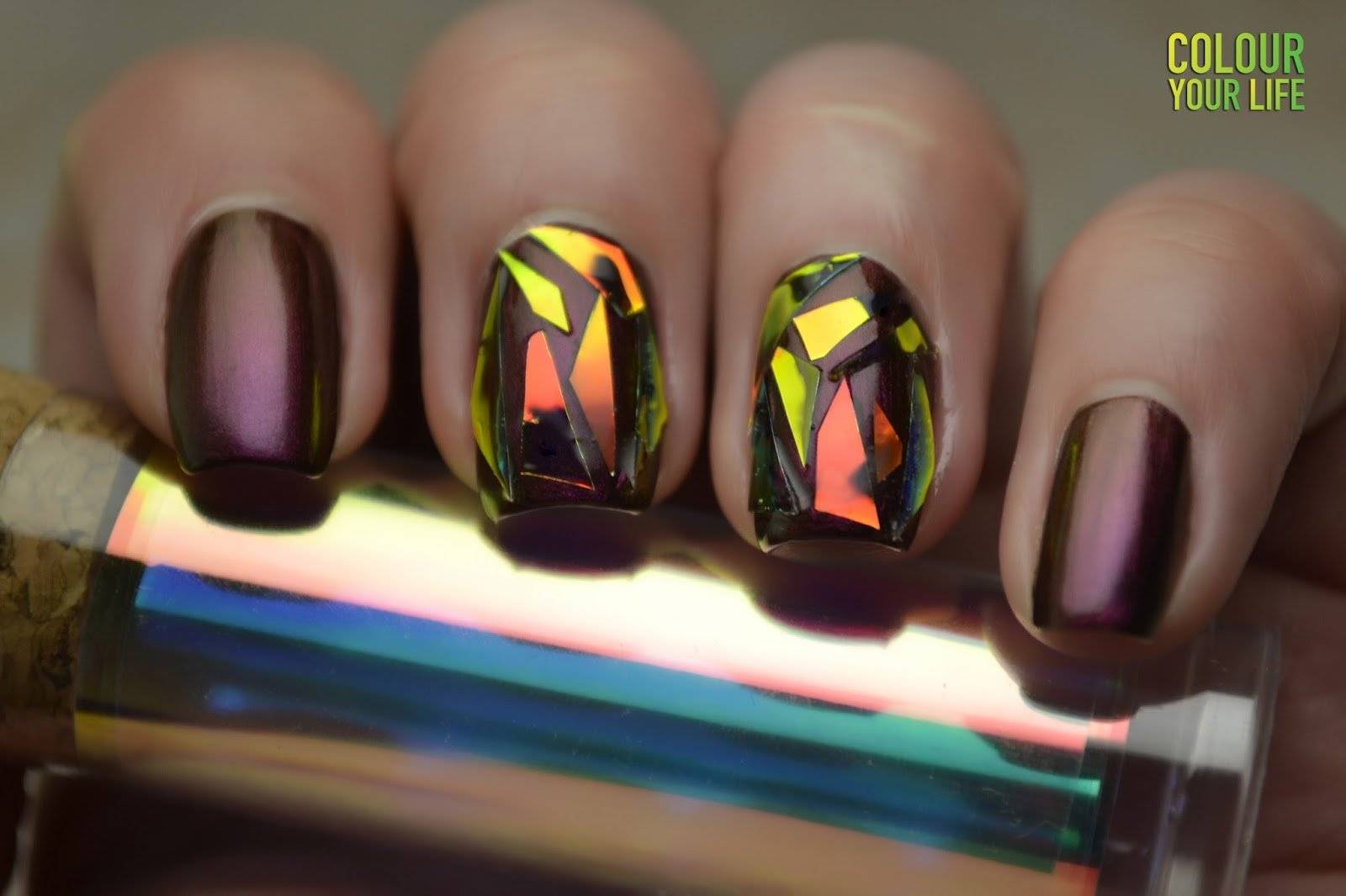 «Битое стекло» — это техника декора, которая применяется для разнообразия коричневой палитры. Броский и необычный дизайн создается с помощью беспорядочного расположения кусочков фольги.