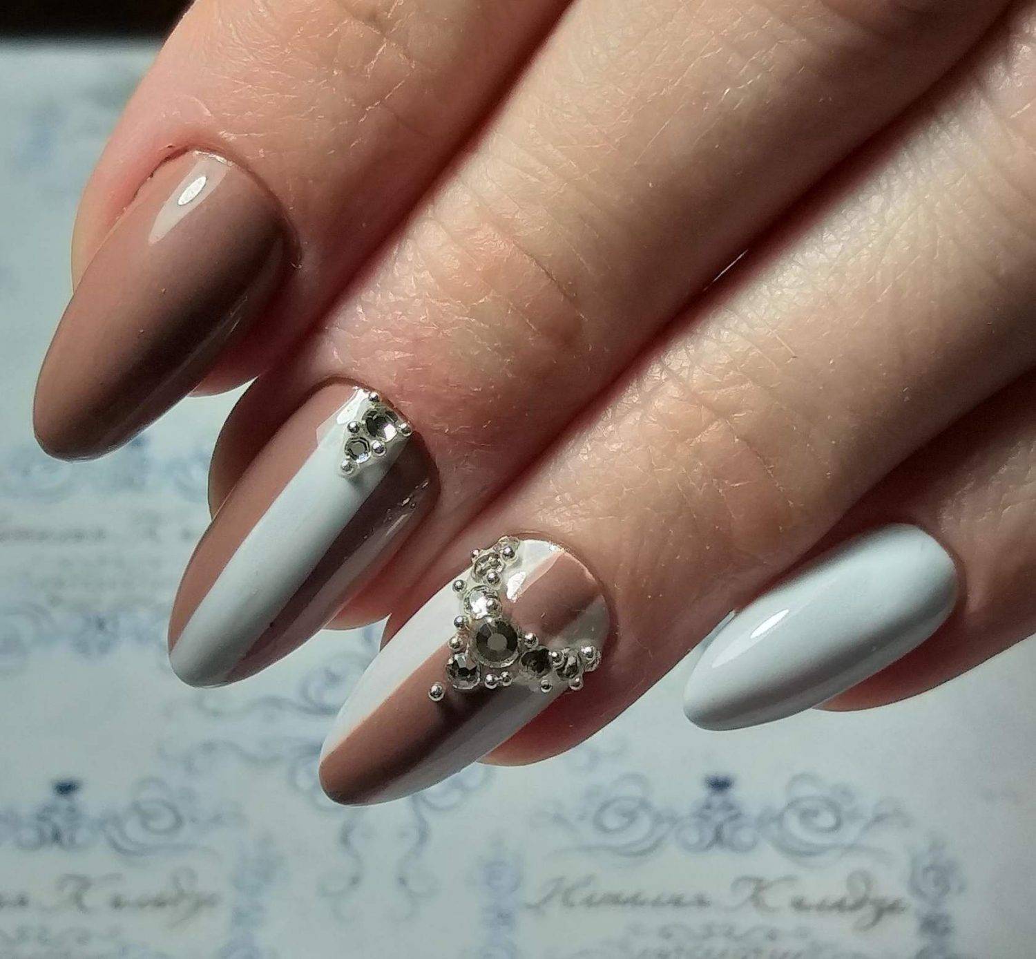 Очень часто модницы выбирают лунный маникюр. Нежным коричневым цветом выделяют зону лунулы. А еще, покрыв весь ноготь любым коричневым оттенком, зону луны оставляют неокрашенной. Дополняют такой маникюр стразами, которые выкладывают вдоль перехода цветов.