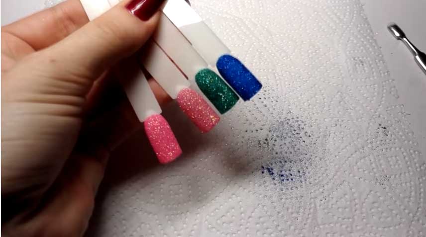 На гель-лак, тонким слоем, при помощи кисточки, нанести акриловую пудру с блестками, равномерно распределить по поверхности ногтя. Дать подсохнуть. В зависимости от величины песчинок, таким образом, можно придать ногтям эффект «сахара» или «бархата».