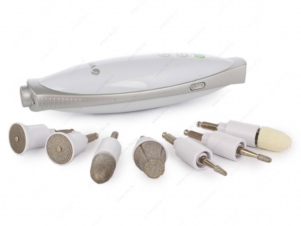 Прибор содержит сапфировый конус, который помогает справляться с сухой и огрубевшей кожей. Благодаря наличию войлочного конуса удается сглаживать и полировать края ногтей. Также с помощью этого инструмента эффективно очищается ногтевая пластина. Кроме того, в составе имеется мелкозернистый и крупнозернистый сапфировый диск, насадки для шлифовки и фрезы.