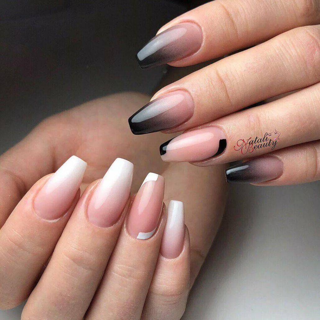 Для создания градиентного френча можно использовать молочный, белый и многие контрастные тёмные и светлые цвета. Дизайнеры предлагают оформлять плавные переходы непосредственно на кончике ноготка, формируя при этом яркую и красочную улыбку или непосредственно растягивать оттенки на всём основании, оригинально выделяя при этом лунулу или улыбку. Вертикальные переходы красиво смотрятся при оформлении техники градиент на кончике ноготка с прозрачным основанием. Горизонтальные переходы помогут выделить характерные для френча участки в примере полного окрашивания ногтевой пластины.