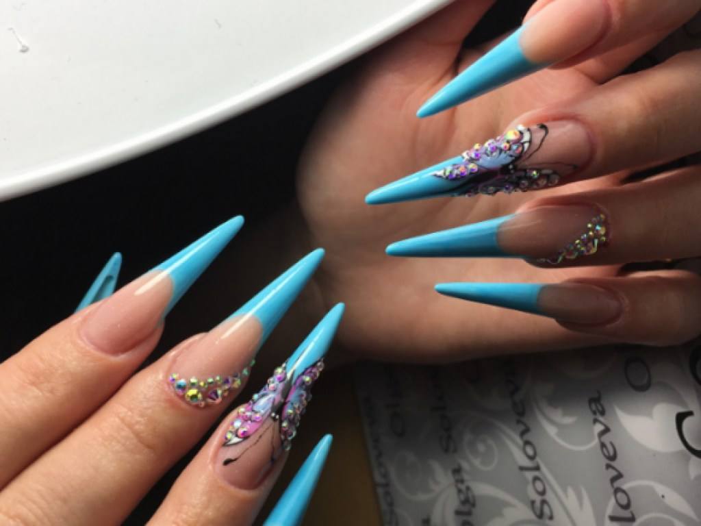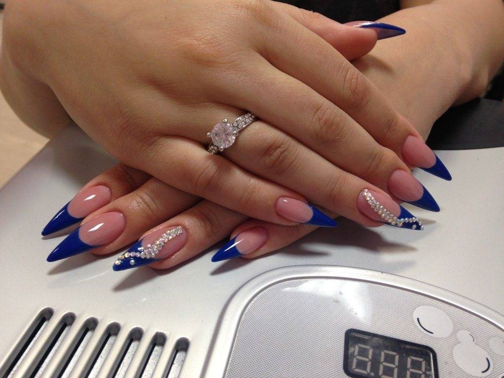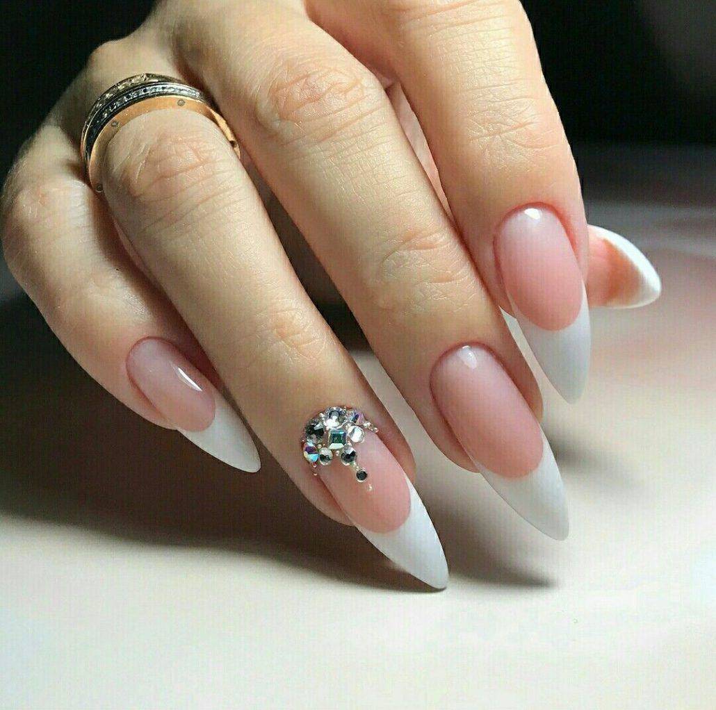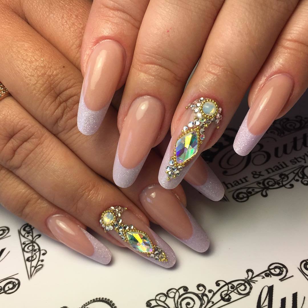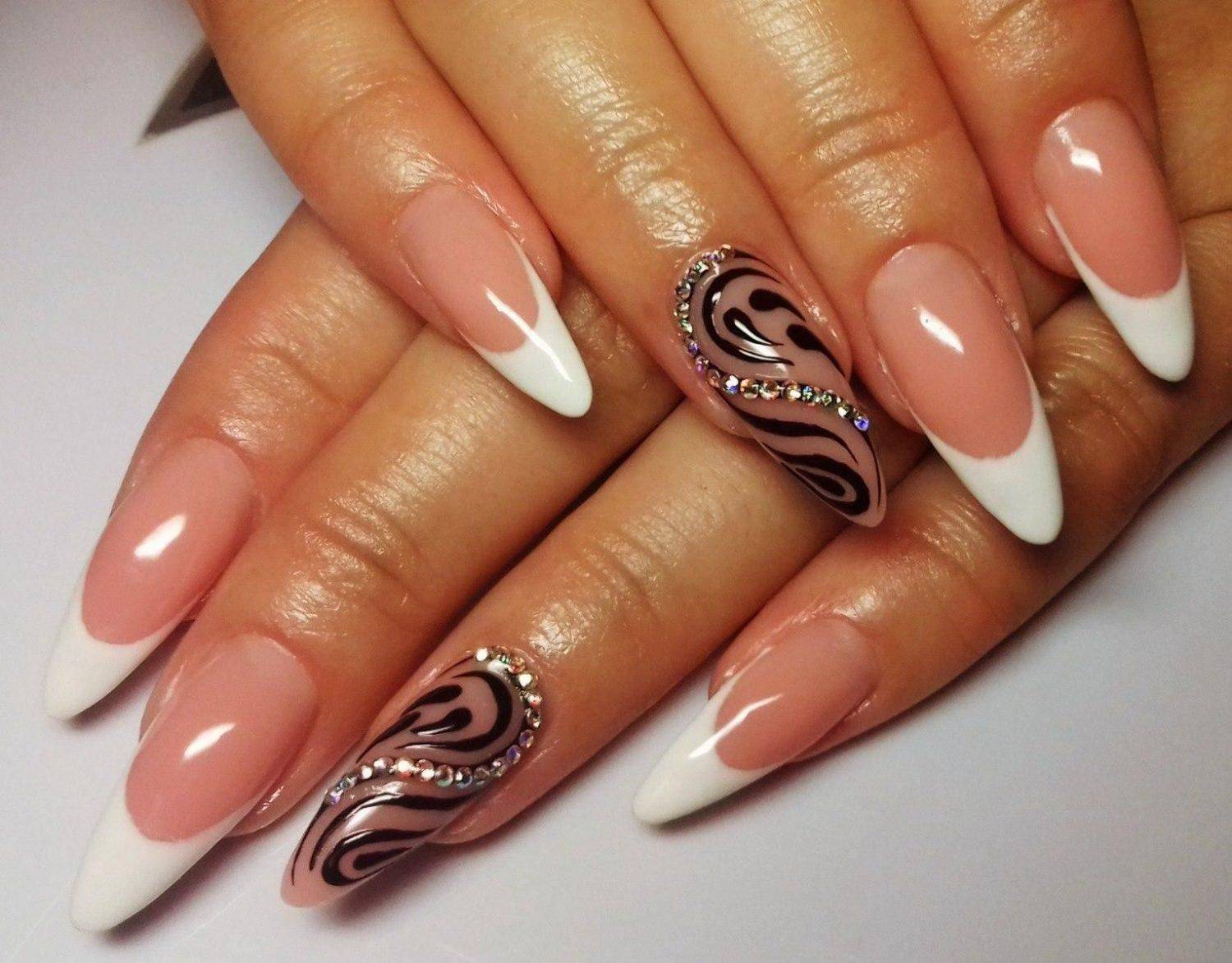 Длинные острые ноготки с френчем выглядят очень красиво, ярко. Тем не менее, даже такой маникюр часто украшают различными декоративными деталями. К примеру, стразы, бусины и блестки делают оформление еще более праздничным. Поэтому такой вариант пользуется популярностью для мероприятий и различных вечеринок