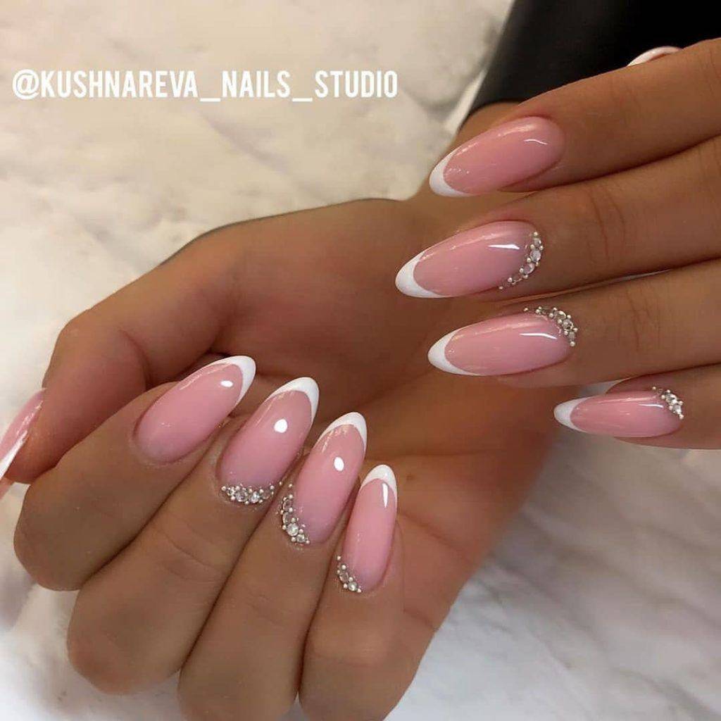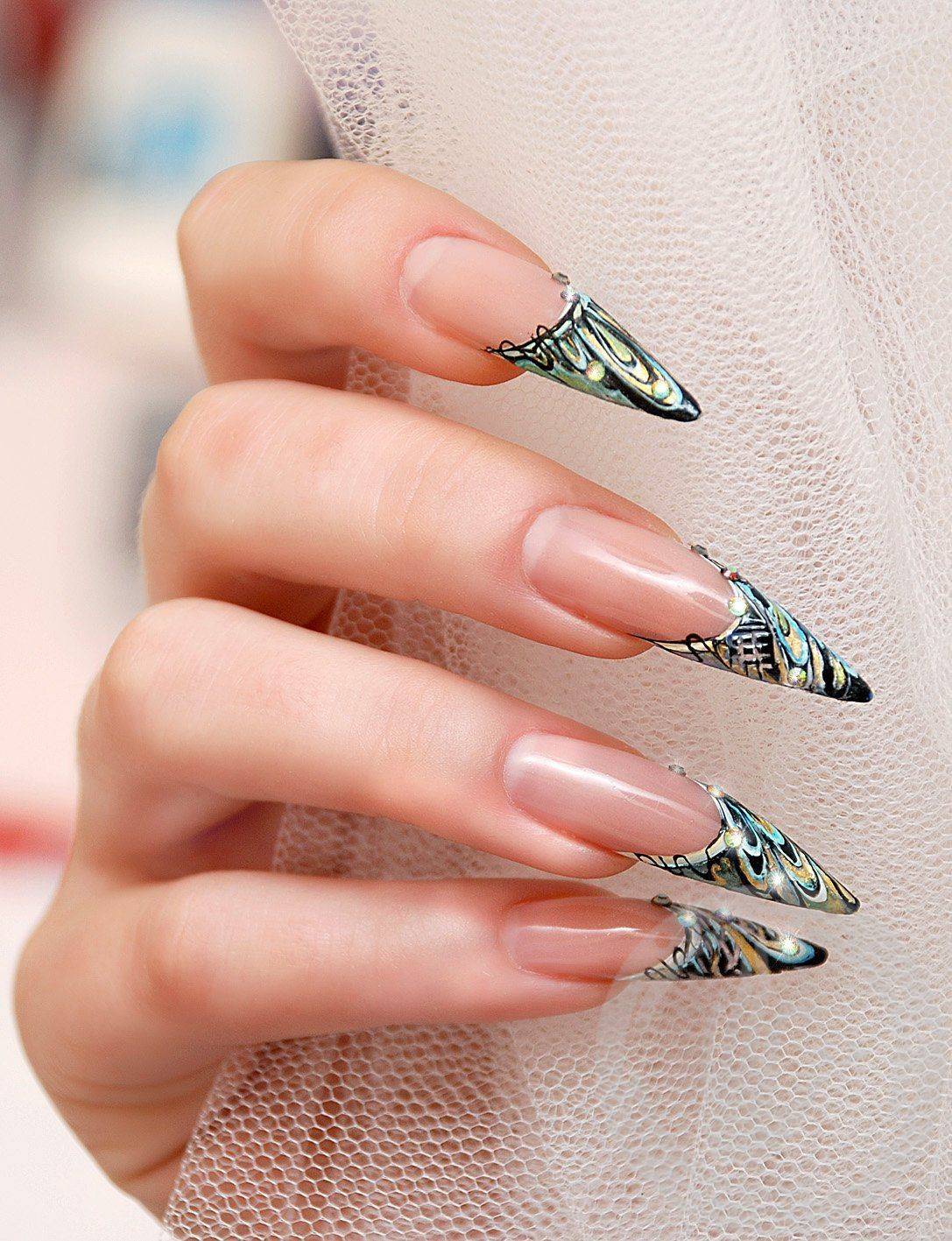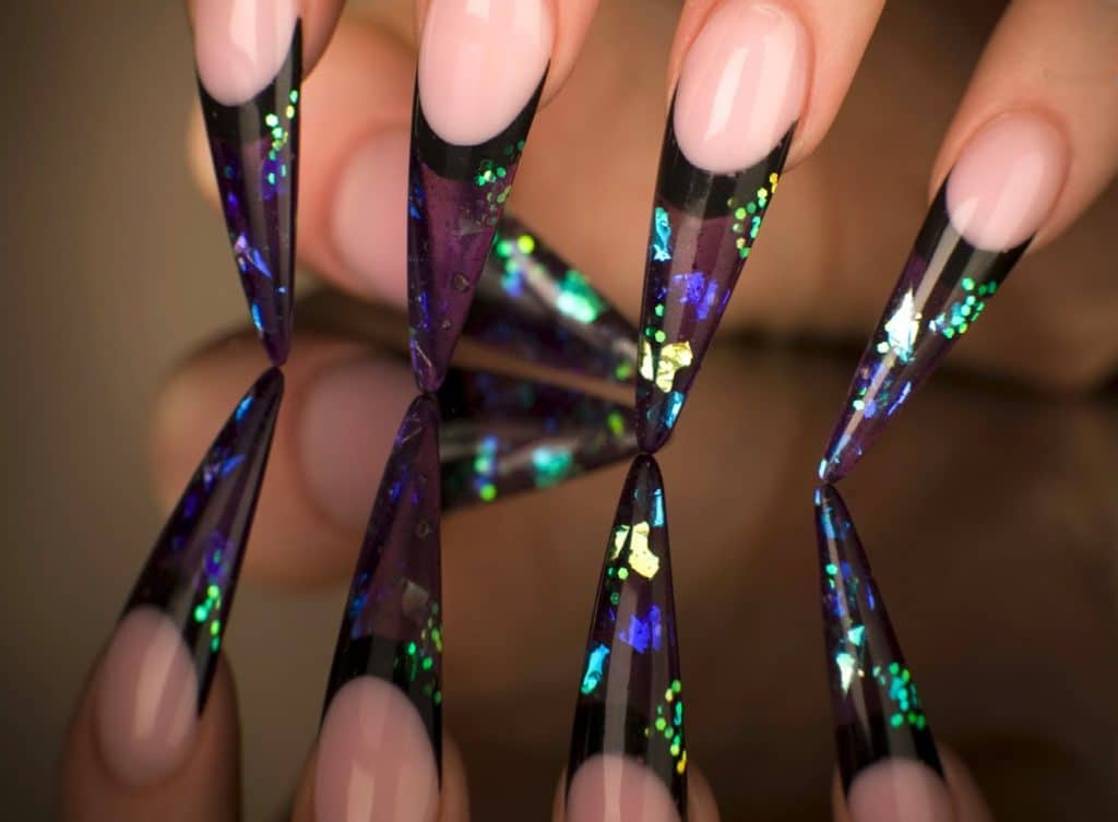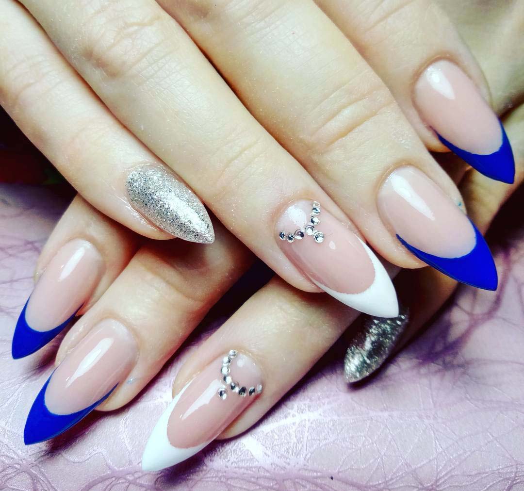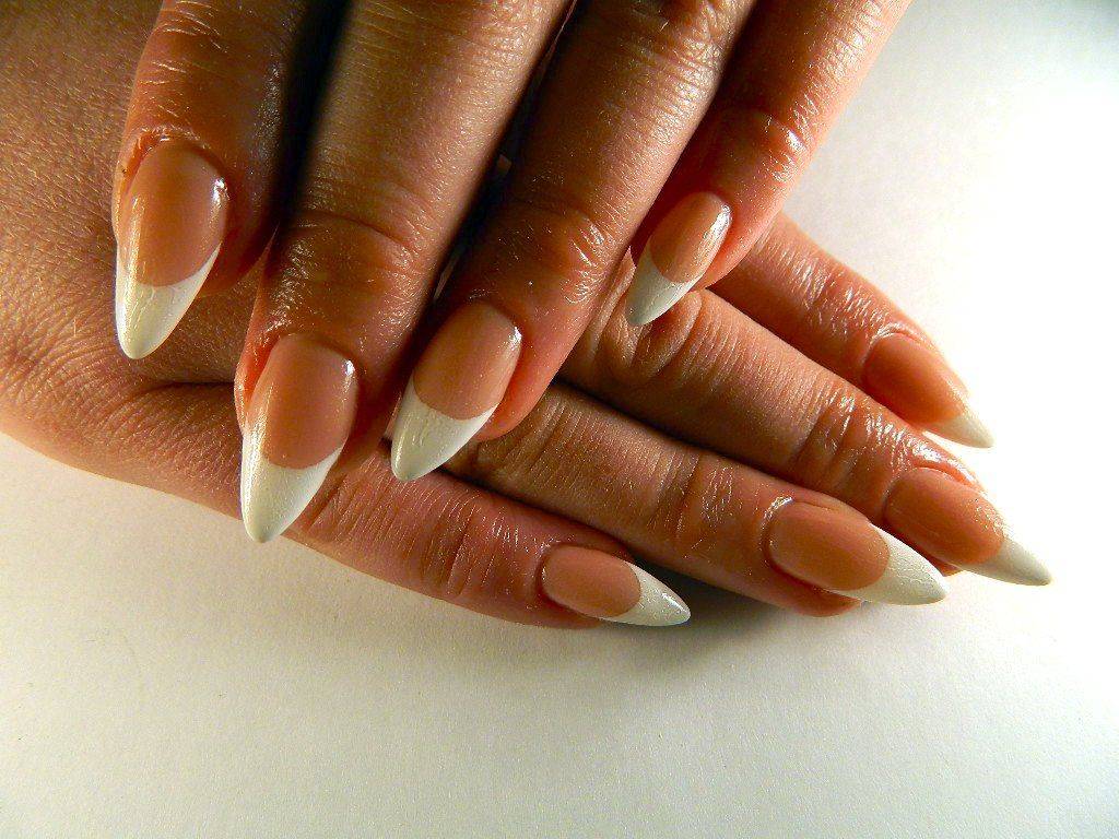 Длинные острые ноготки с френчем выглядят очень красиво, ярко. Тем не менее, даже такой маникюр часто украшают различными декоративными деталями. К примеру, стразы, бусины и блестки делают оформление еще более праздничным. Поэтому такой вариант пользуется популярностью для мероприятий и различных вечеринок