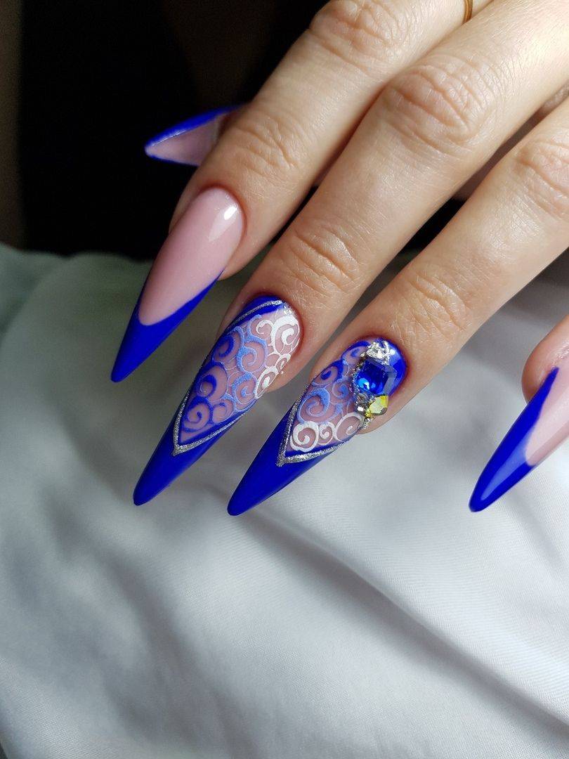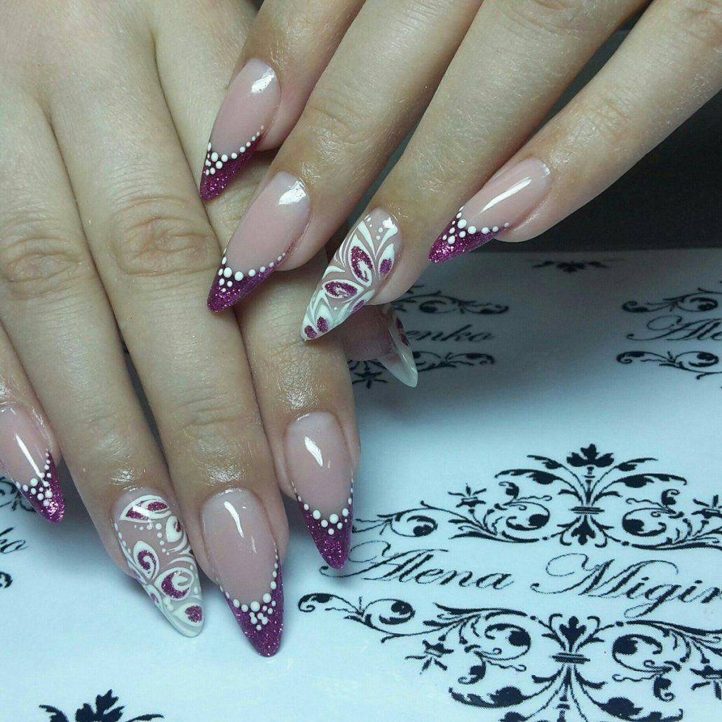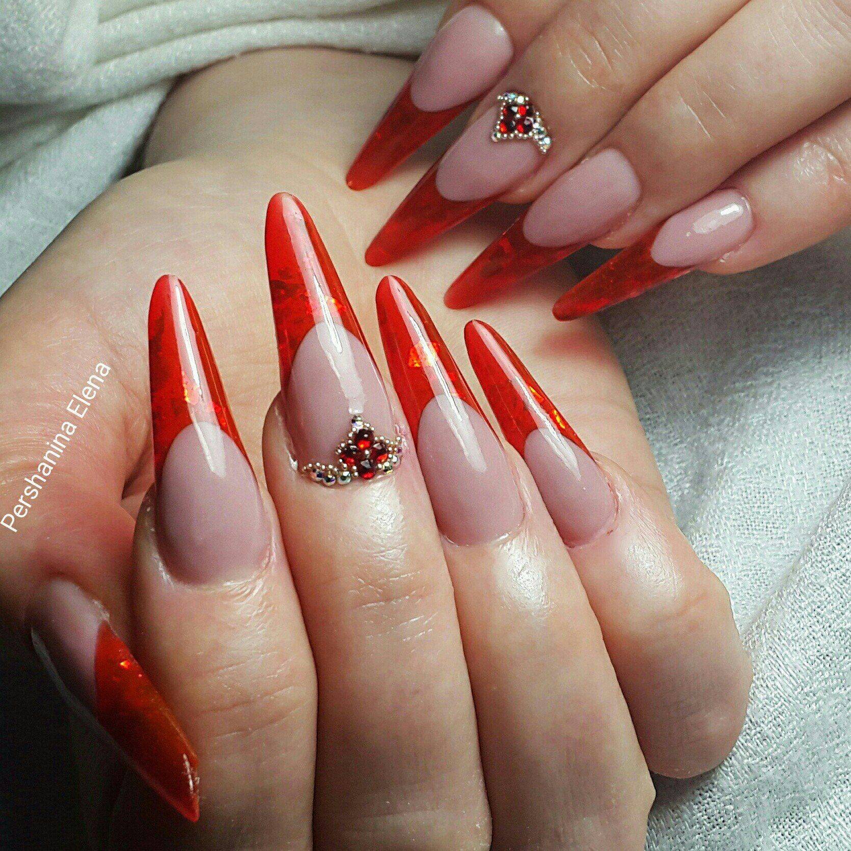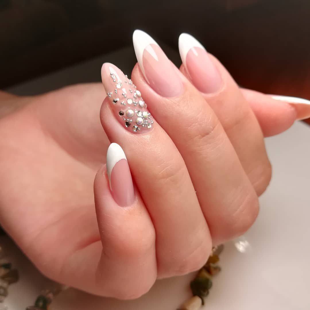 Длинные острые ноготки с френчем выглядят очень красиво, ярко. Тем не менее, даже такой маникюр часто украшают различными декоративными деталями. К примеру, стразы, бусины и блестки делают оформление еще более праздничным. Поэтому такой вариант пользуется популярностью для мероприятий и различных вечеринок