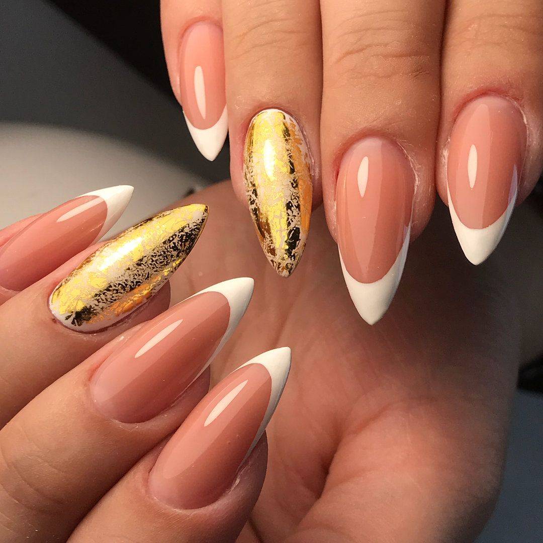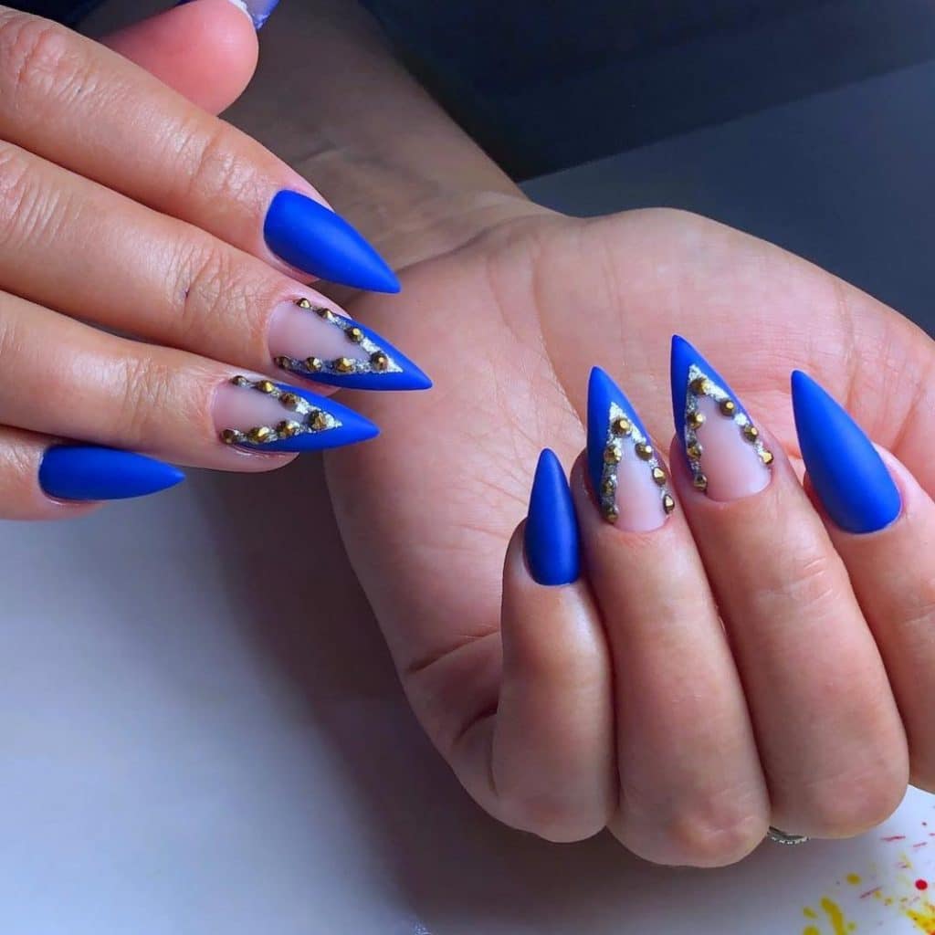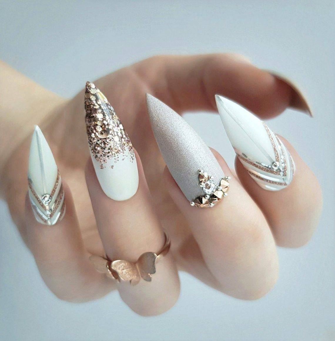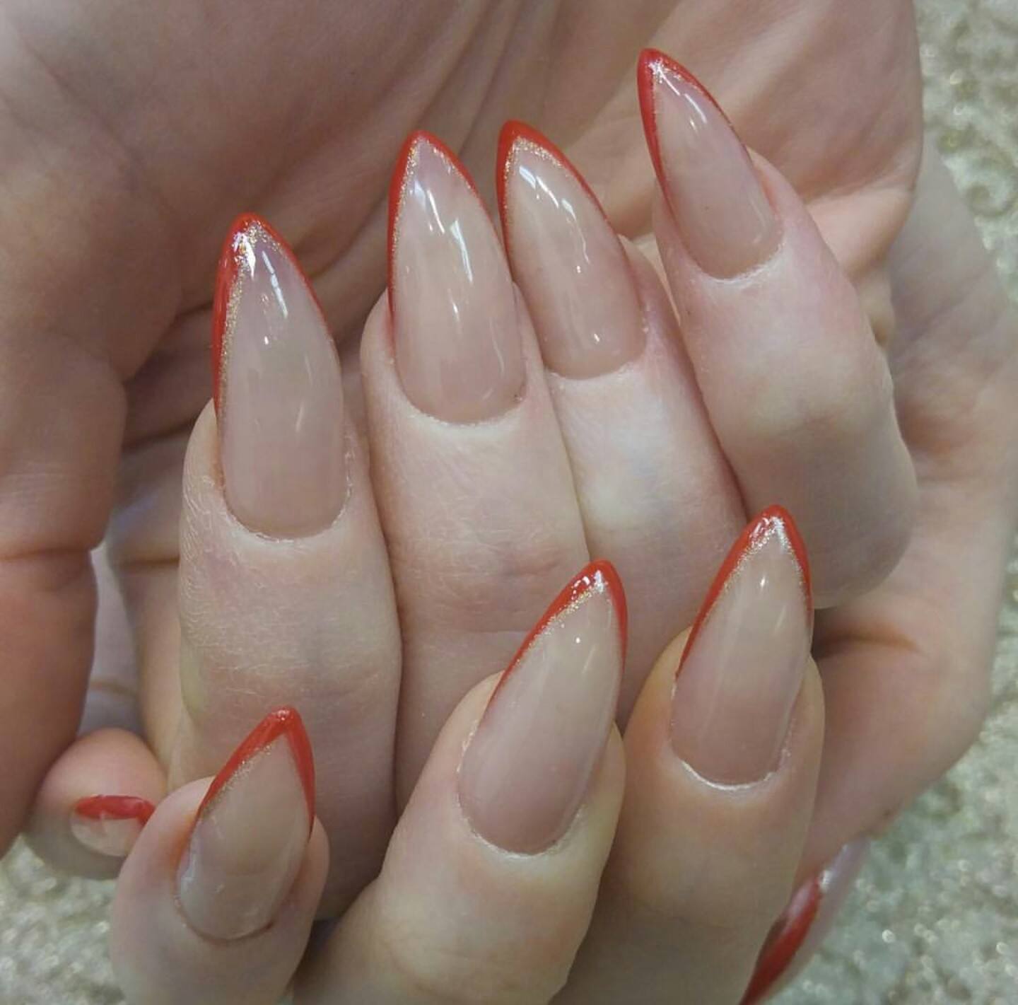 Длинные острые ноготки с френчем выглядят очень красиво, ярко. Тем не менее, даже такой маникюр часто украшают различными декоративными деталями. К примеру, стразы, бусины и блестки делают оформление еще более праздничным. Поэтому такой вариант пользуется популярностью для мероприятий и различных вечеринок